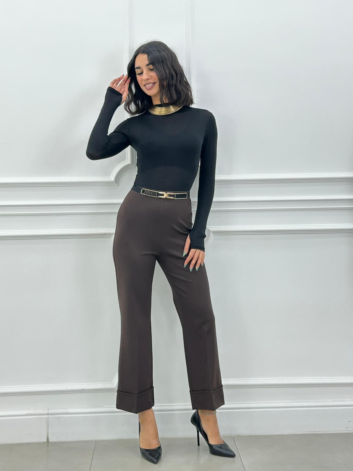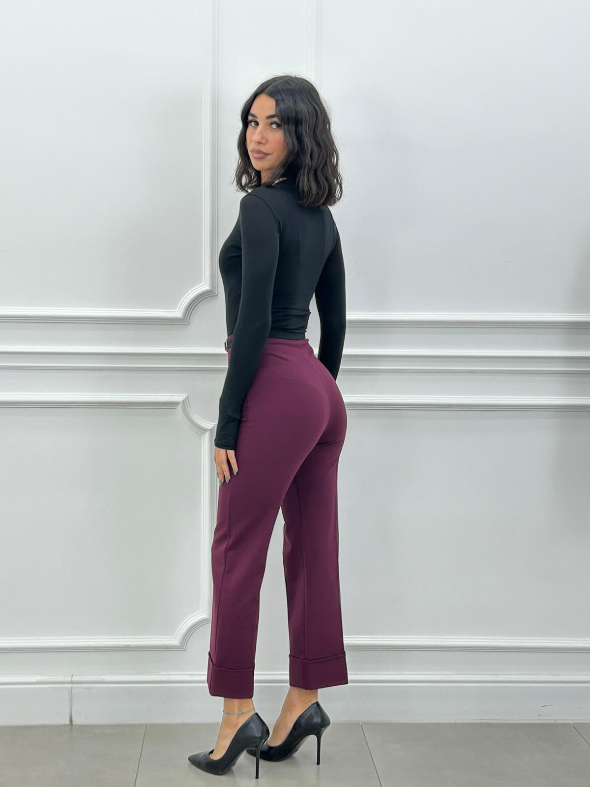 Pantalone punto milano con risvolto ,elastico in vita