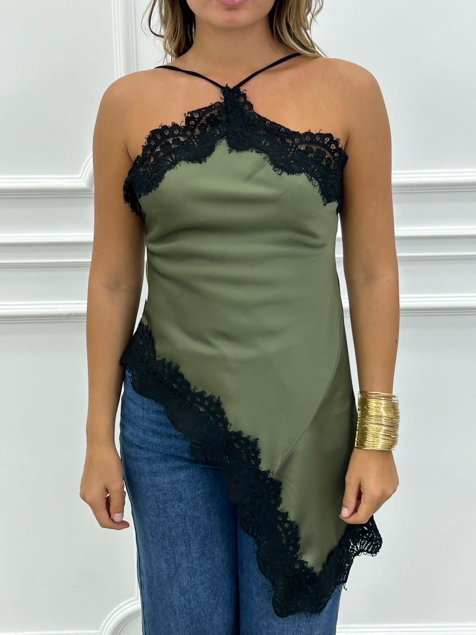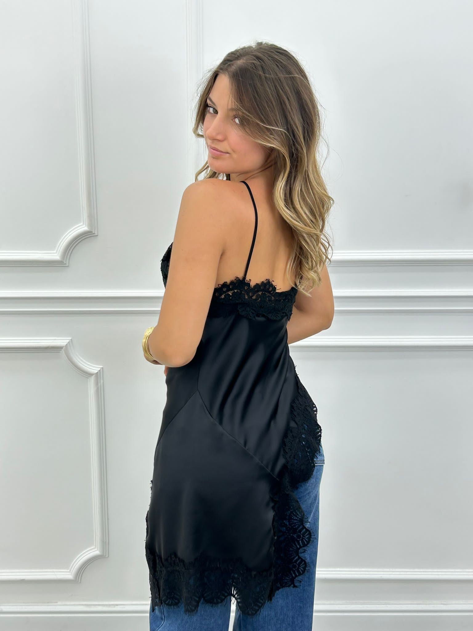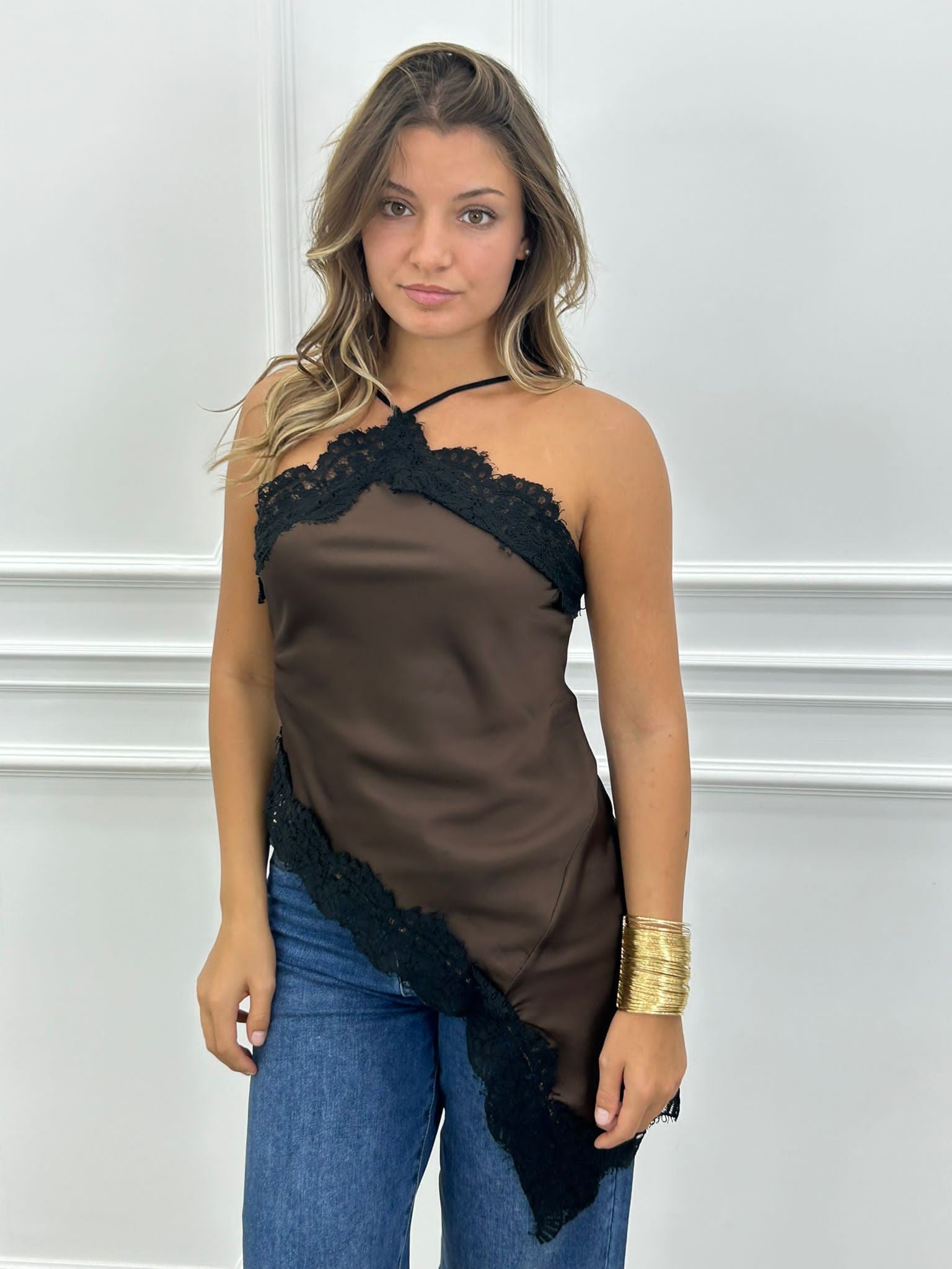 Top in raso con merletto ,scollo schiena e incrocio sul retro
