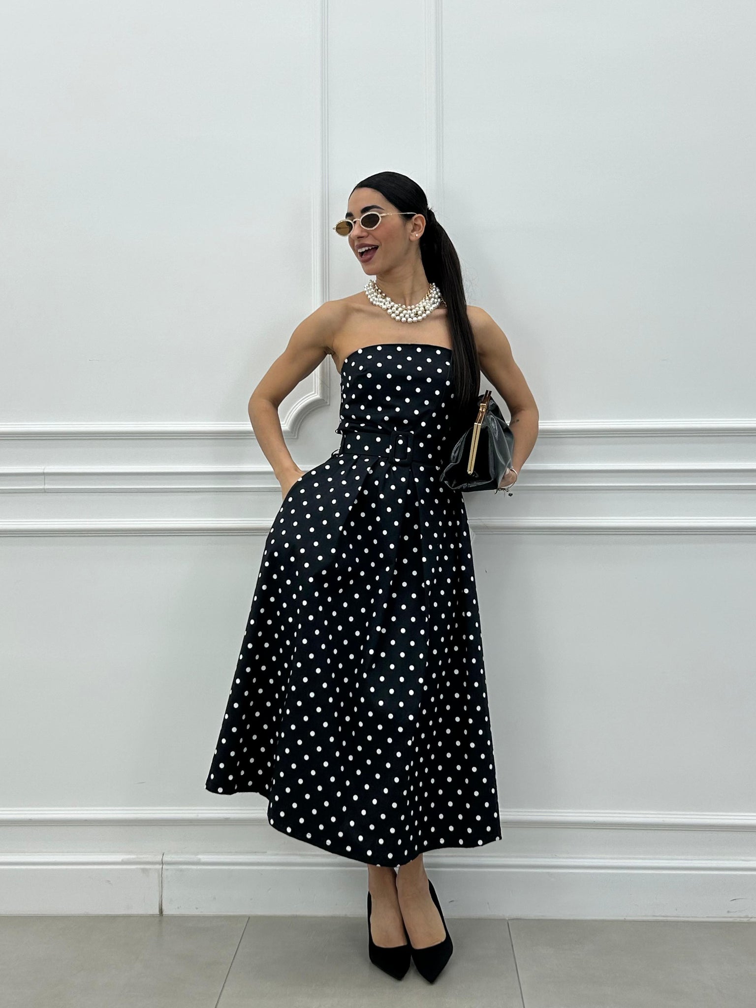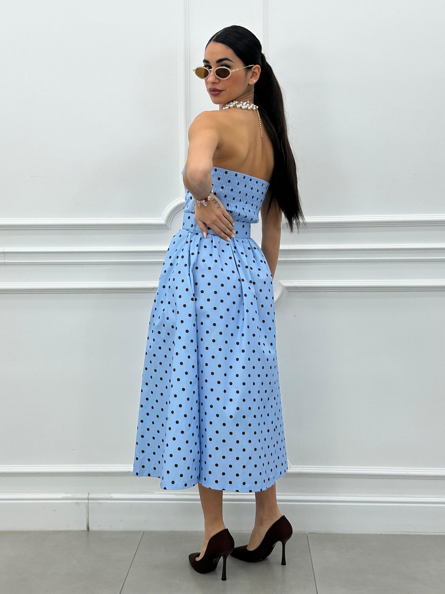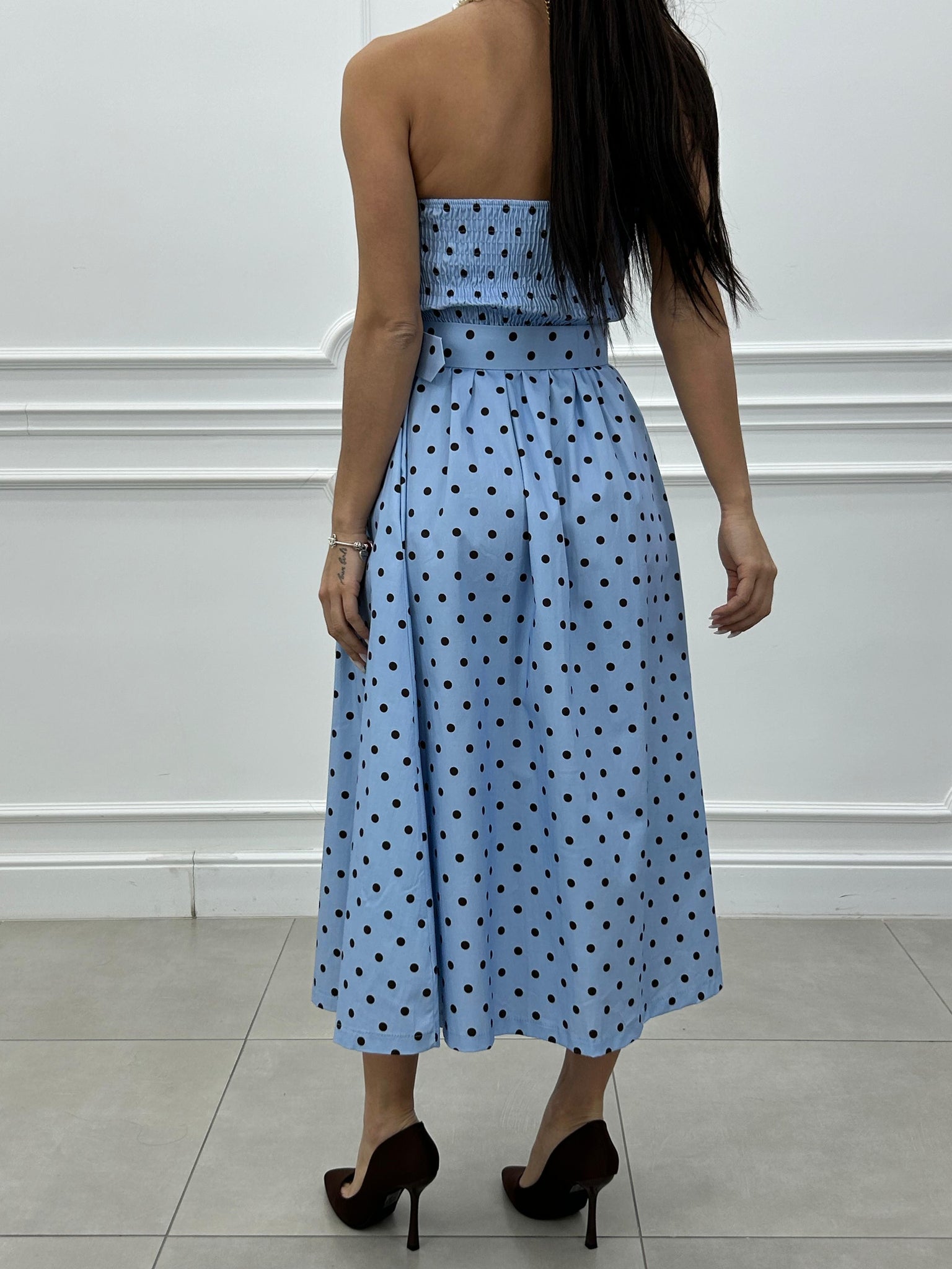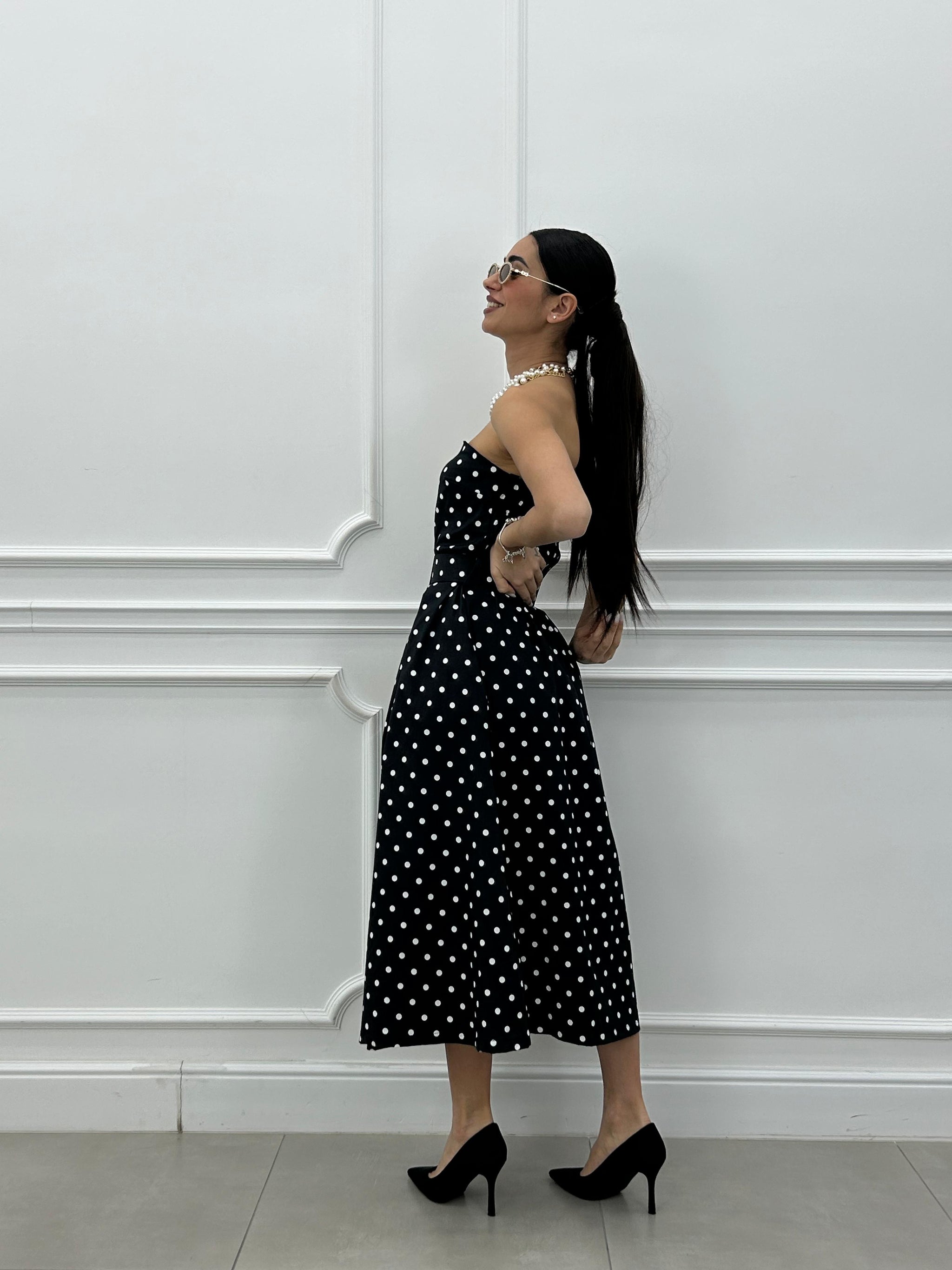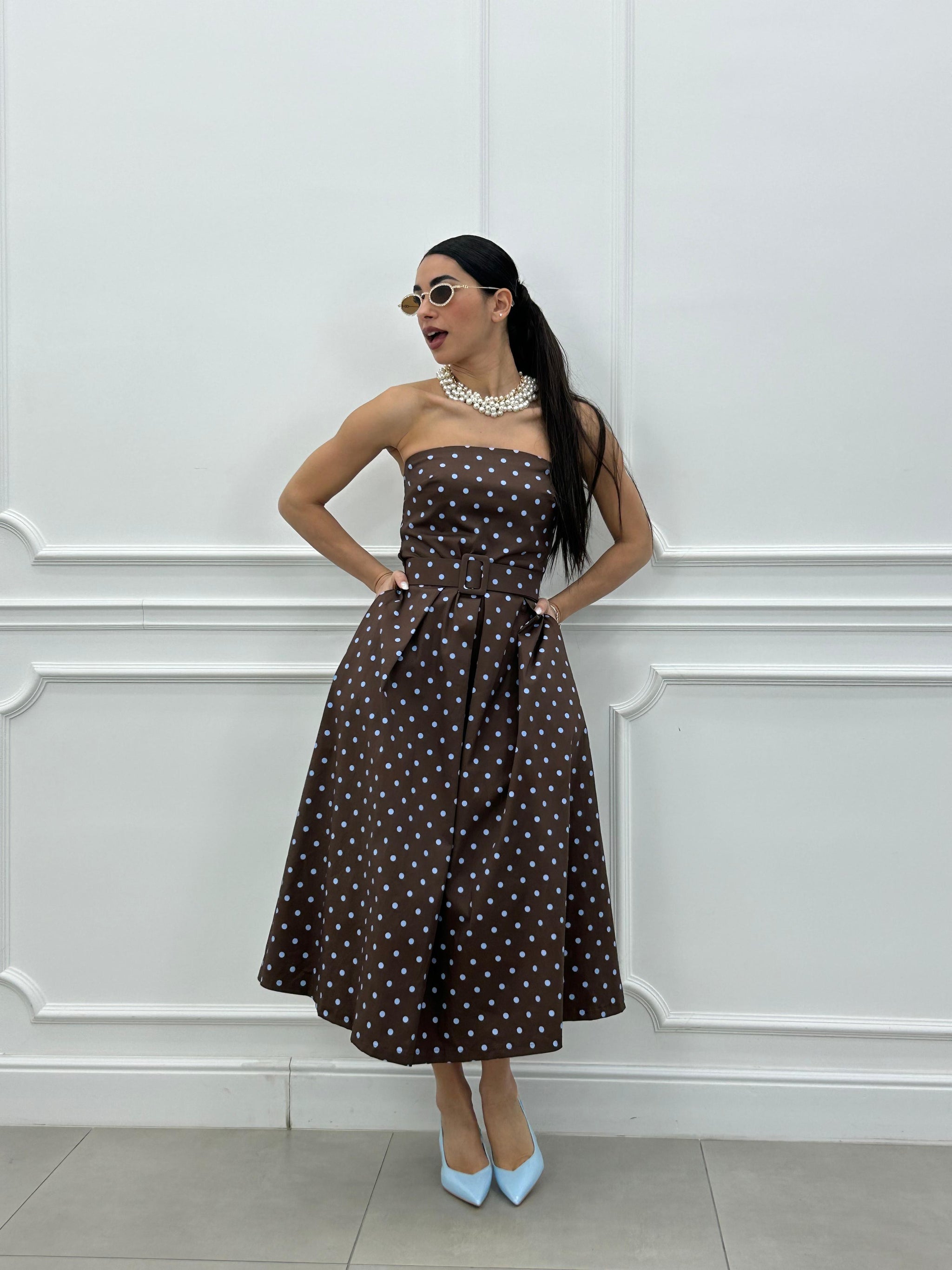 Abito midi con fantasia a pois e cintura estraibile.