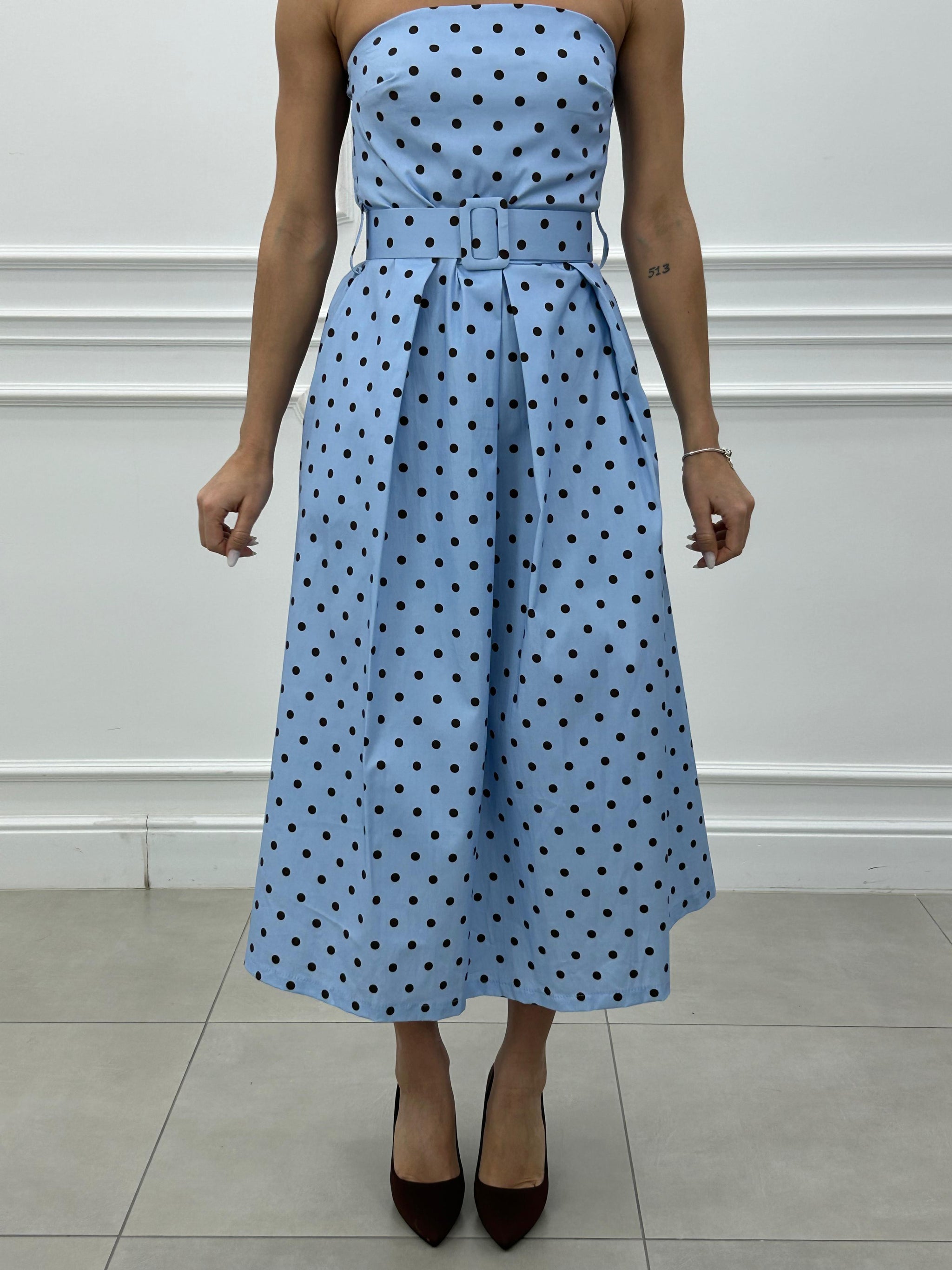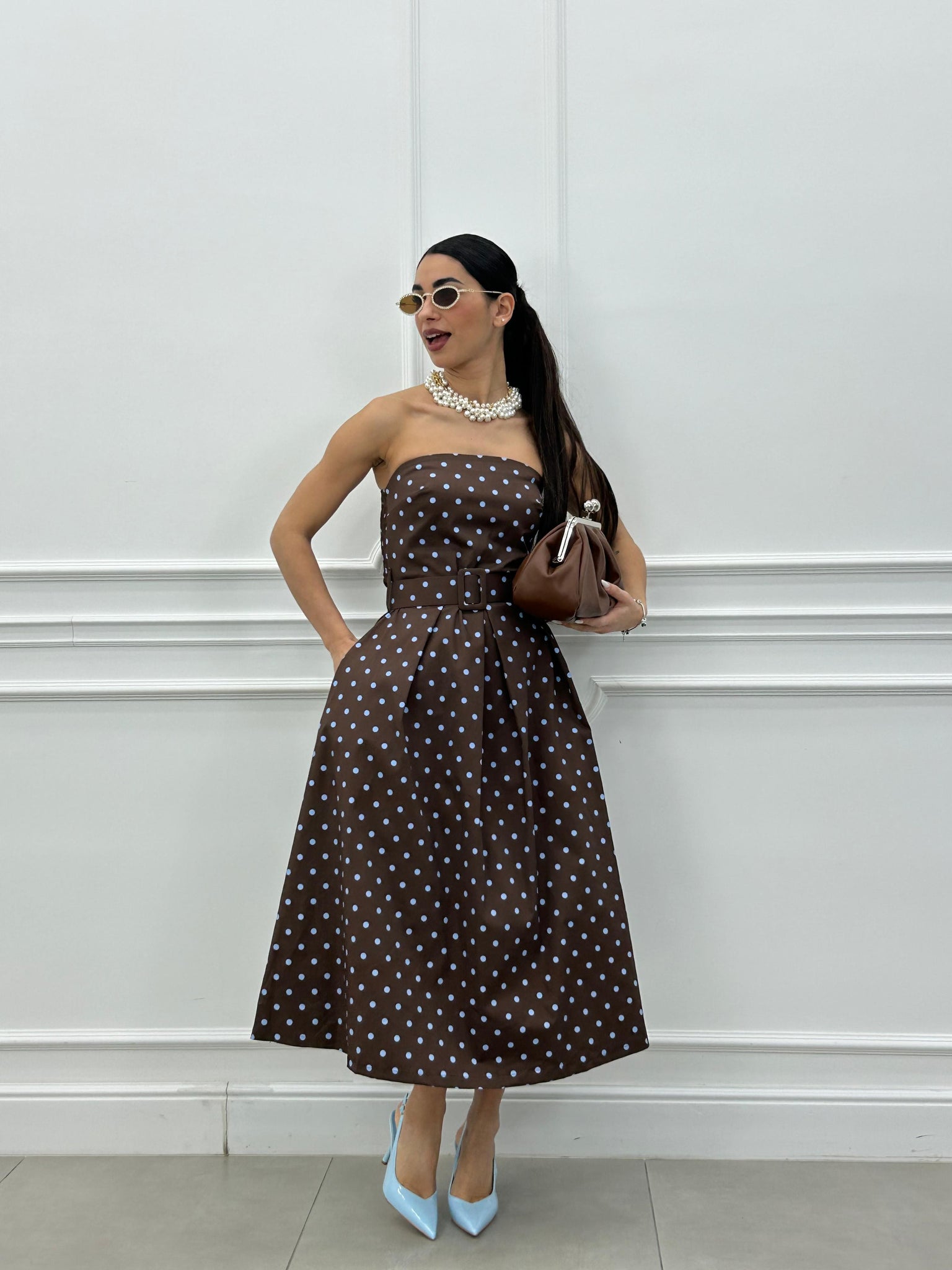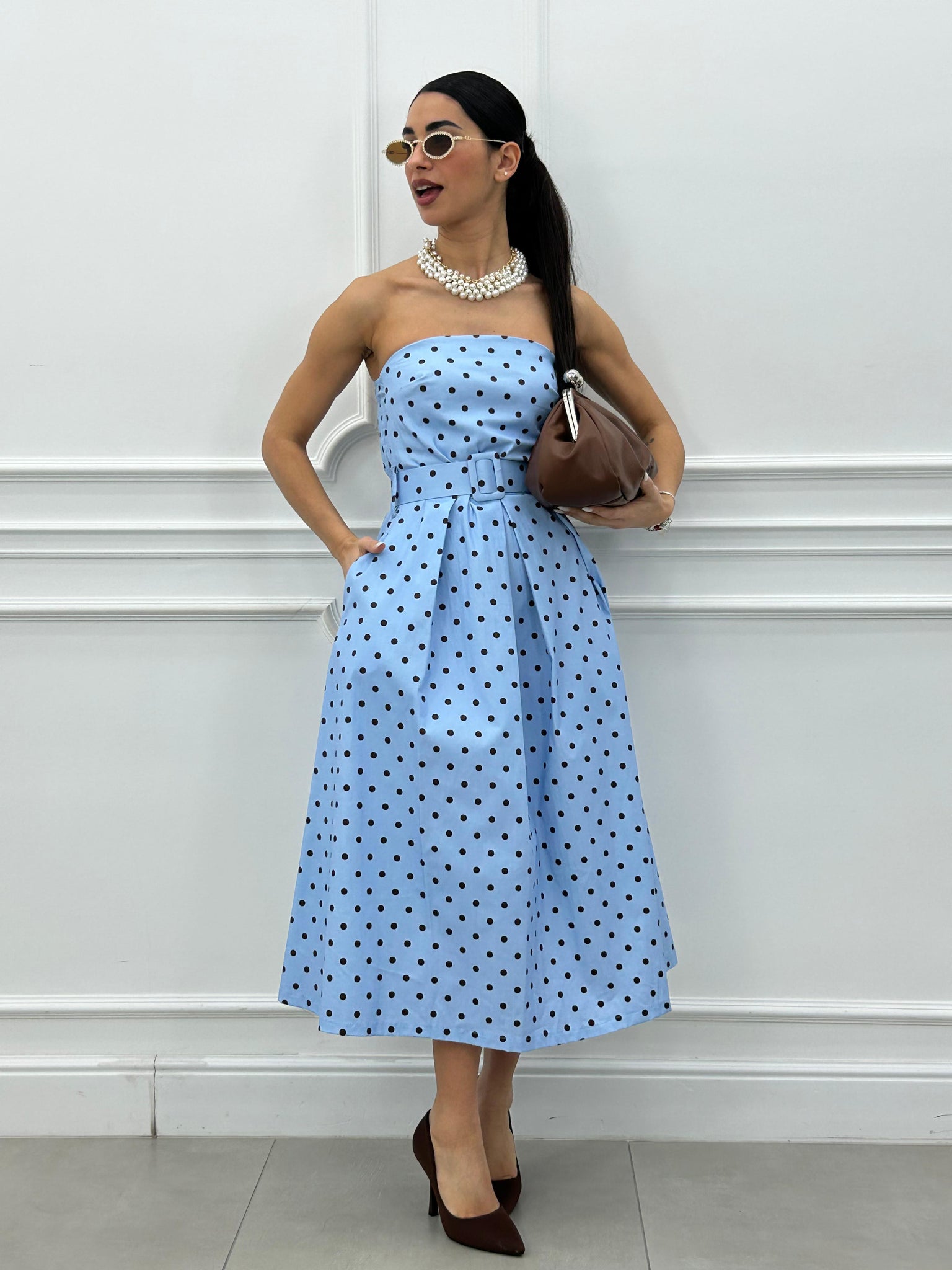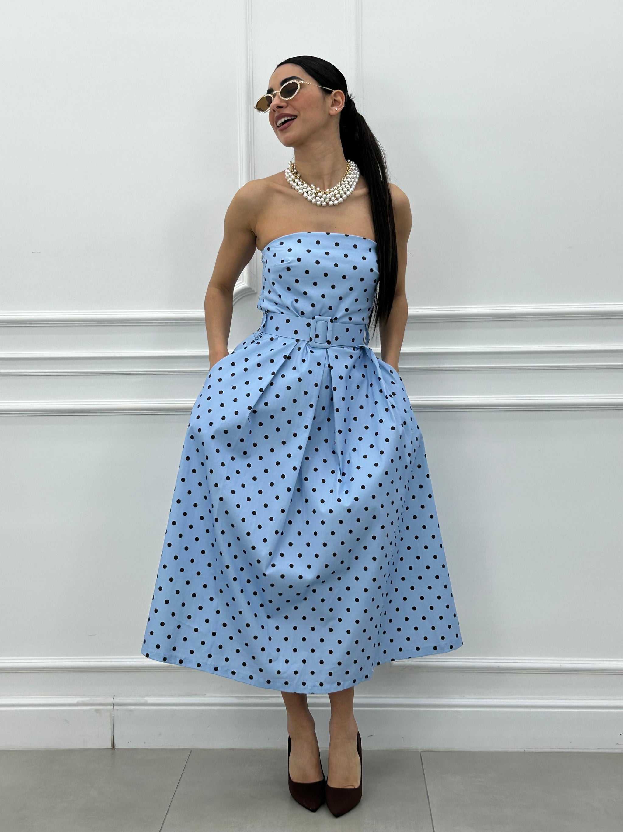 Abito midi con fantasia a pois e cintura estraibile.