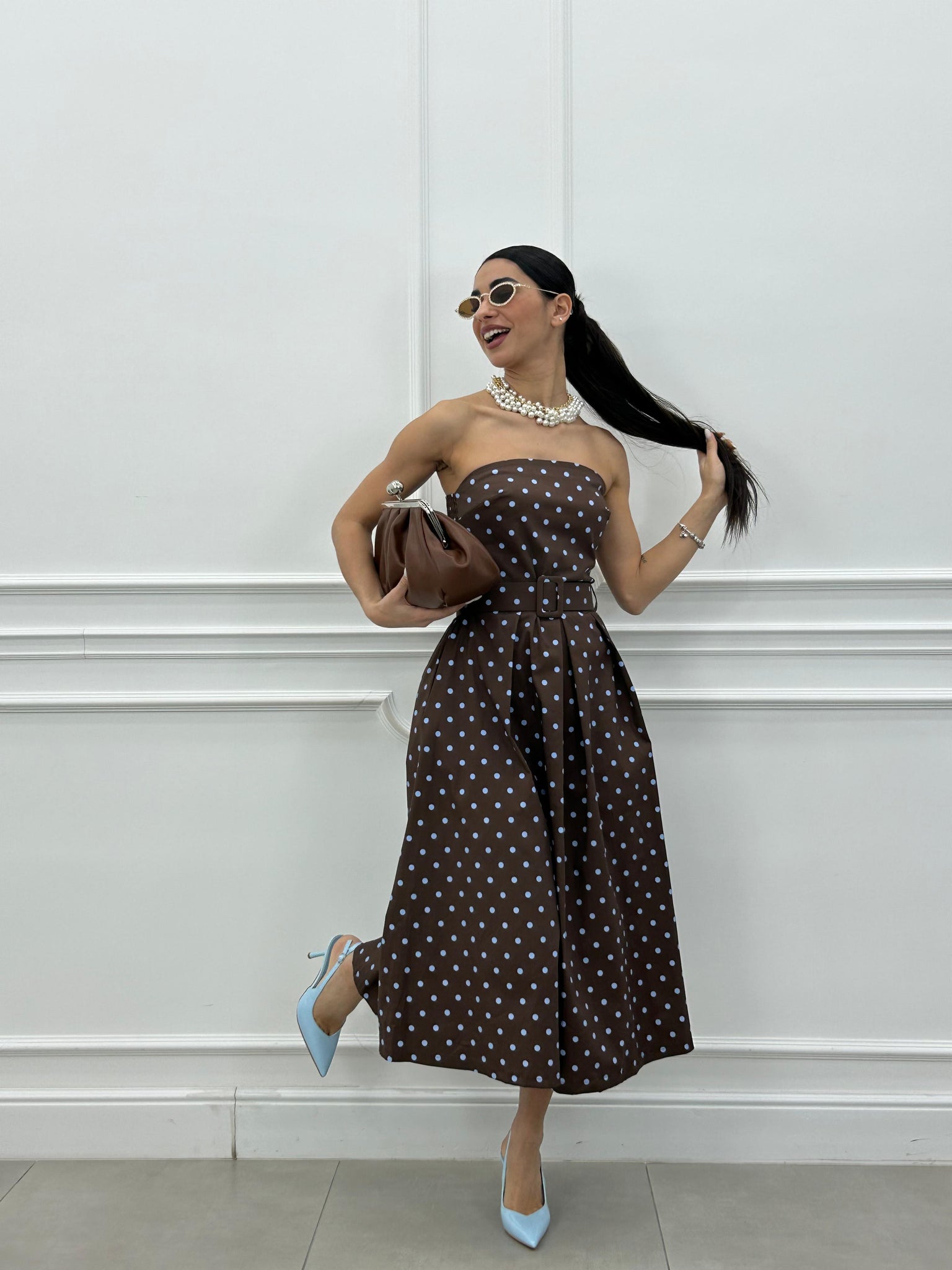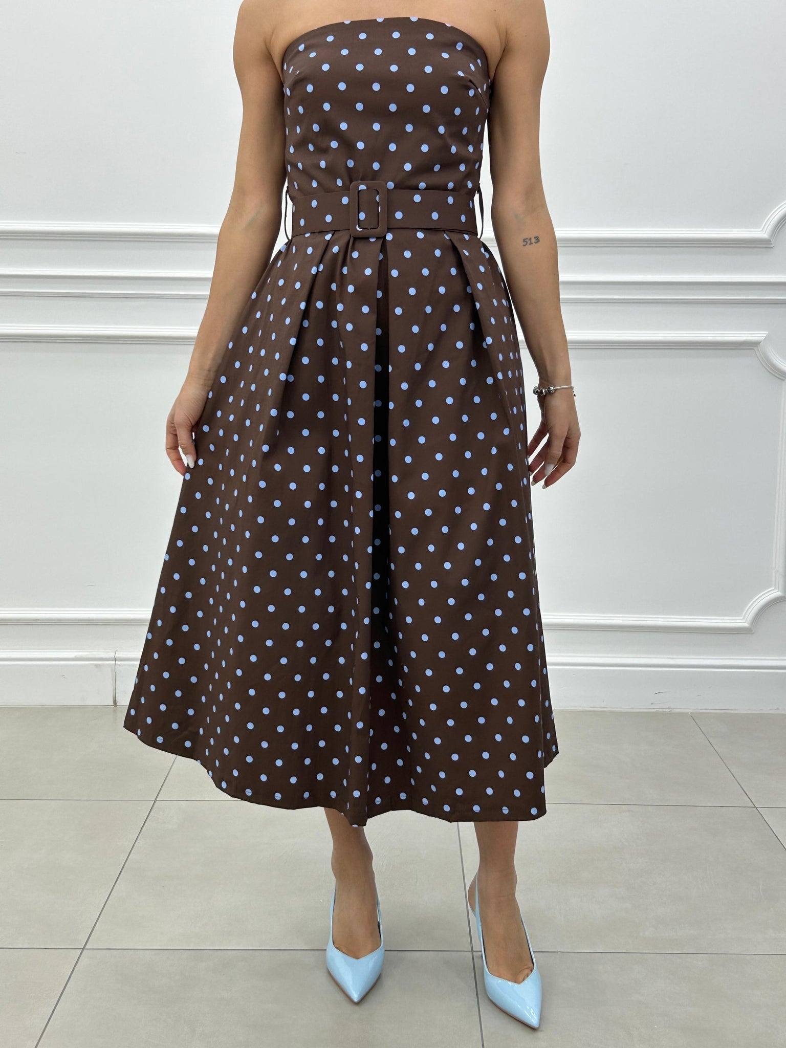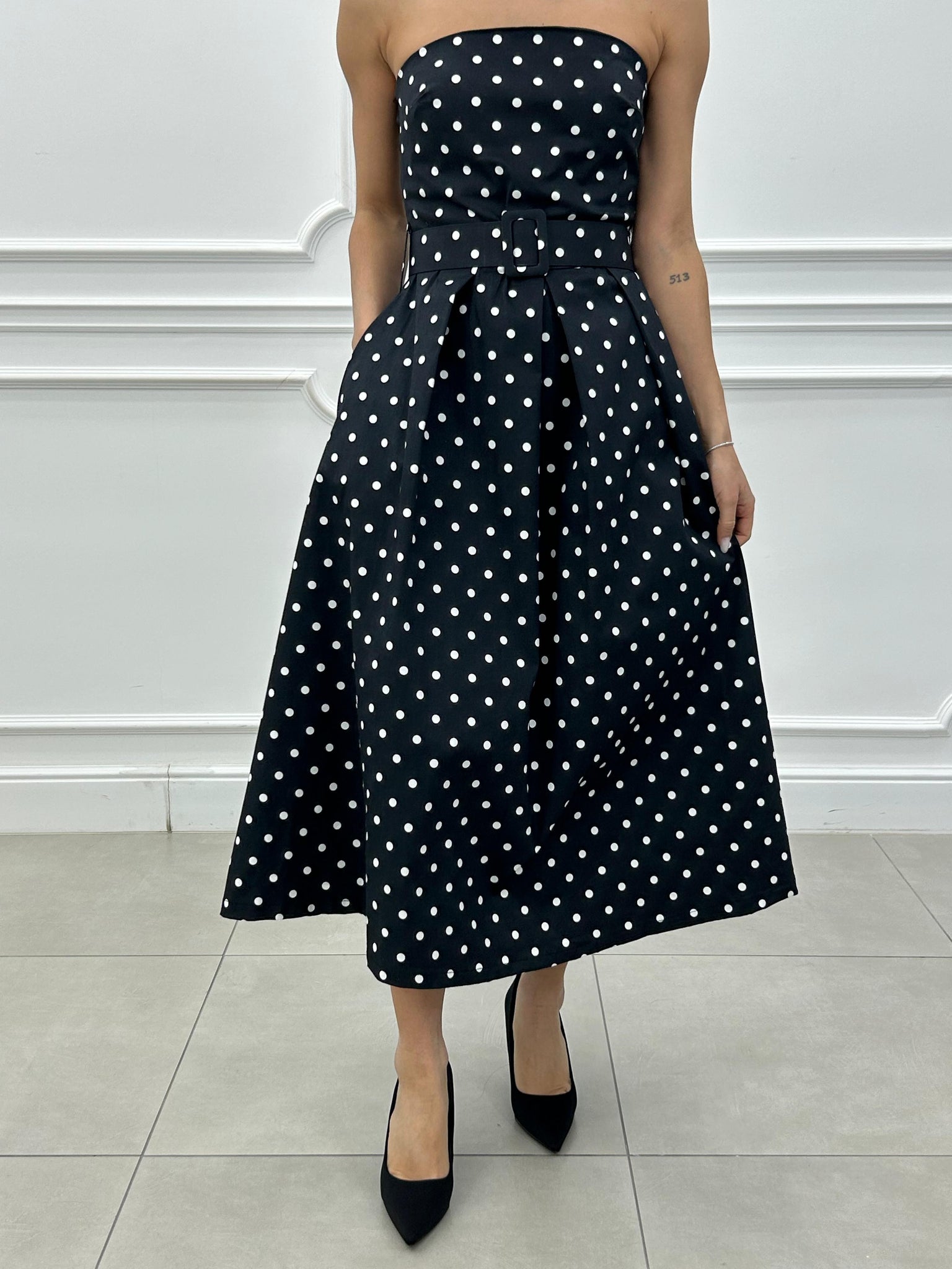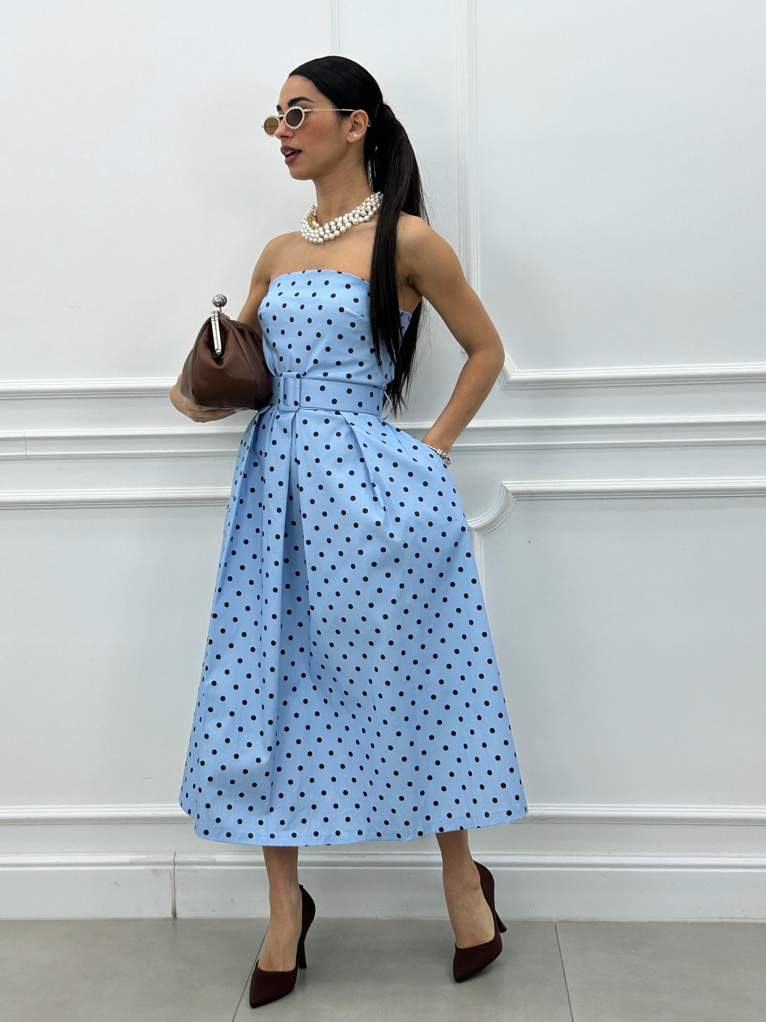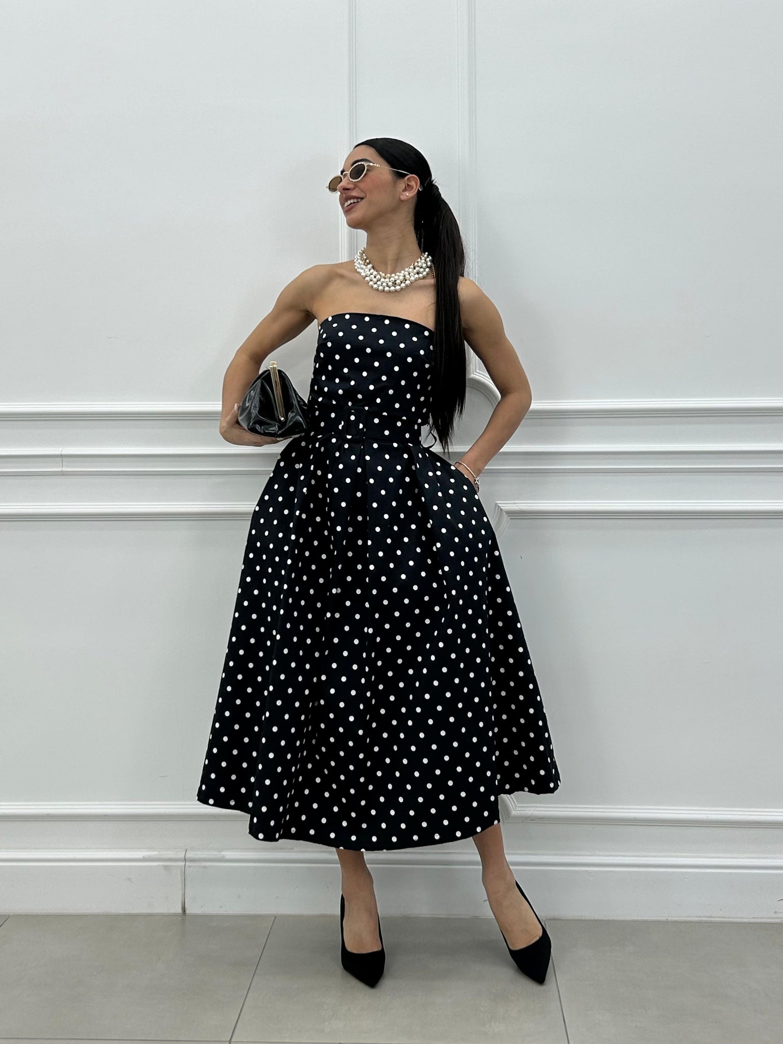 Abito midi con fantasia a pois e cintura estraibile.
