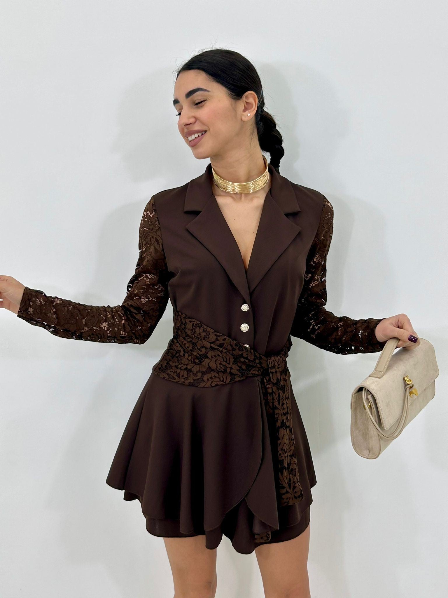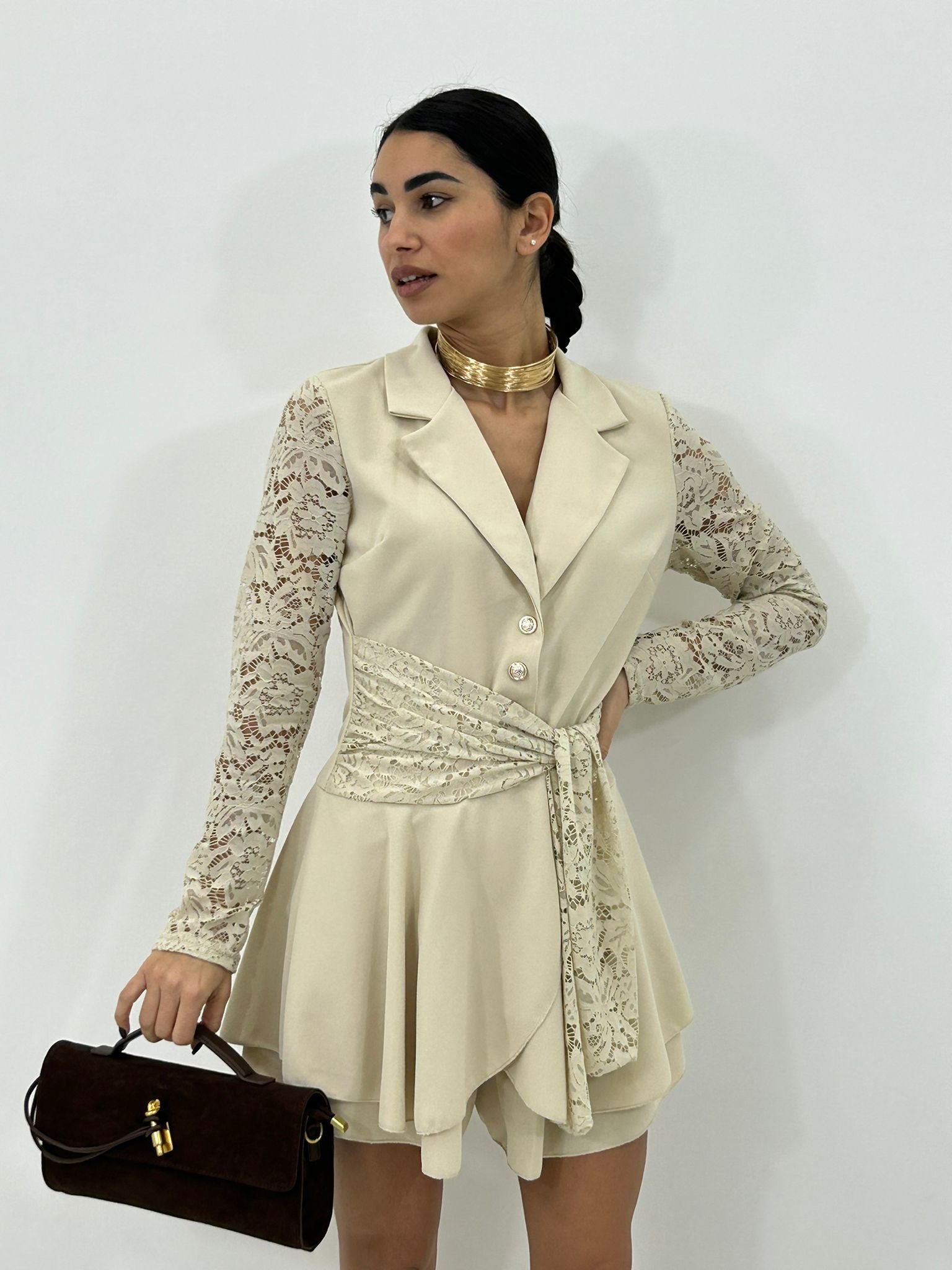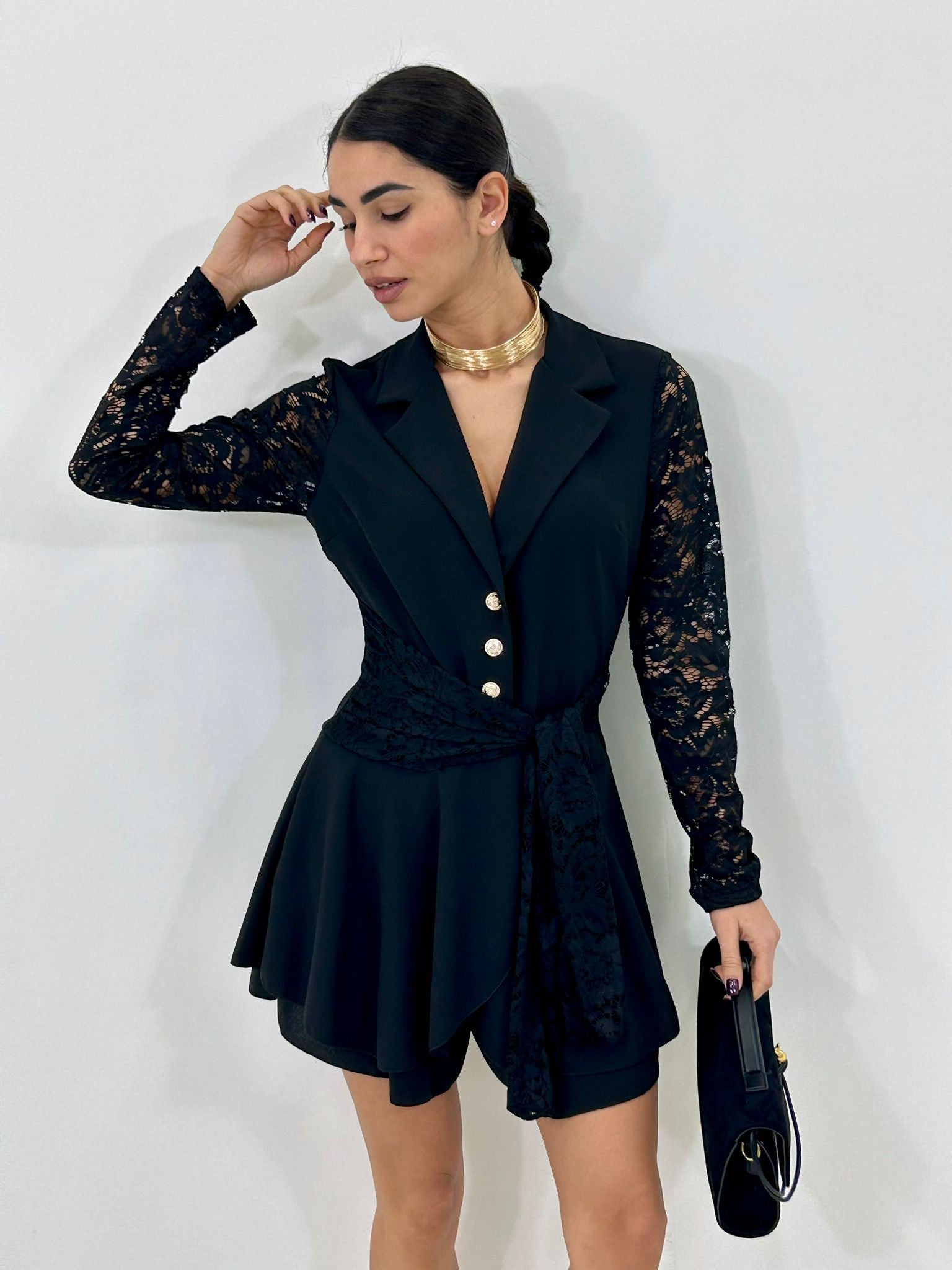 Vestito giacca (shorts sotto)con maniche in pizzo ,bottoni oro e balze