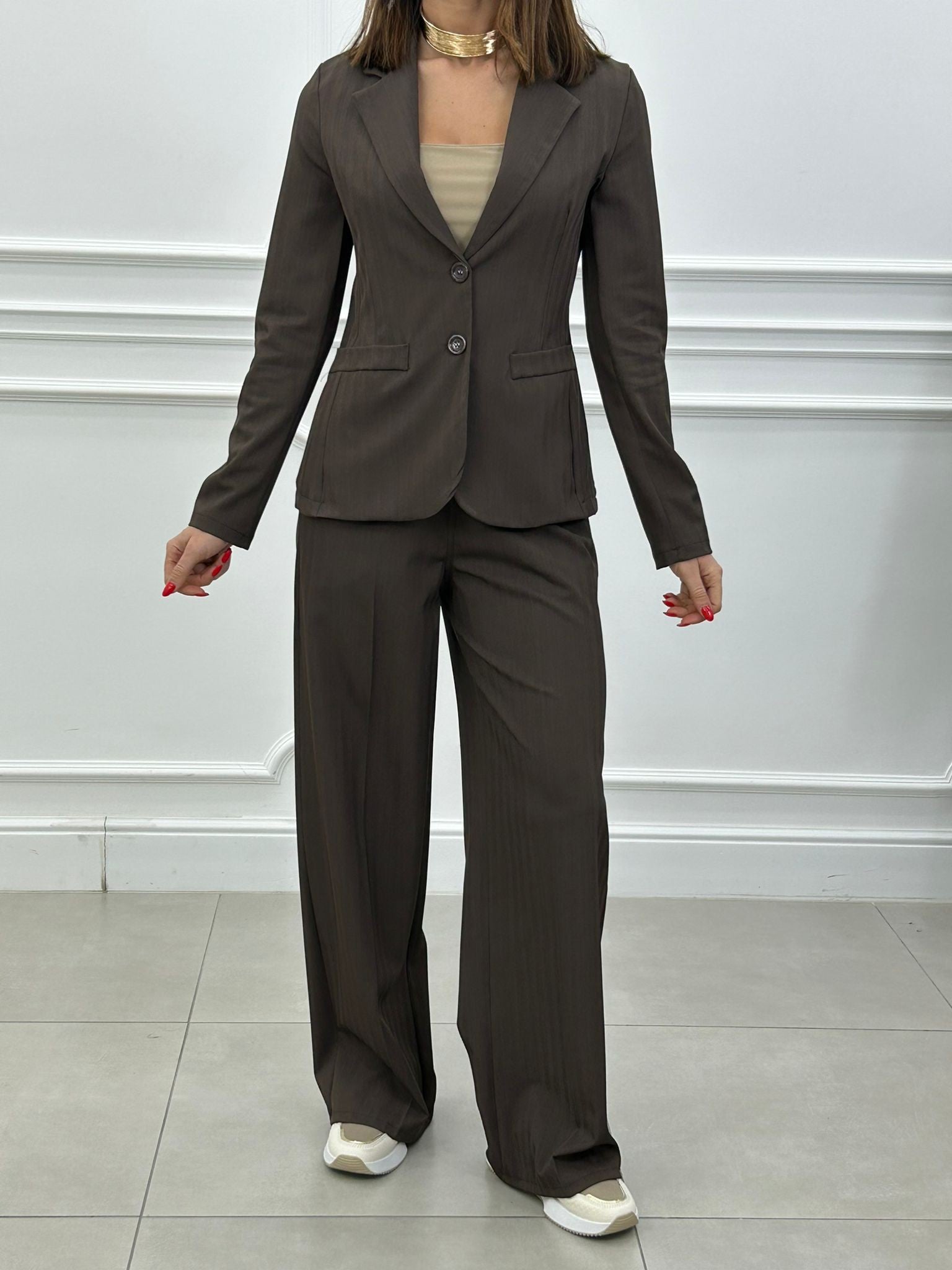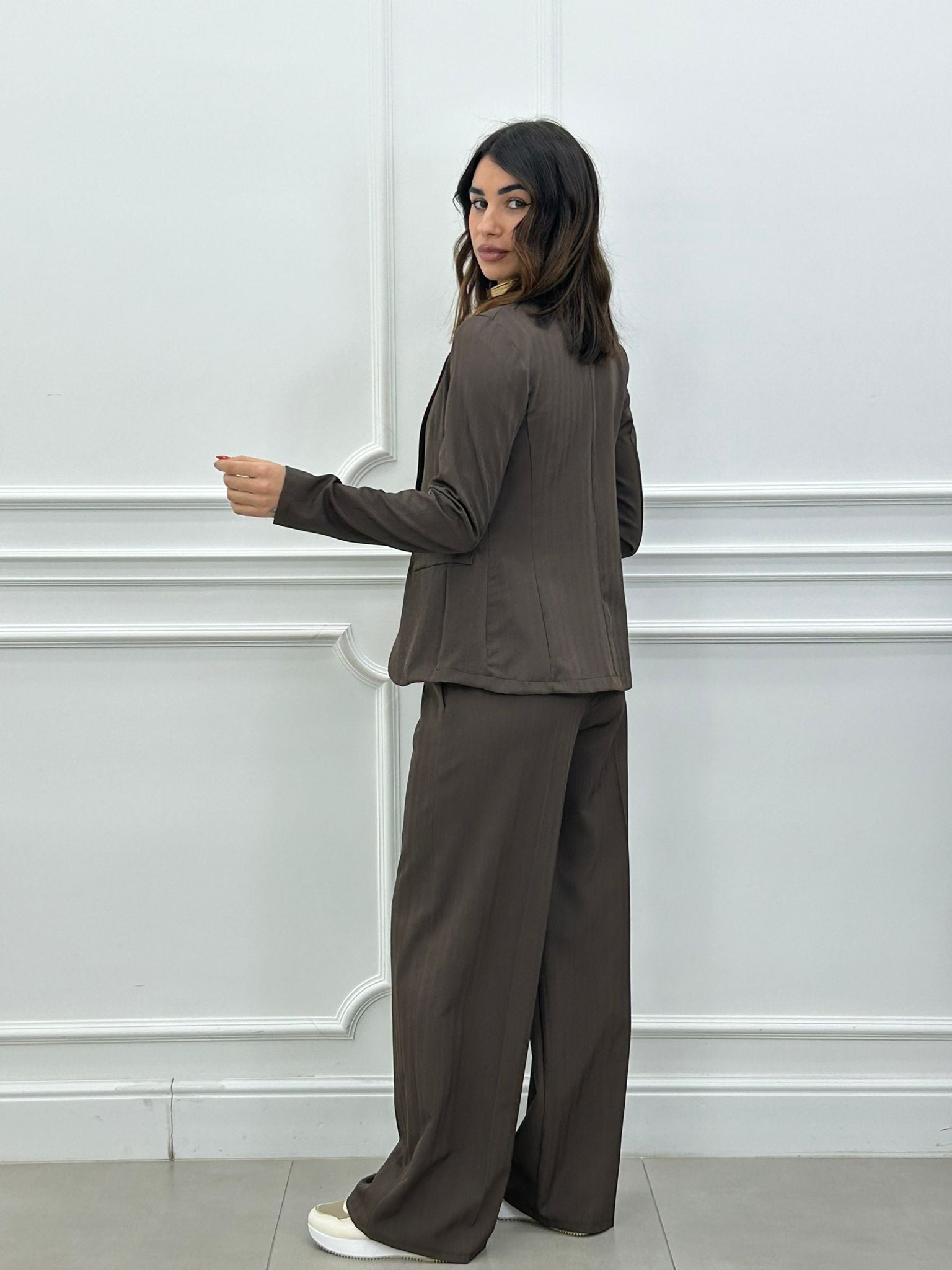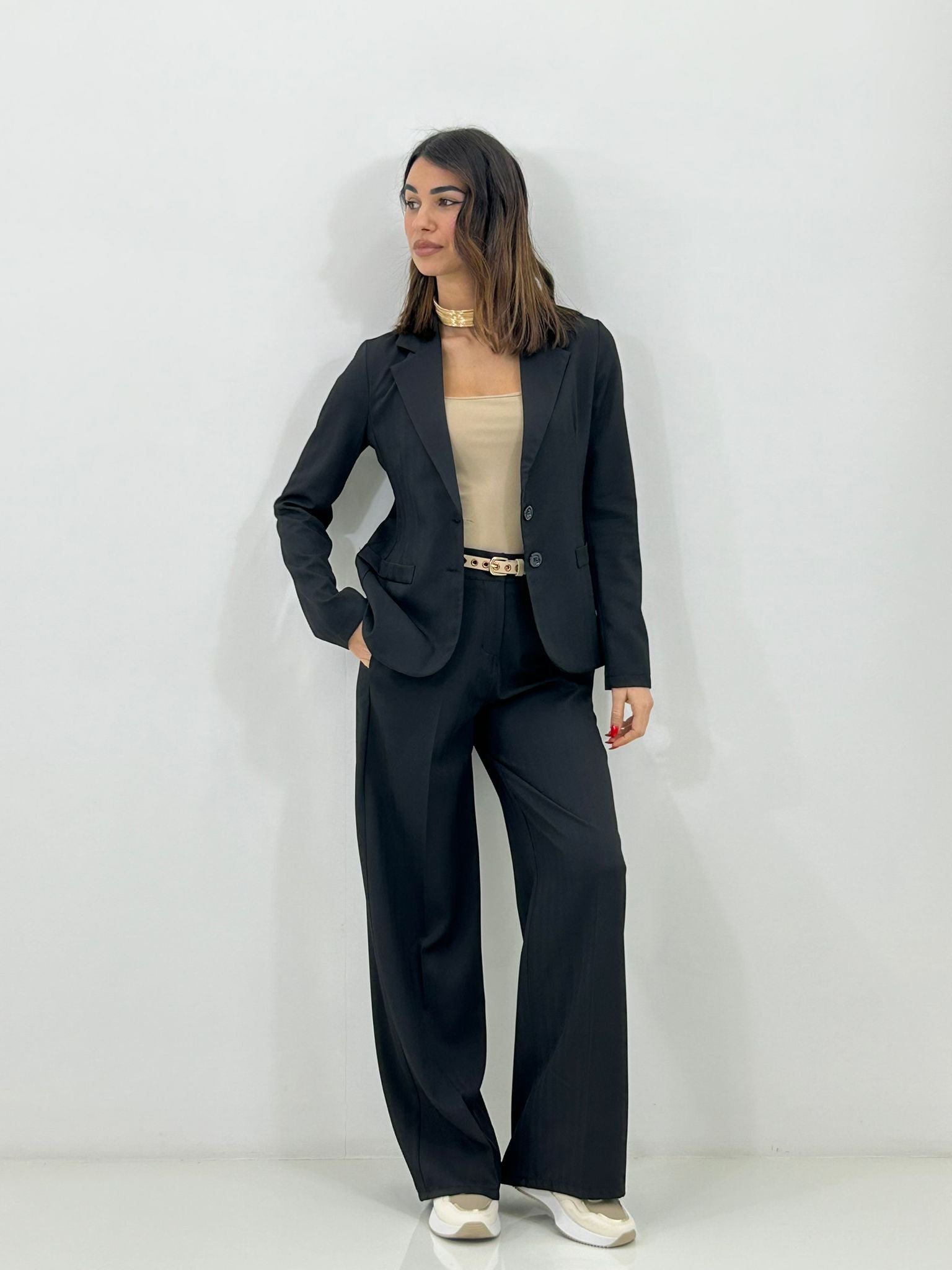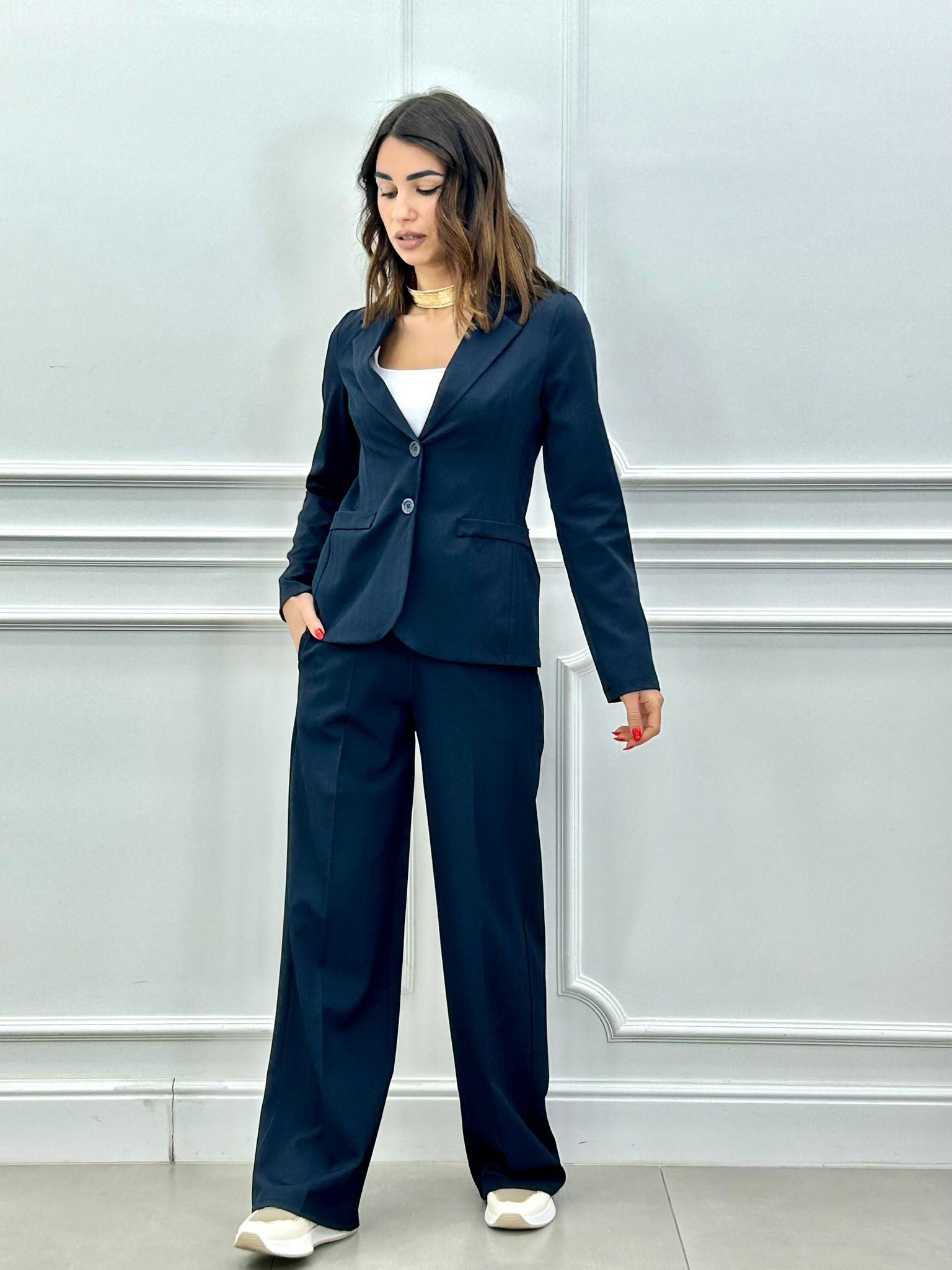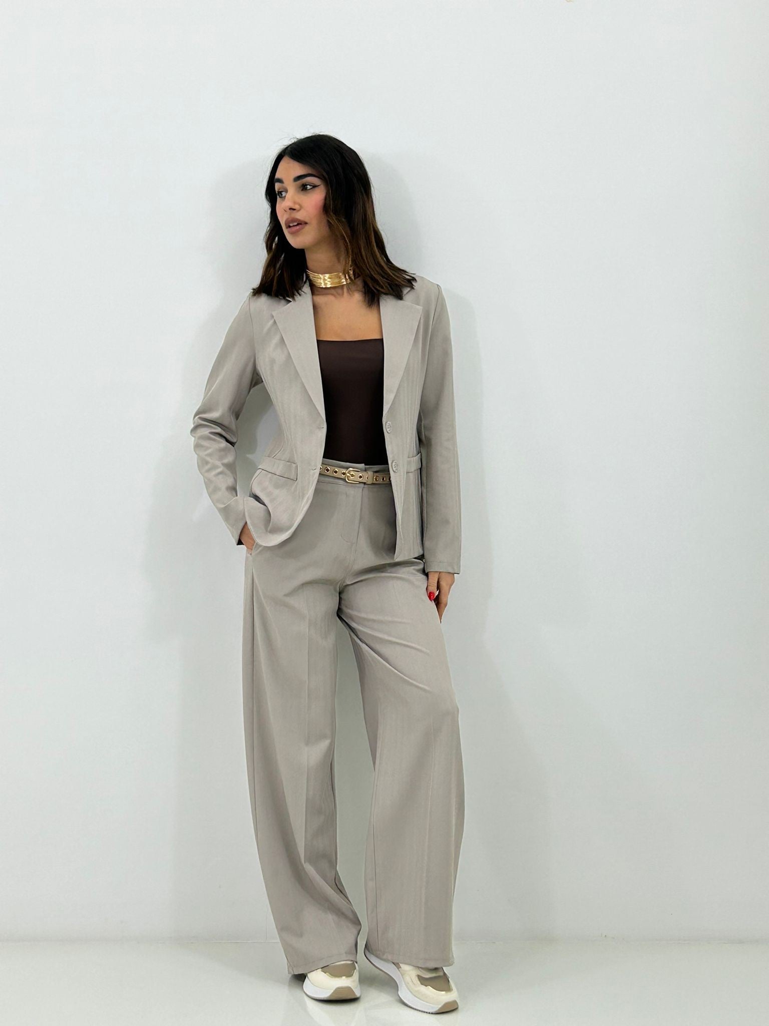 Coordinato, giacca un bottone e pantalone elastico in vita e tasche