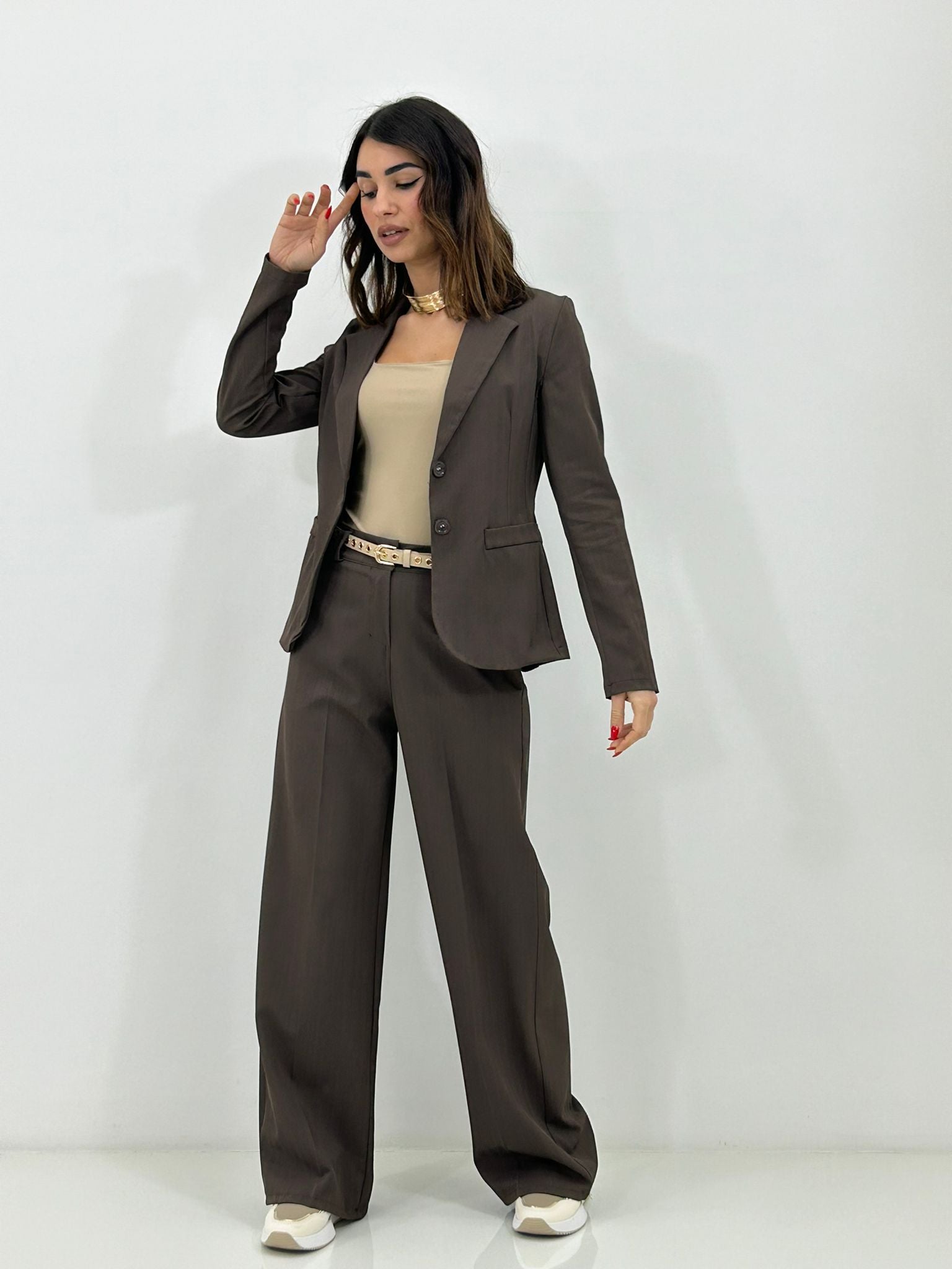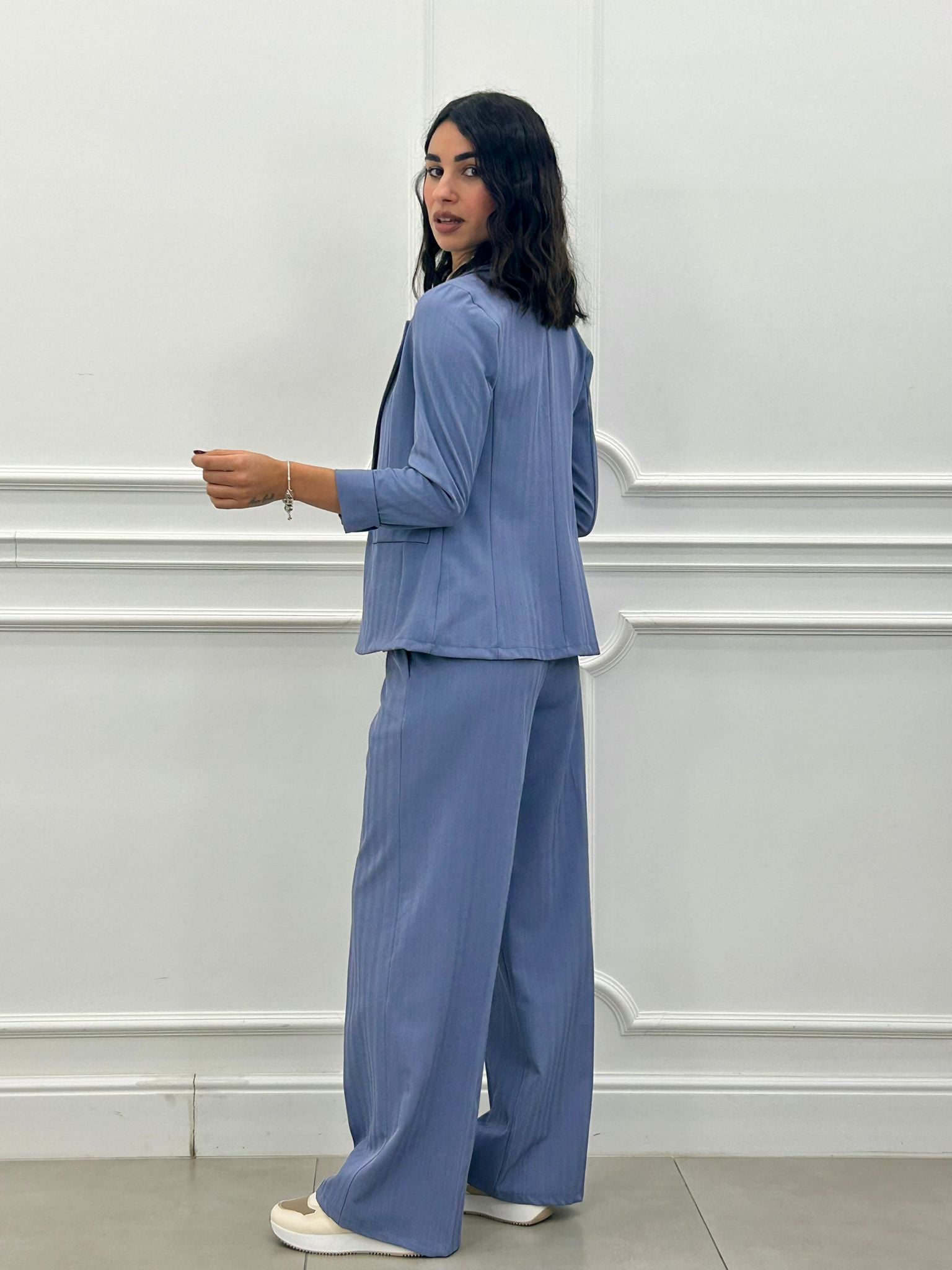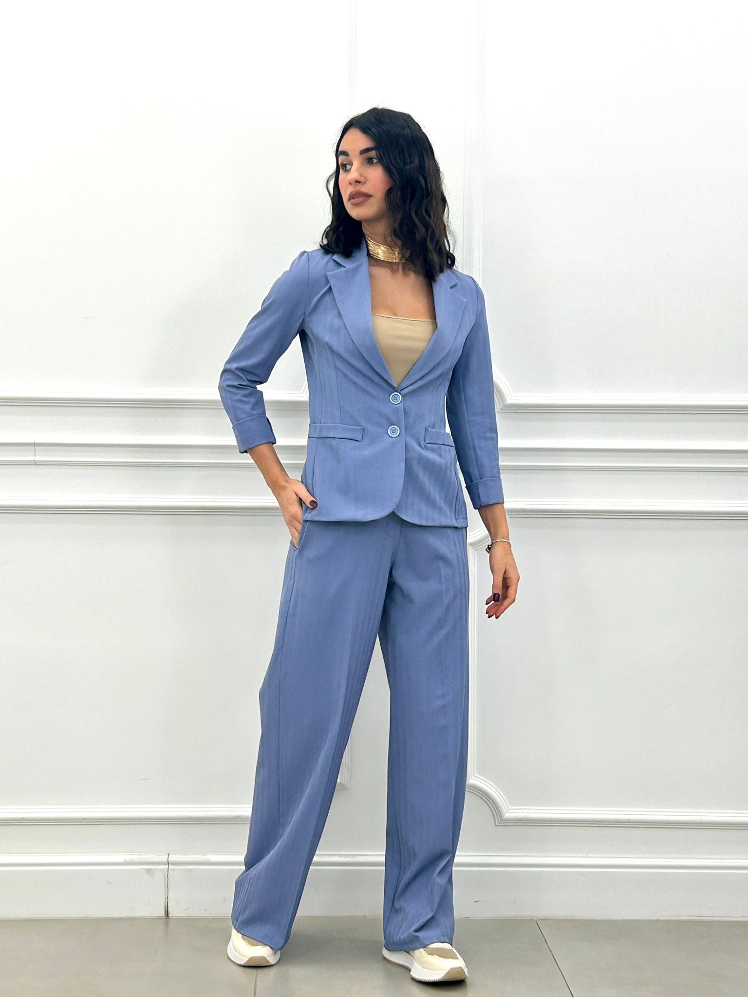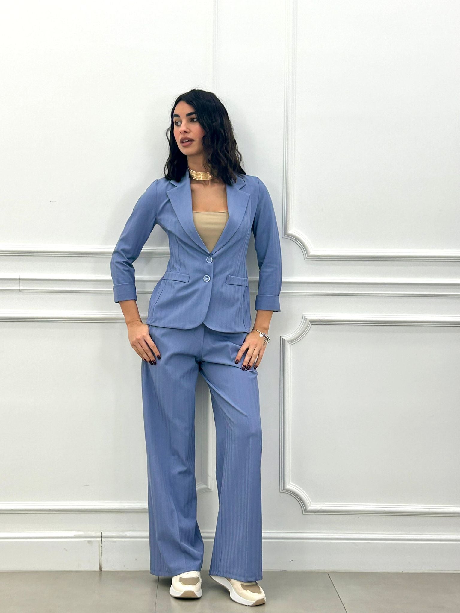 Coordinato, giacca un bottone e pantalone elastico in vita e tasche