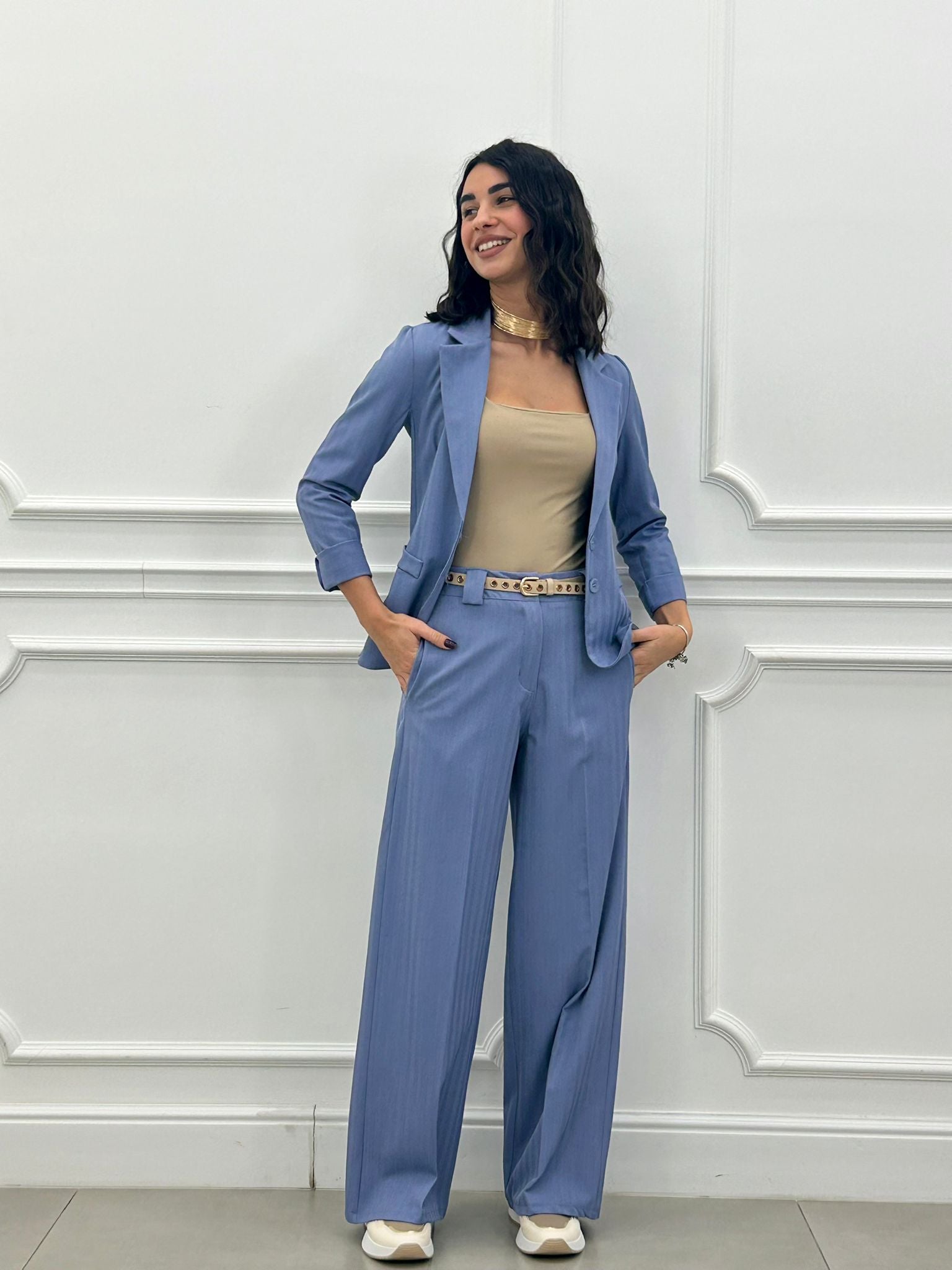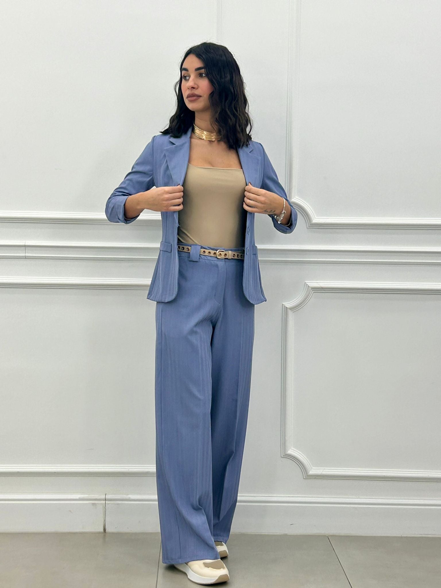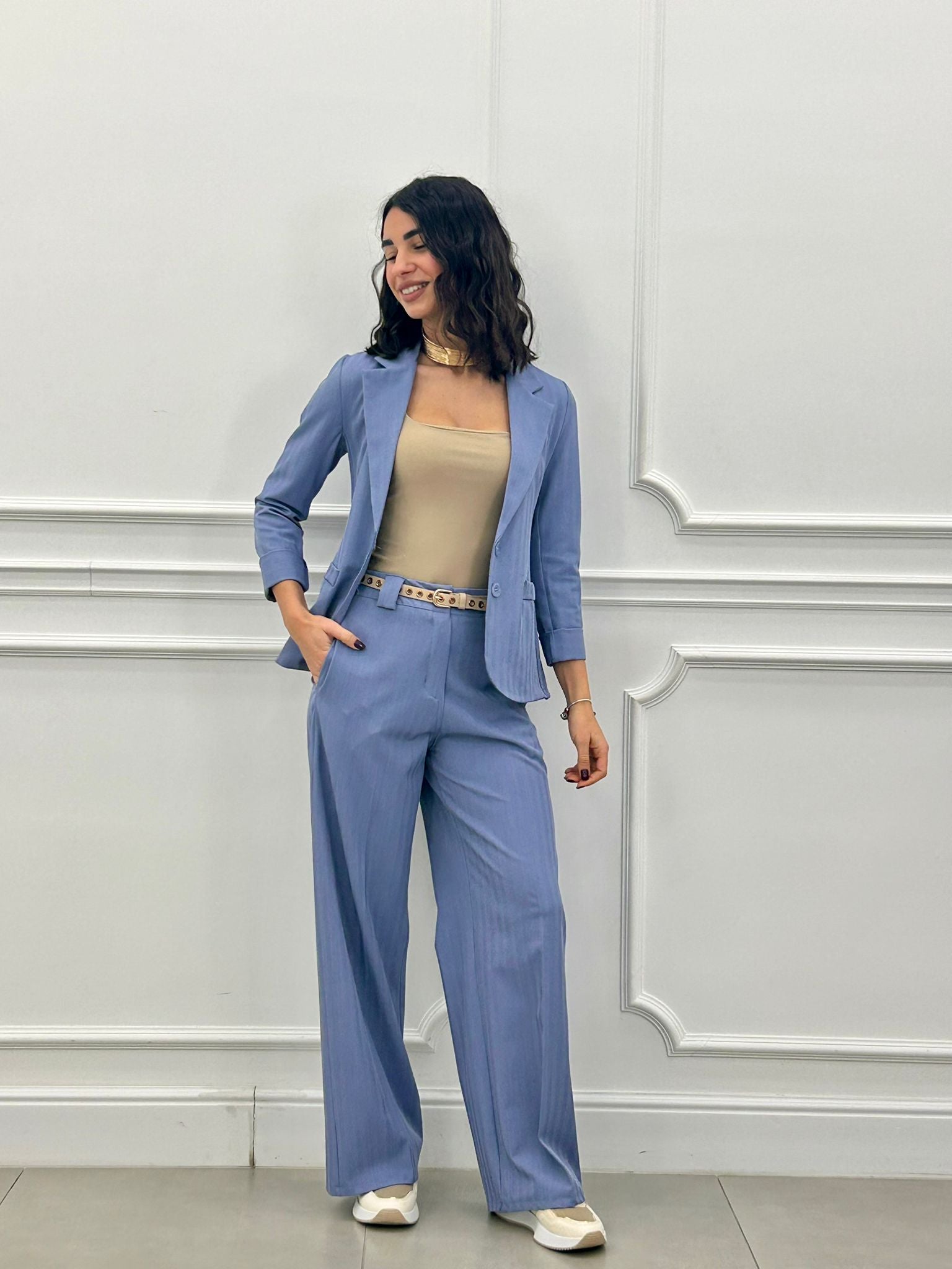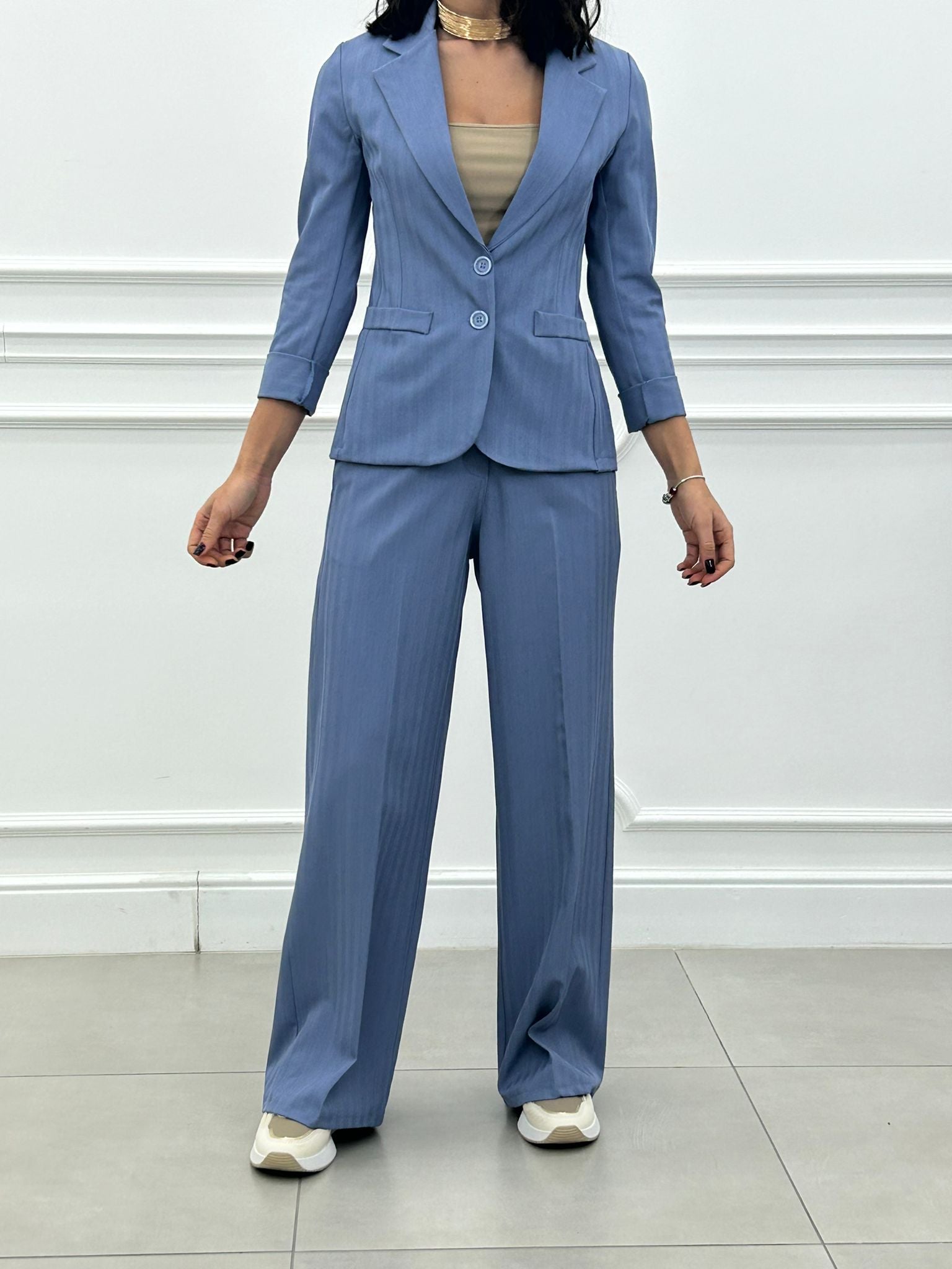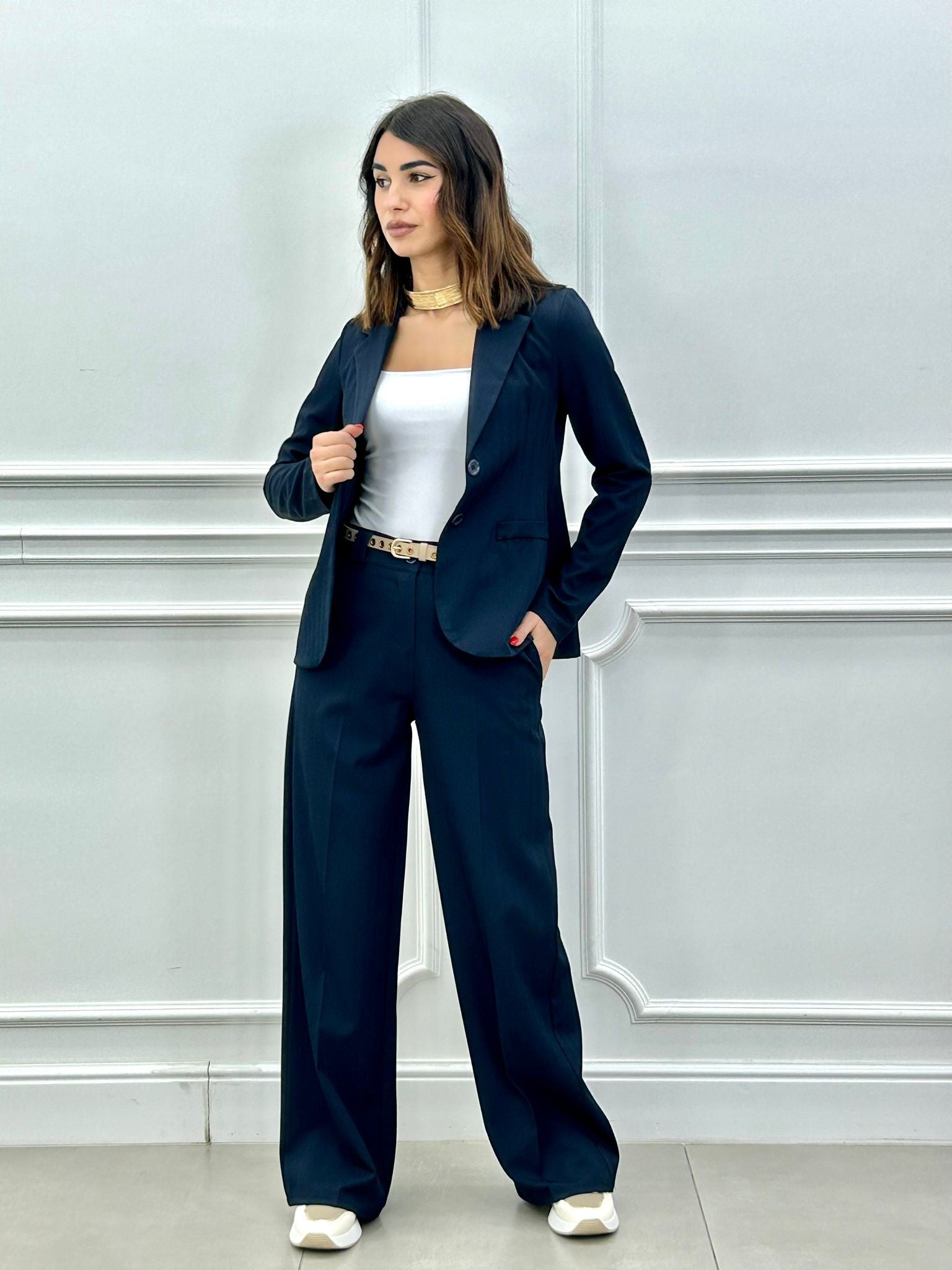 Coordinato, giacca un bottone e pantalone elastico in vita e tasche