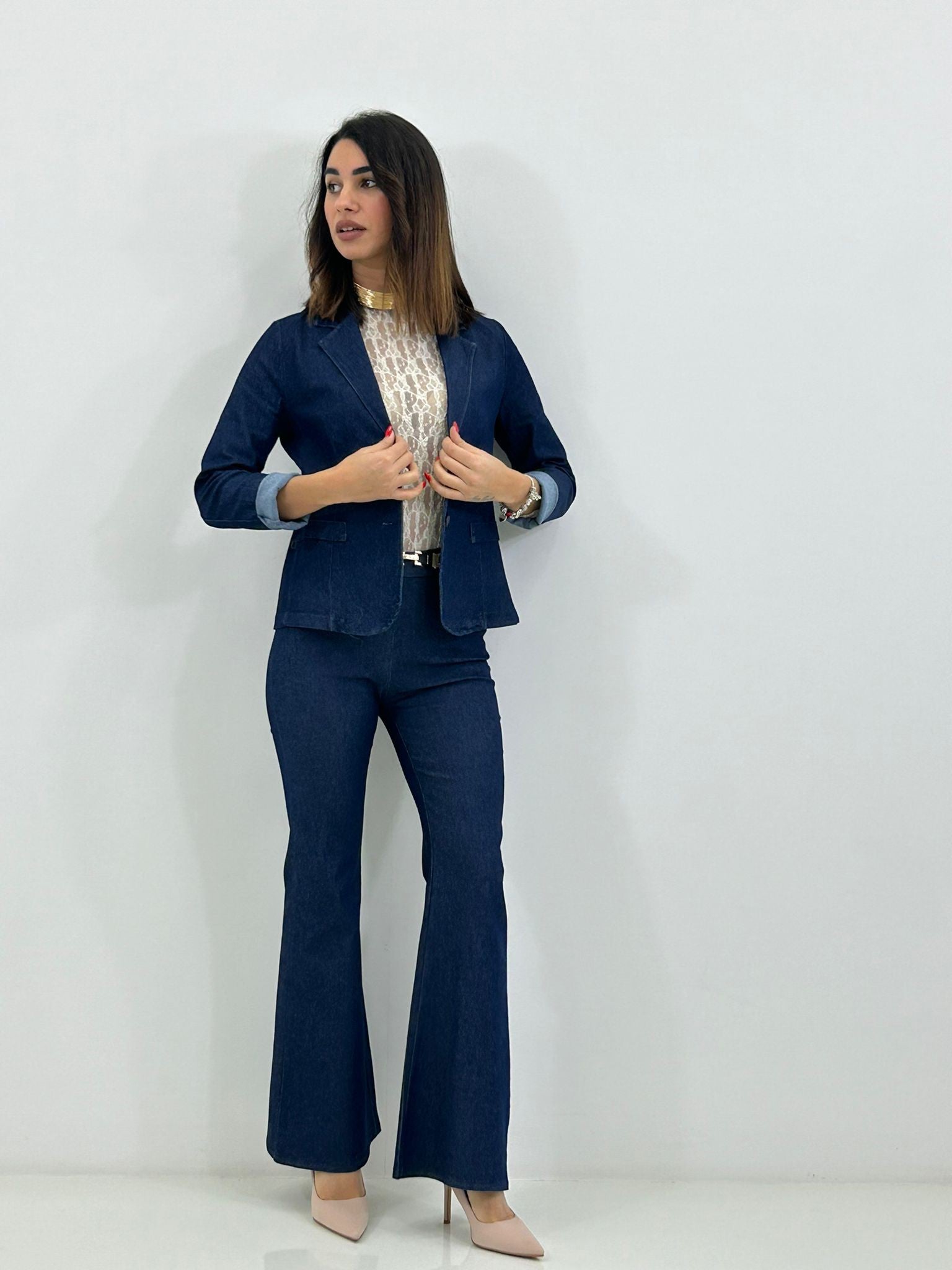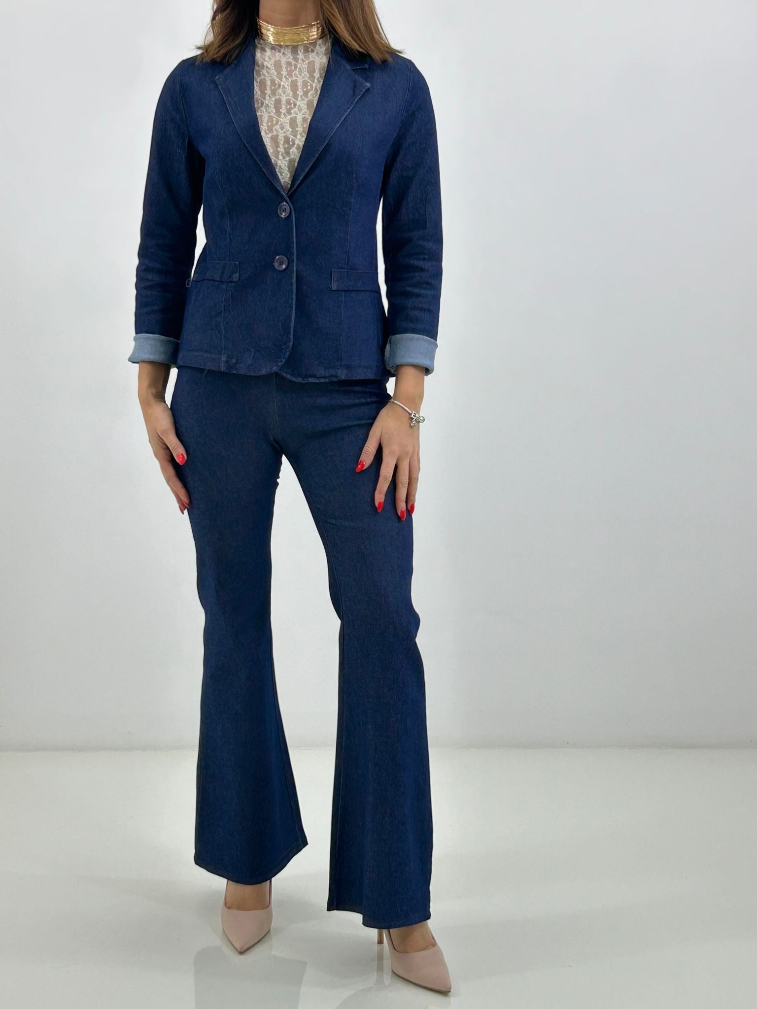 Coordinato denim giacca chiusura due bottoni e pantalone zampa con elastico in vita