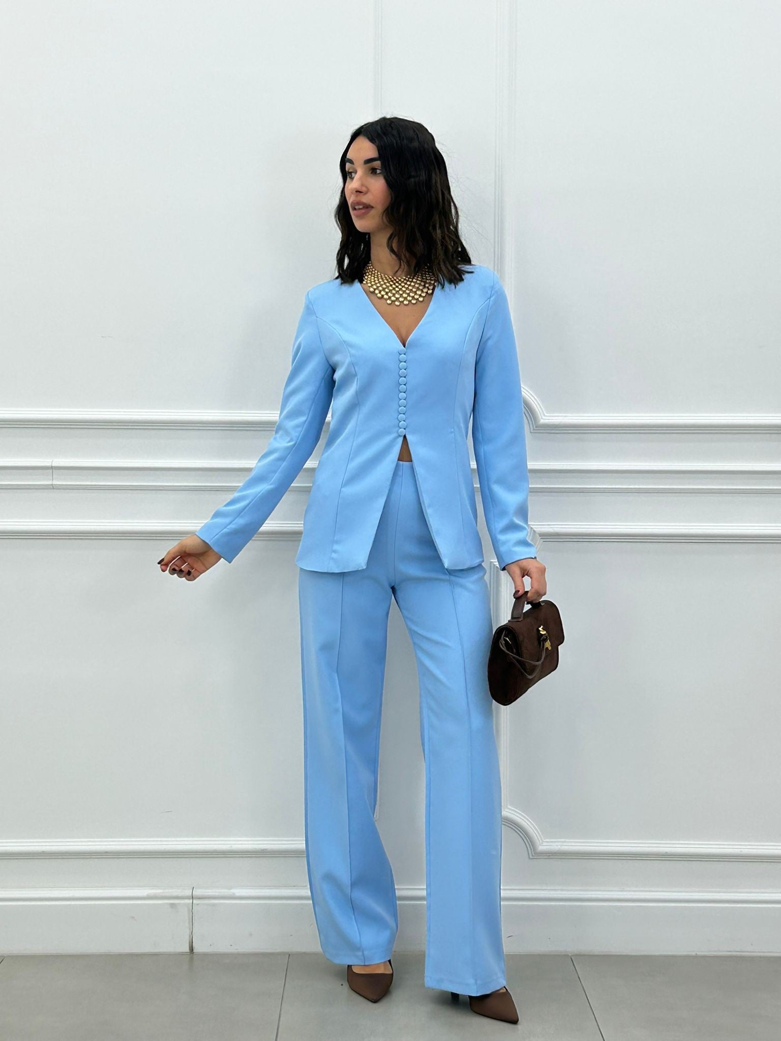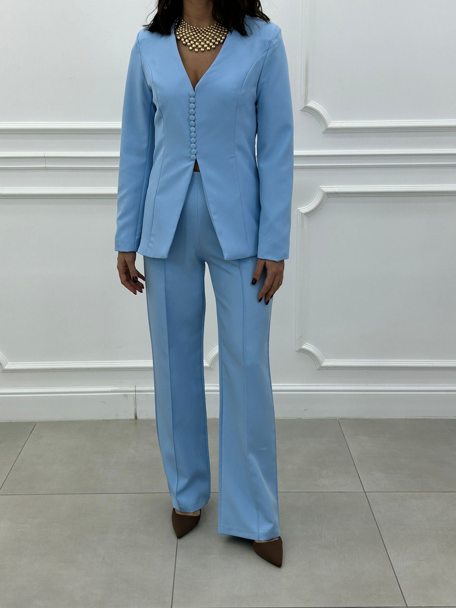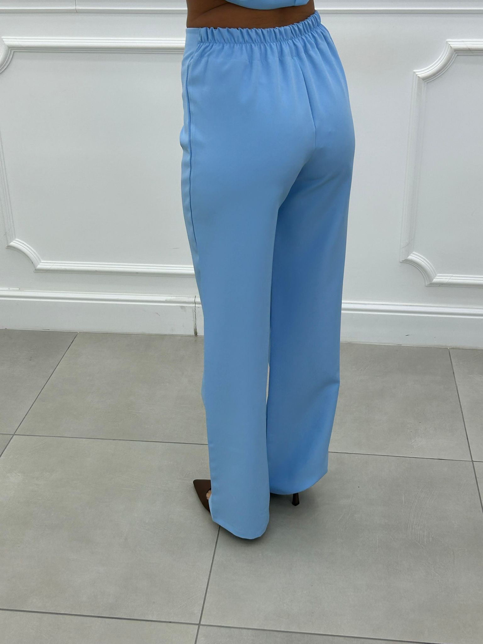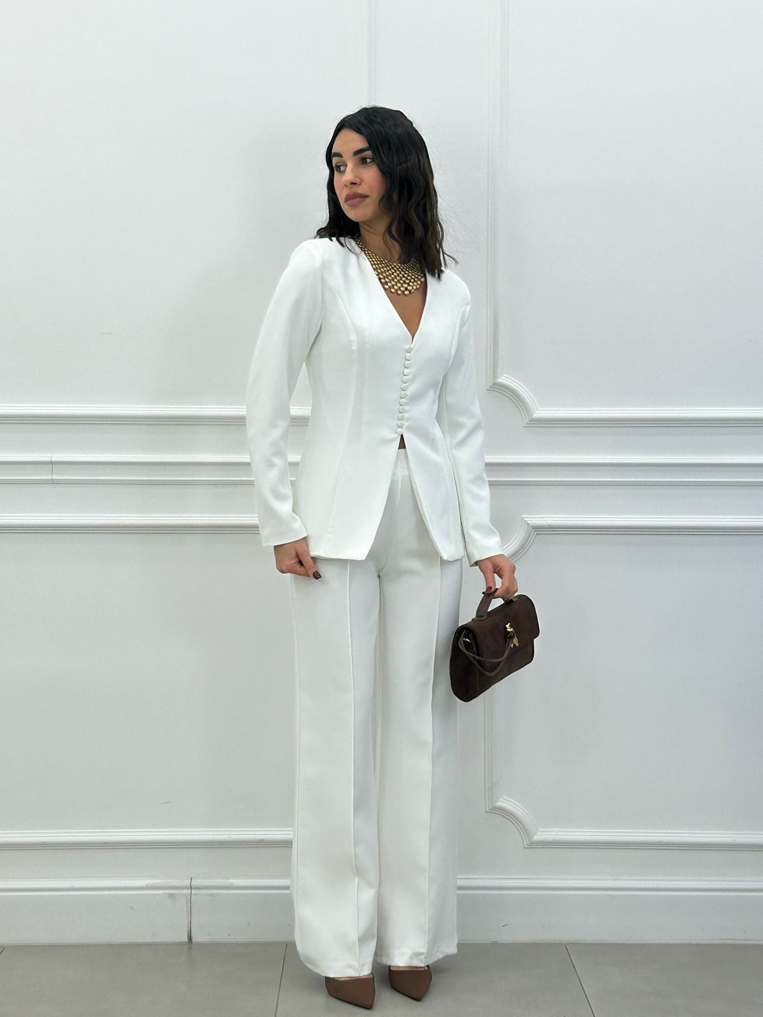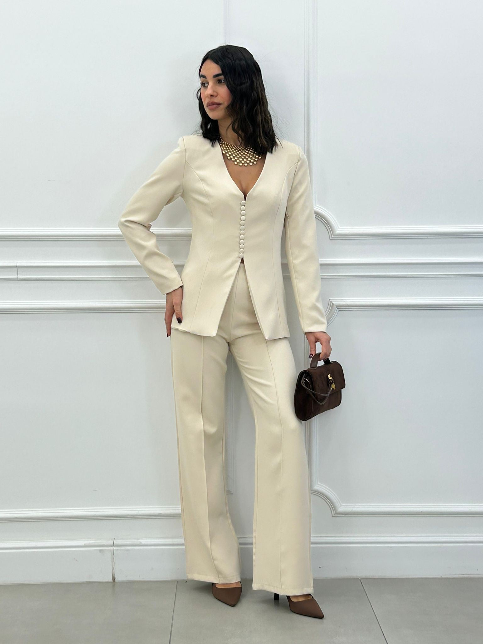 Coordinato, giacca con bottoncini e spalline (interno foderata), pantalone vita alta con elastico in vita