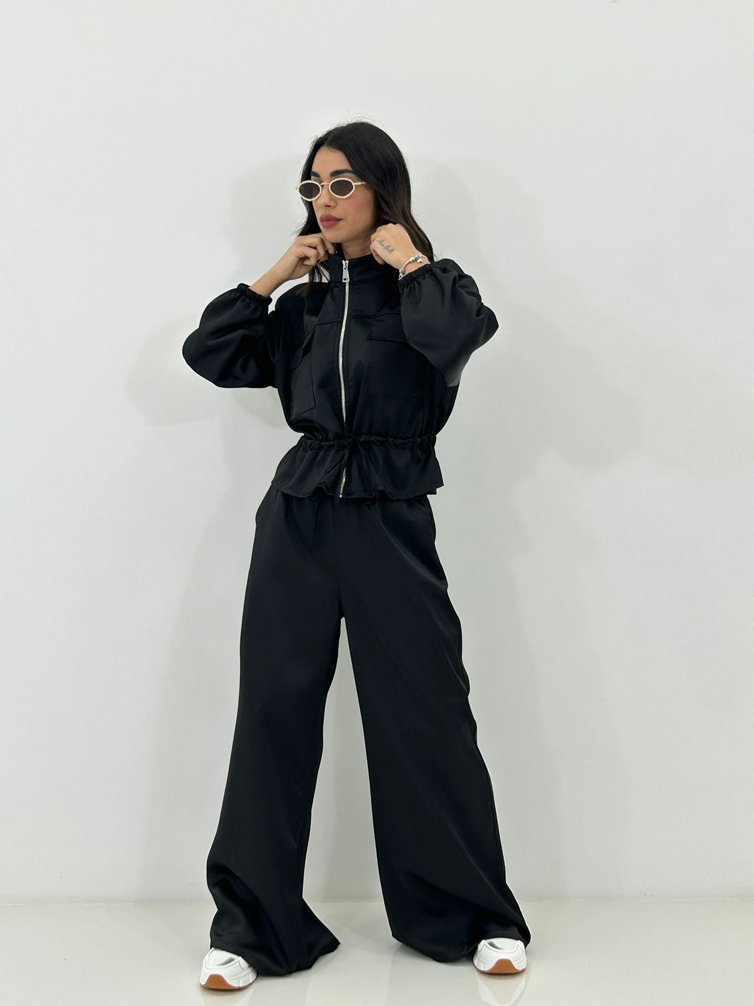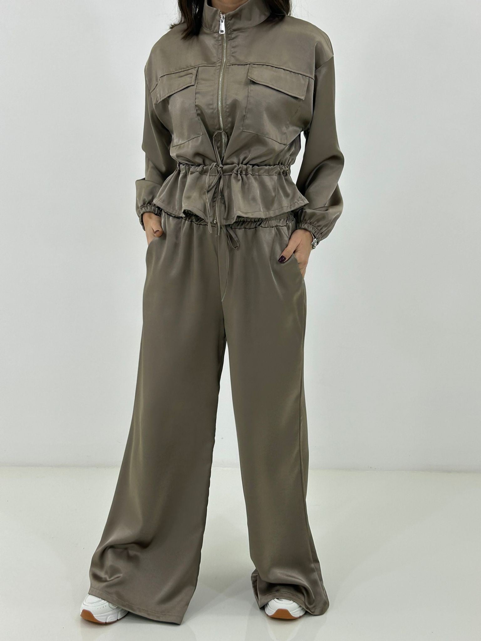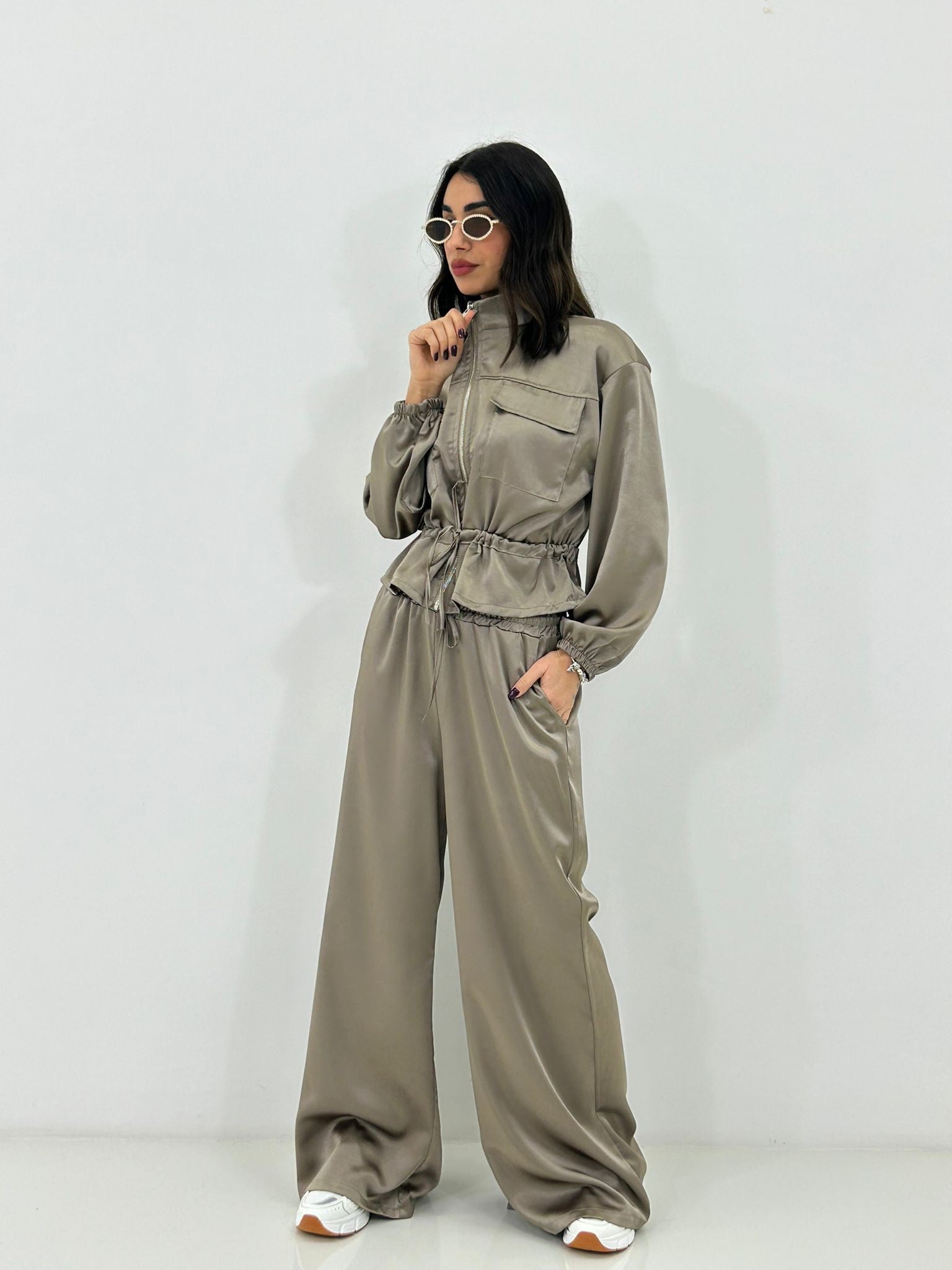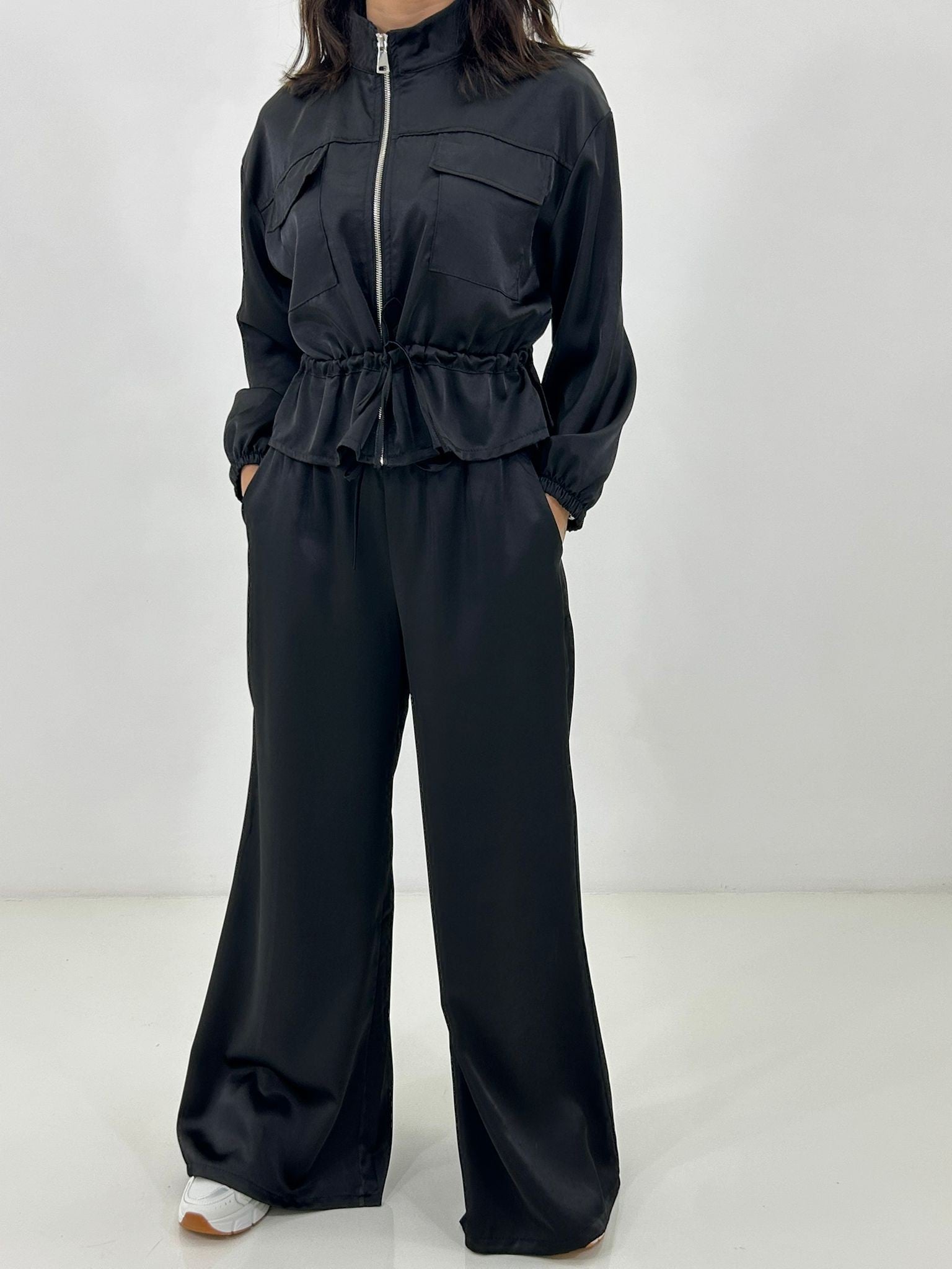 Coordinato in raso , giacchino con zip ,elastico in vita e regolabile, pantalone con elastico in vita e tasche