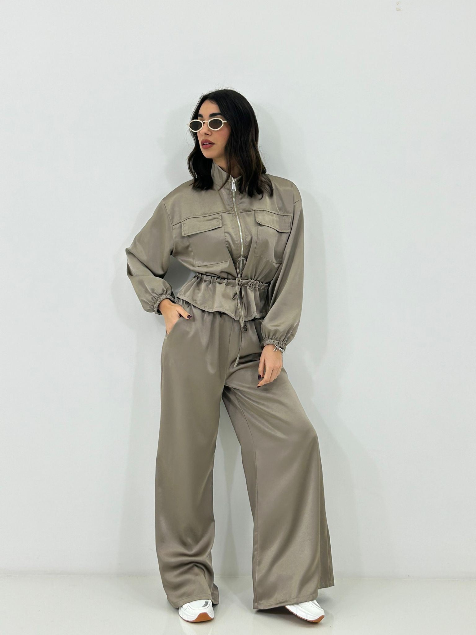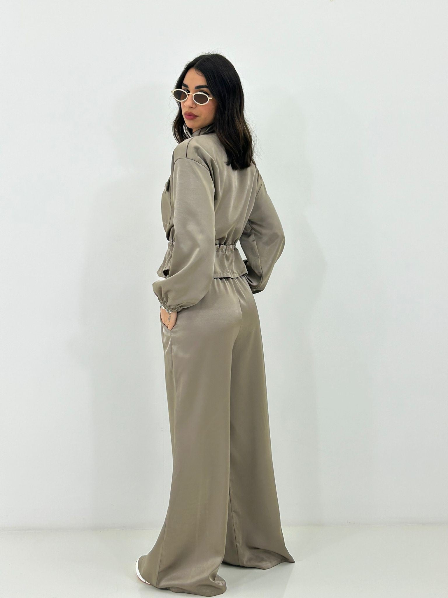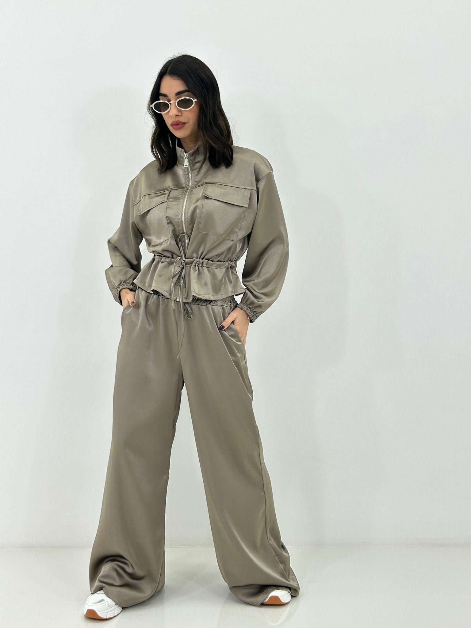 Coordinato in raso , giacchino con zip ,elastico in vita e regolabile, pantalone con elastico in vita e tasche