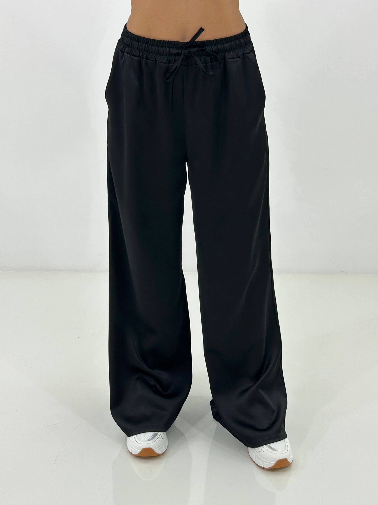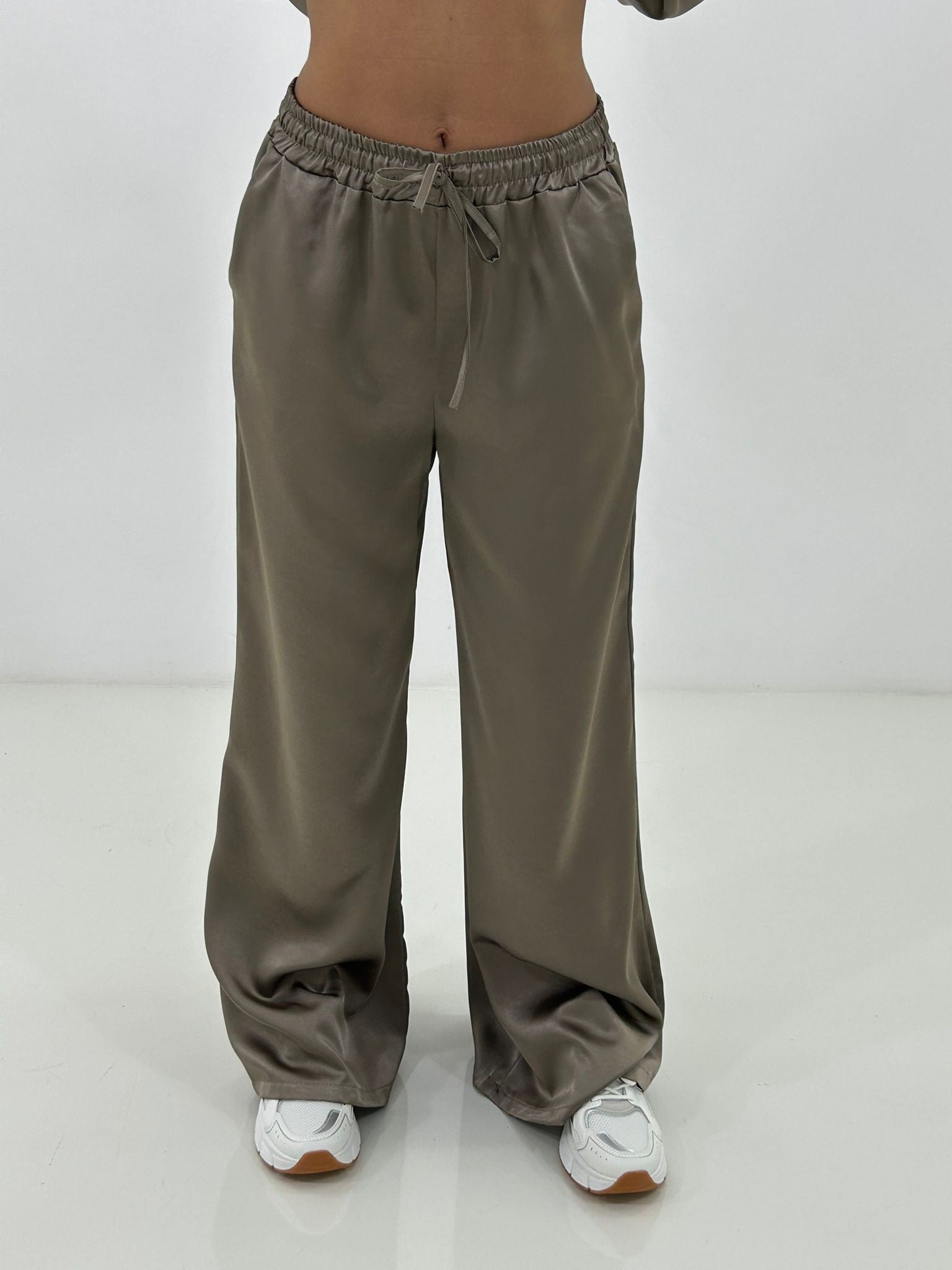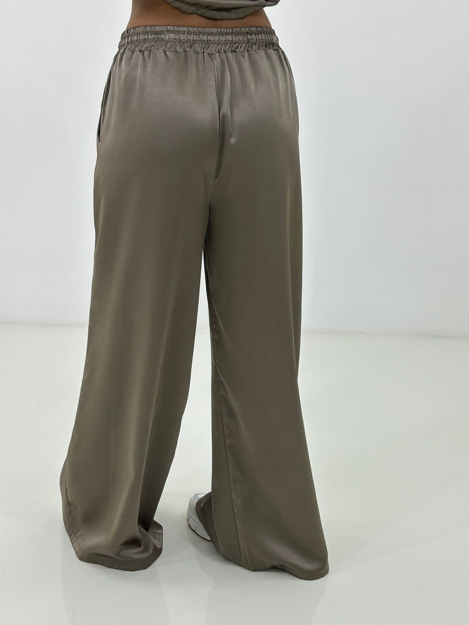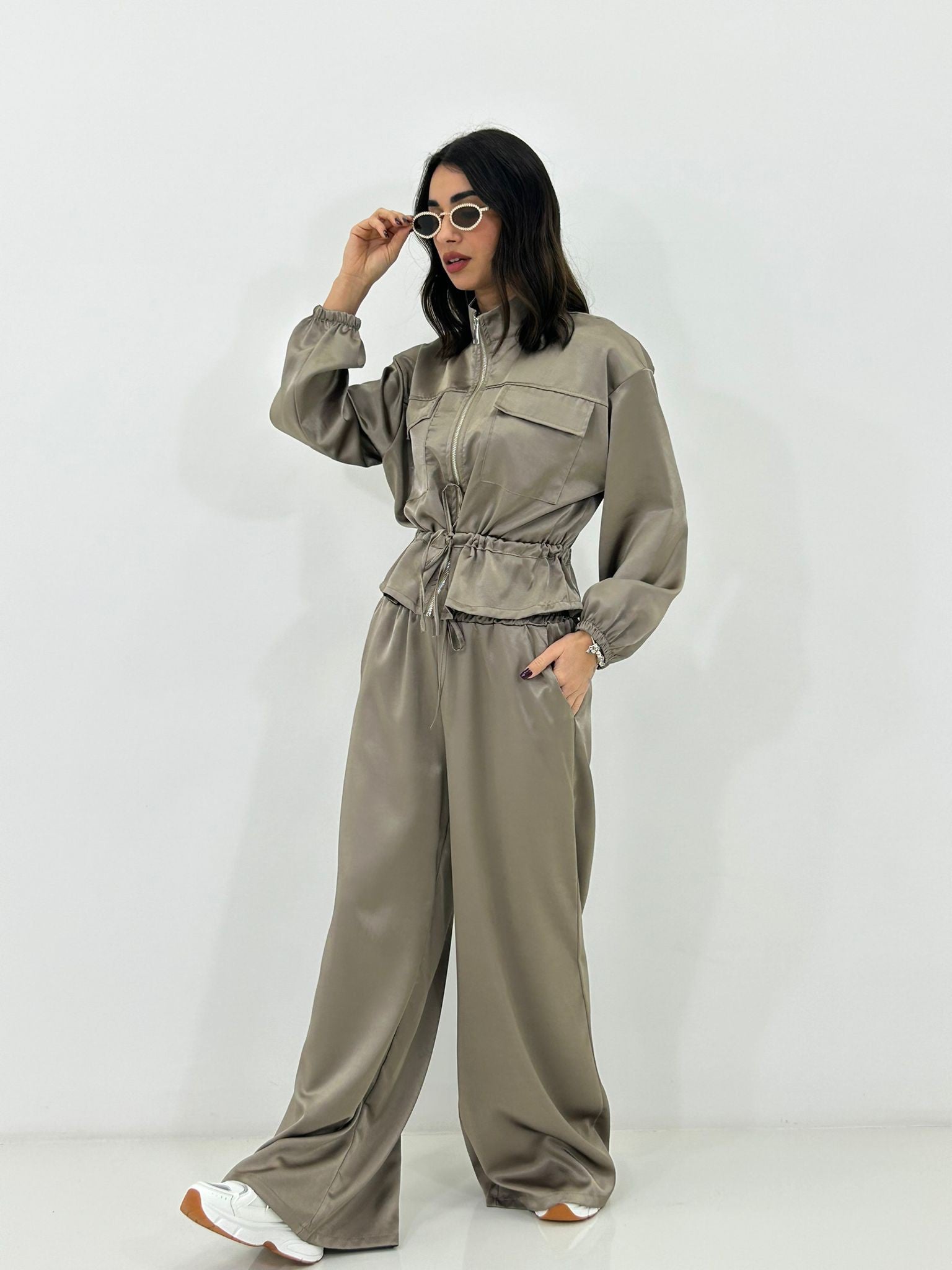 Coordinato in raso , giacchino con zip ,elastico in vita e regolabile, pantalone con elastico in vita e tasche