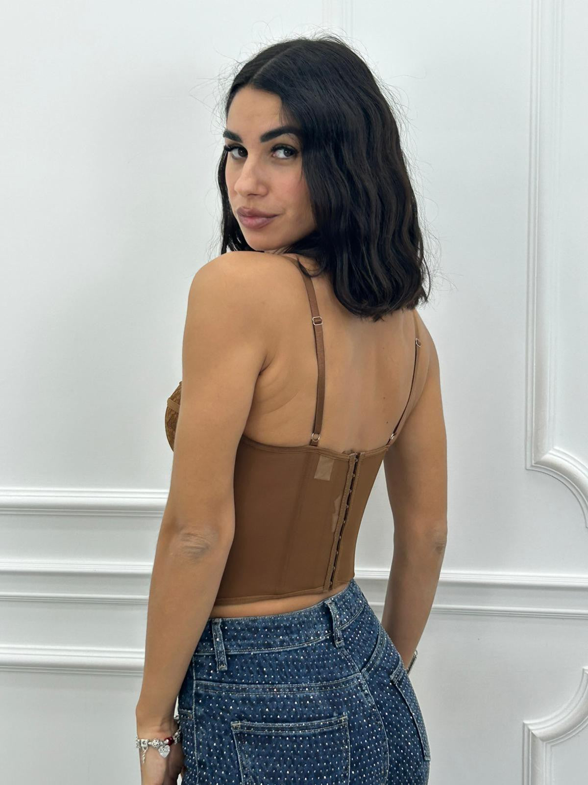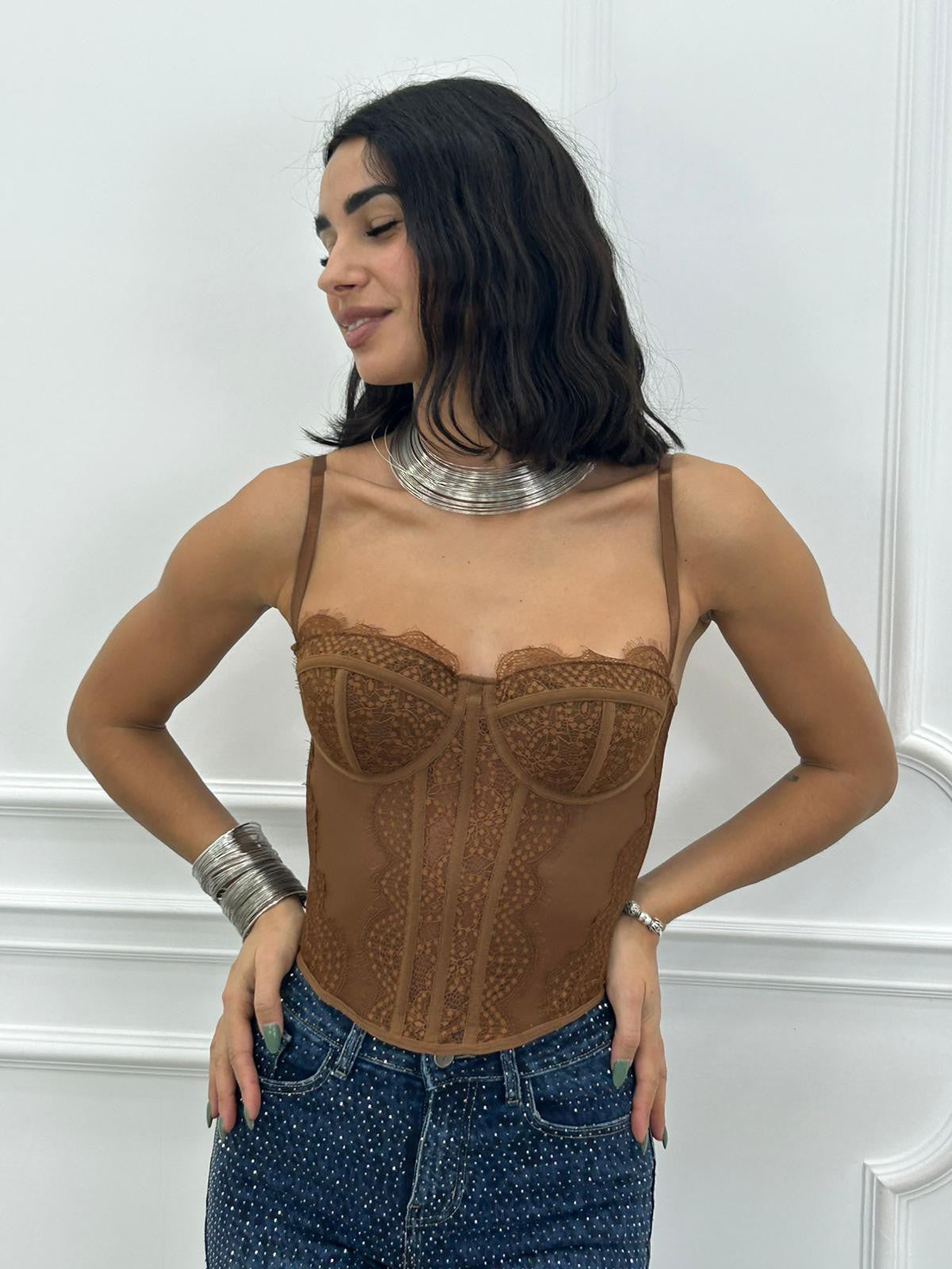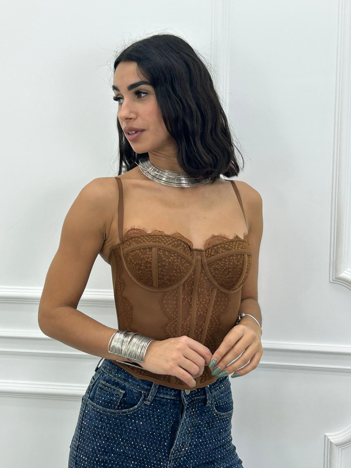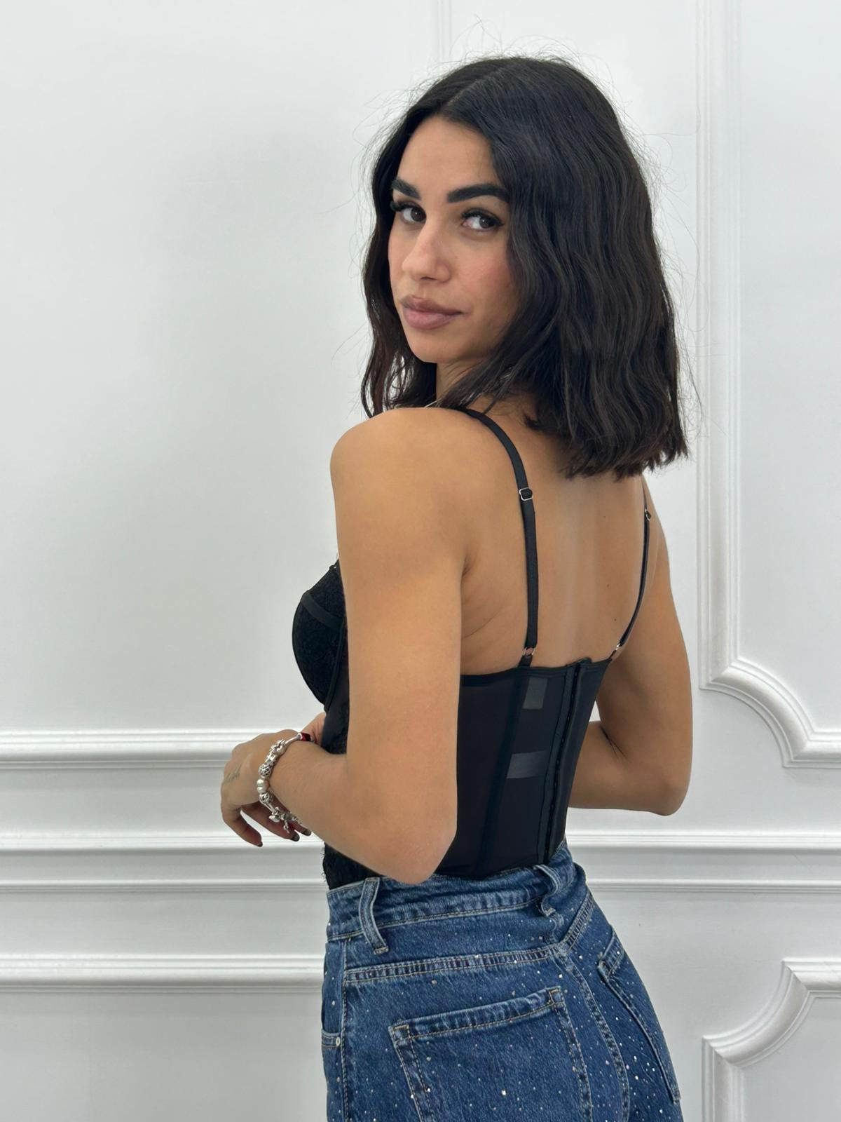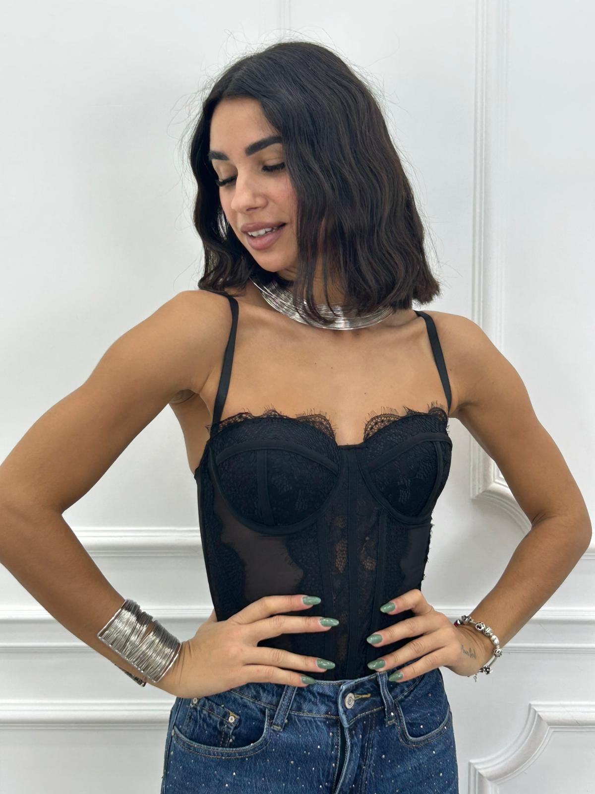 Corsetto in pizzo con trasparenza , coppe al seno , bretelline regolbili