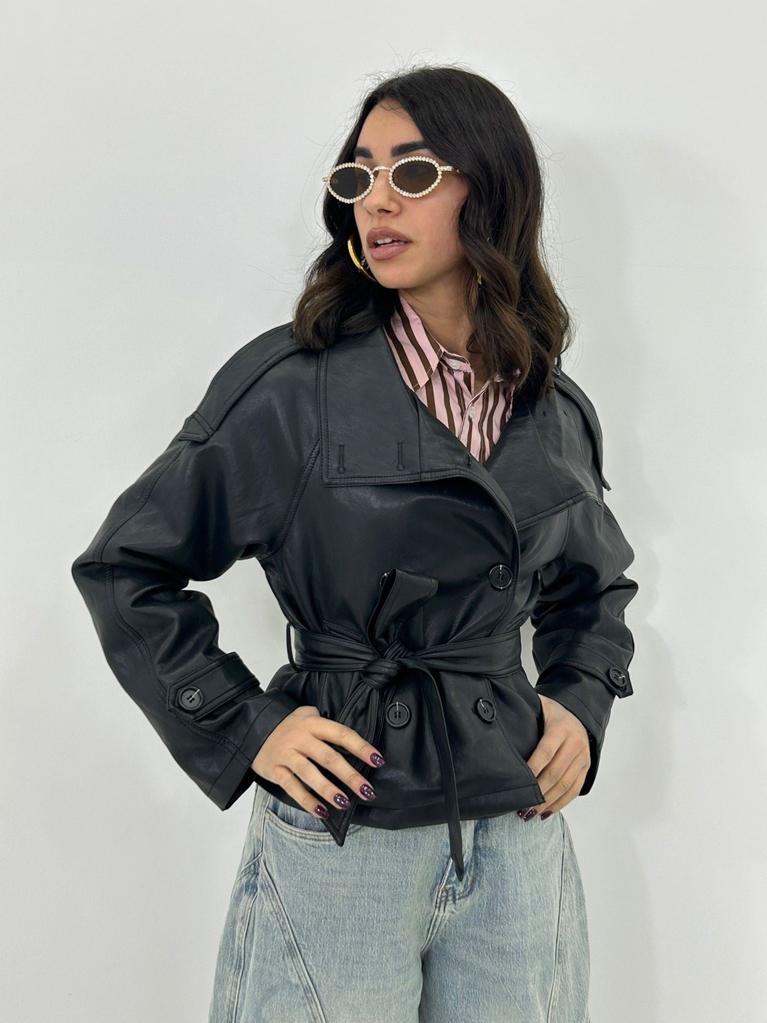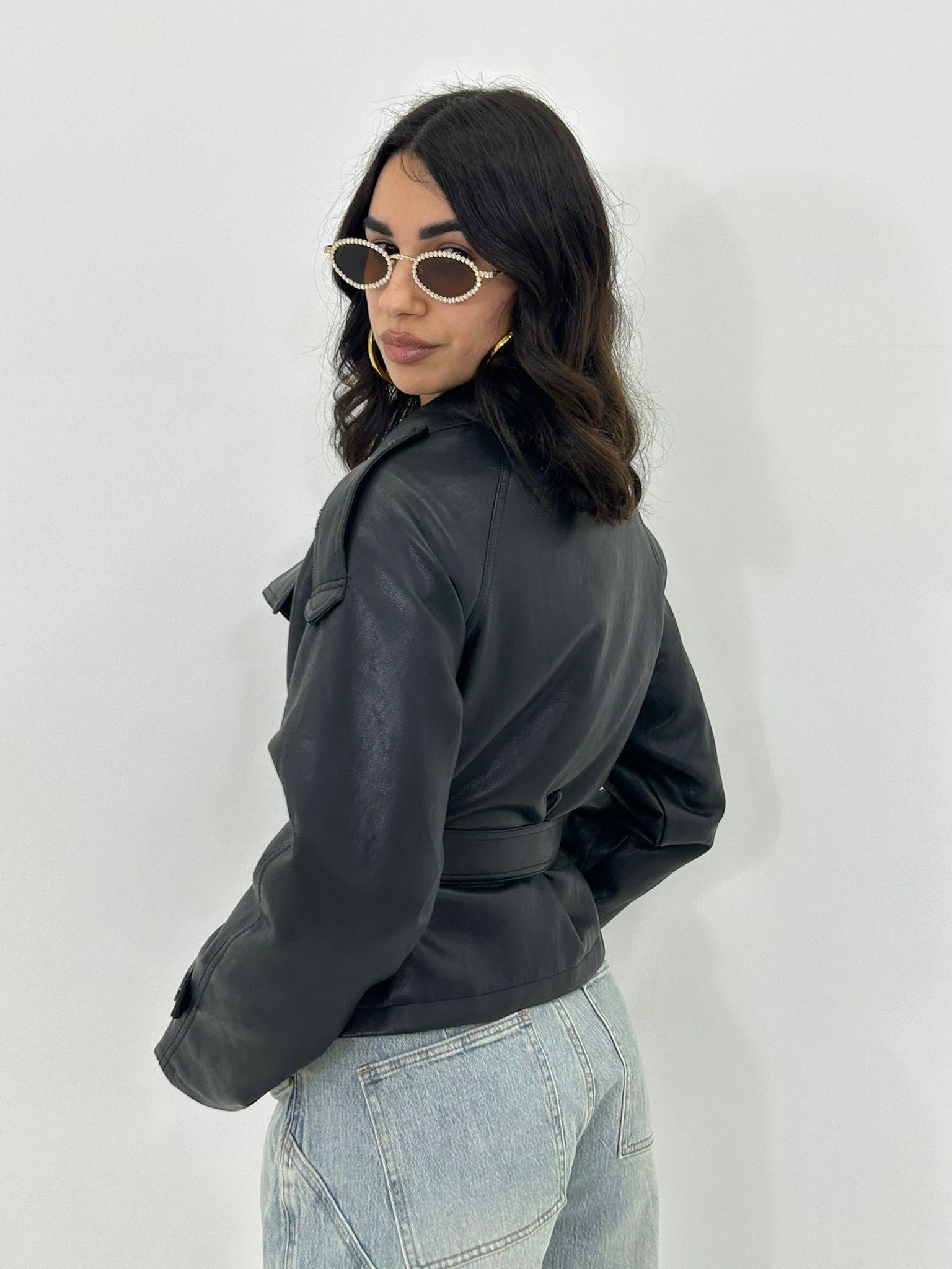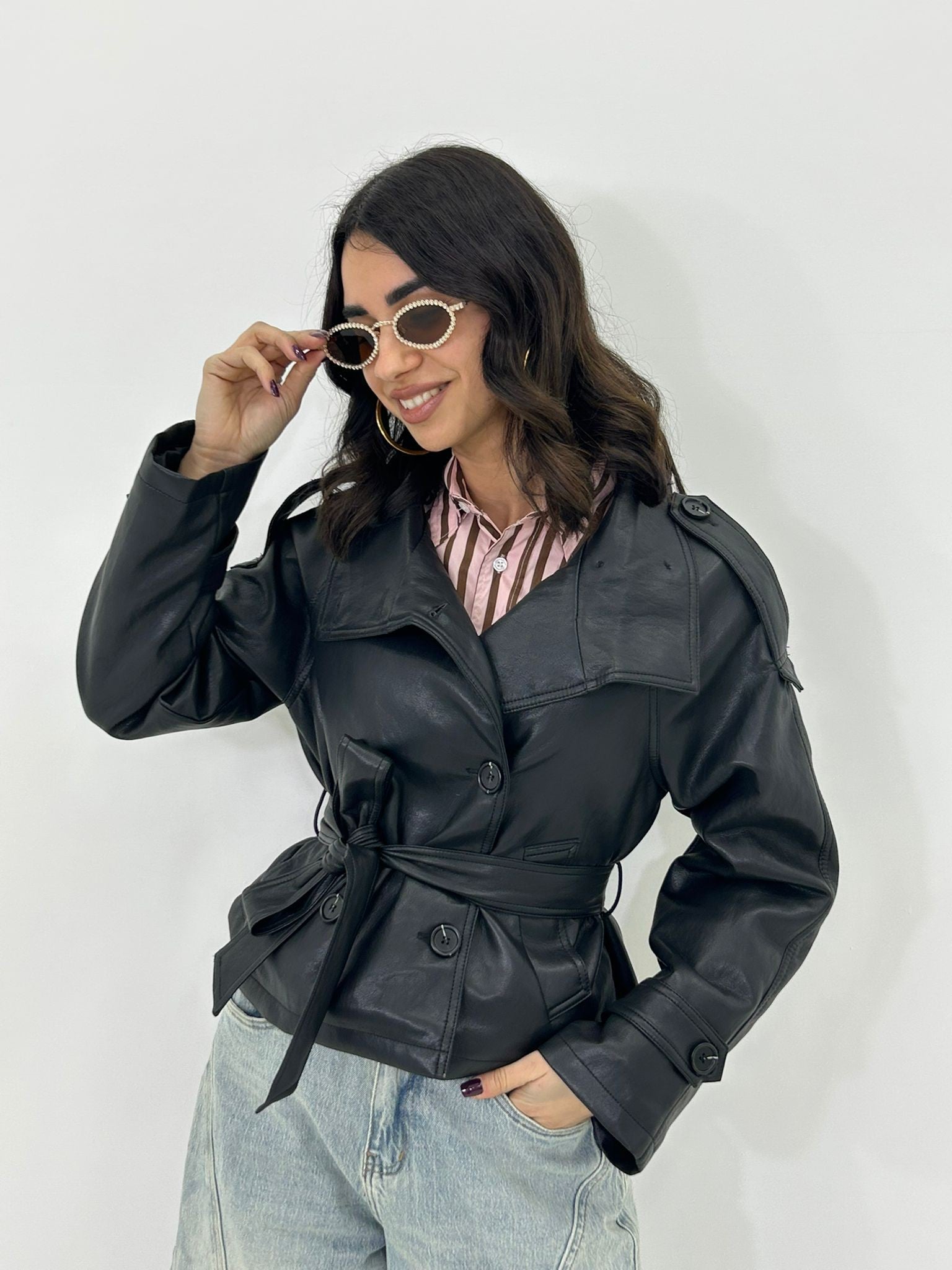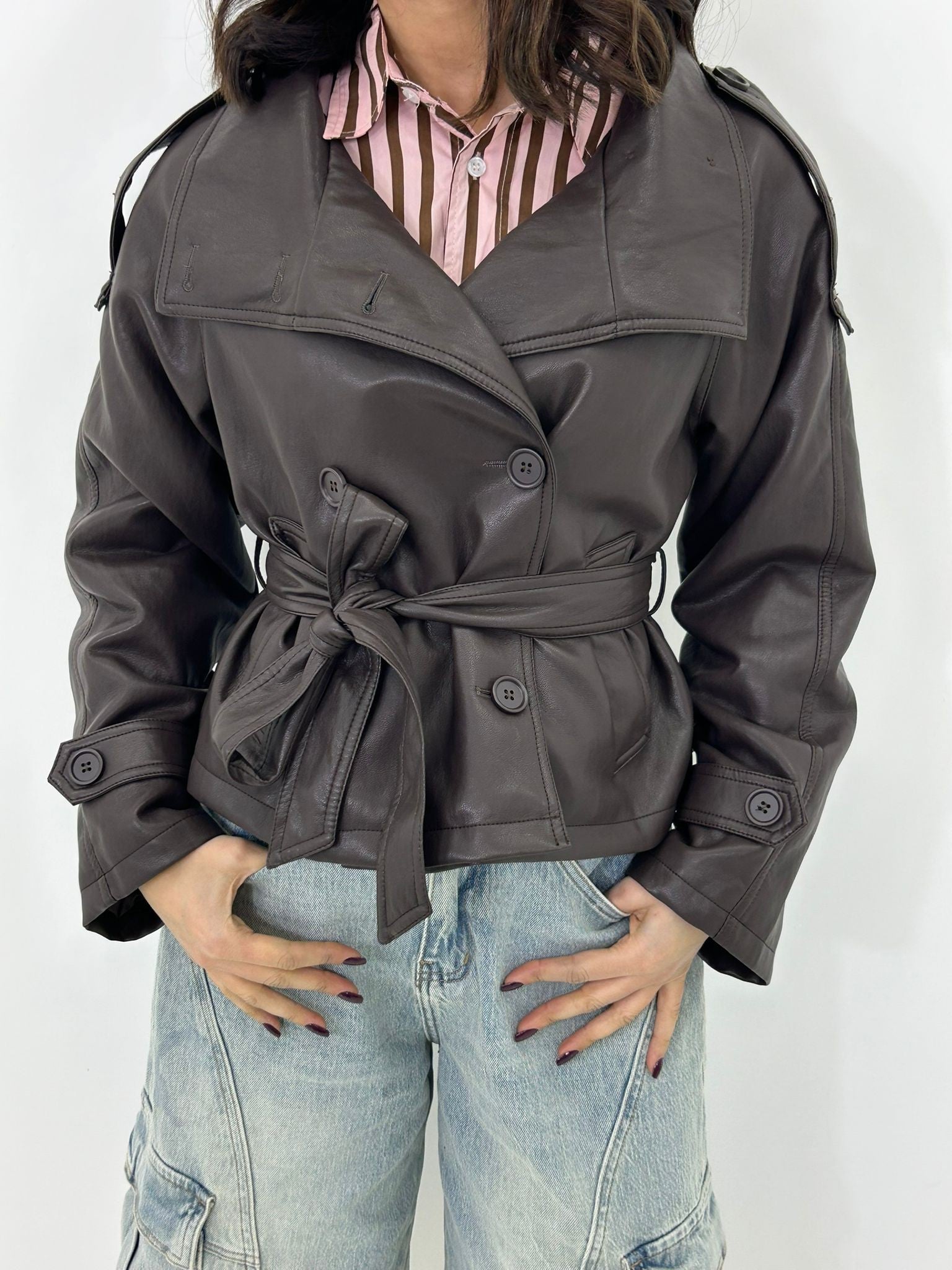 Trench ecopelle con bottoni , cintura e tasche , interno foderato