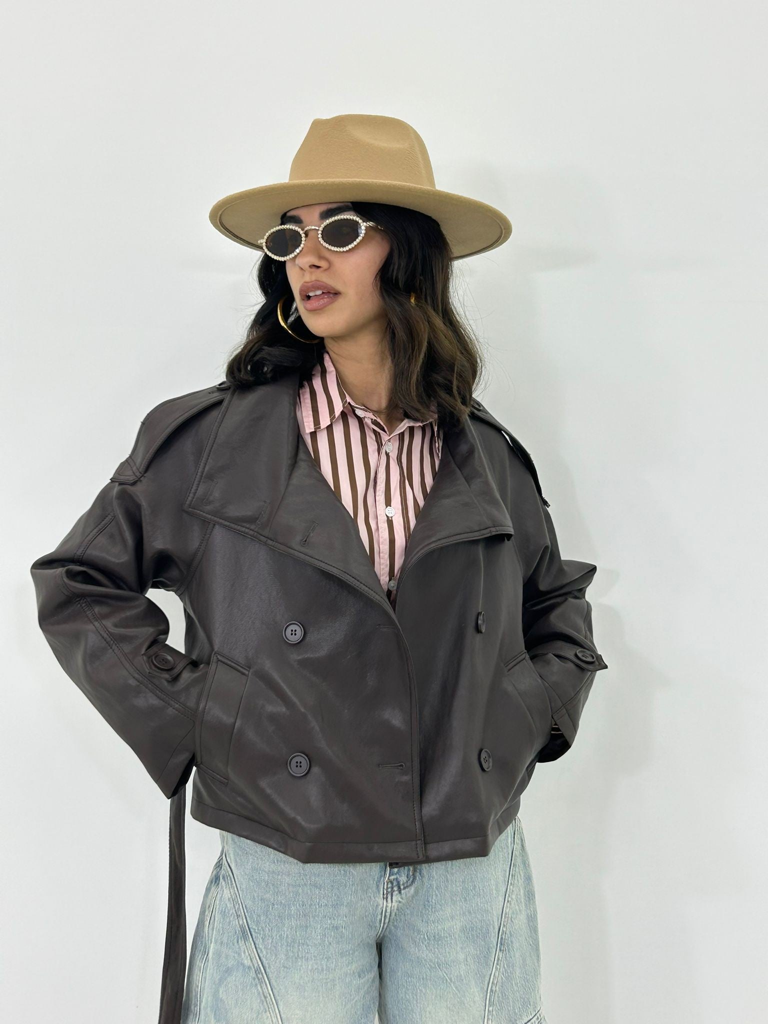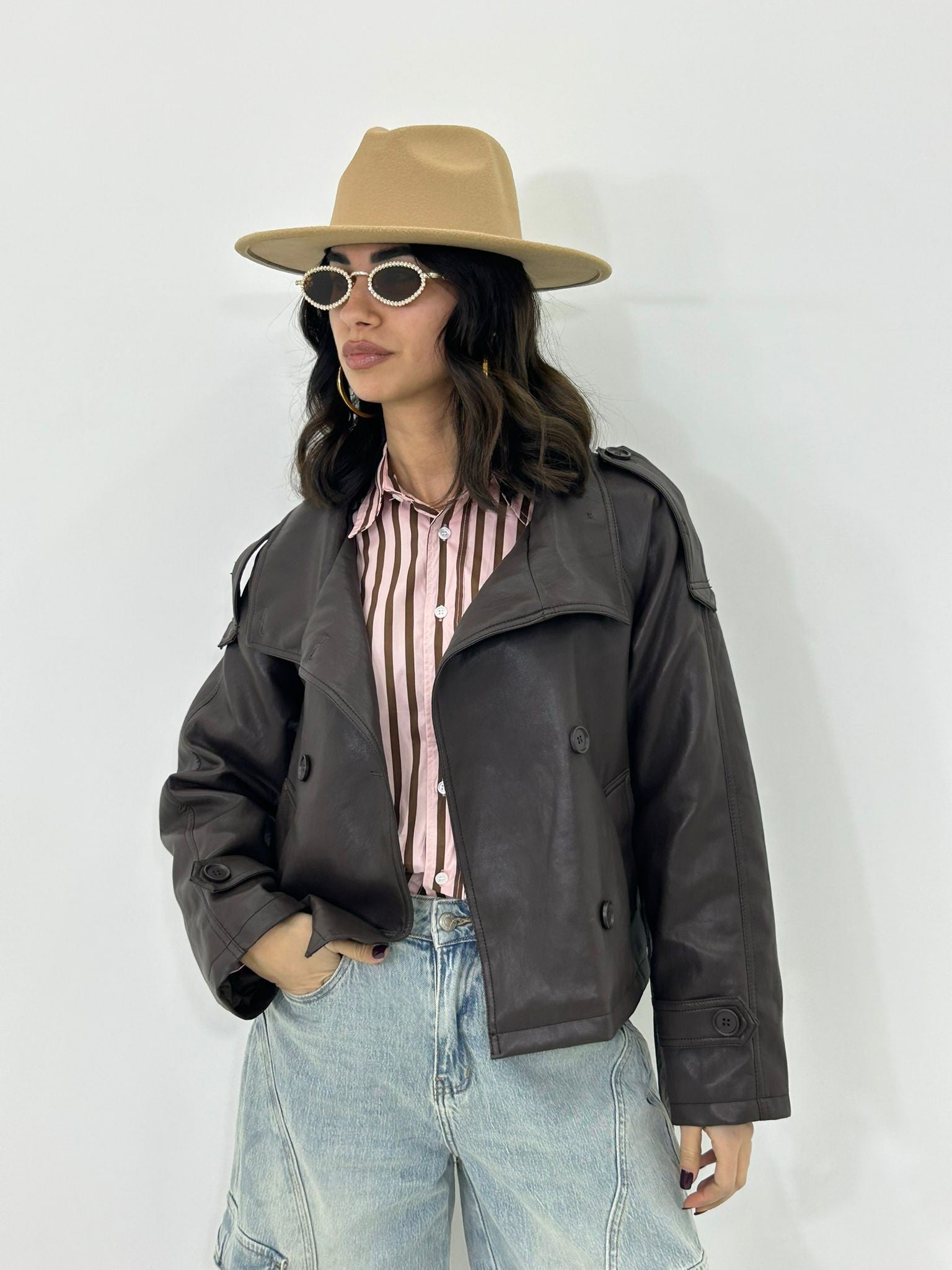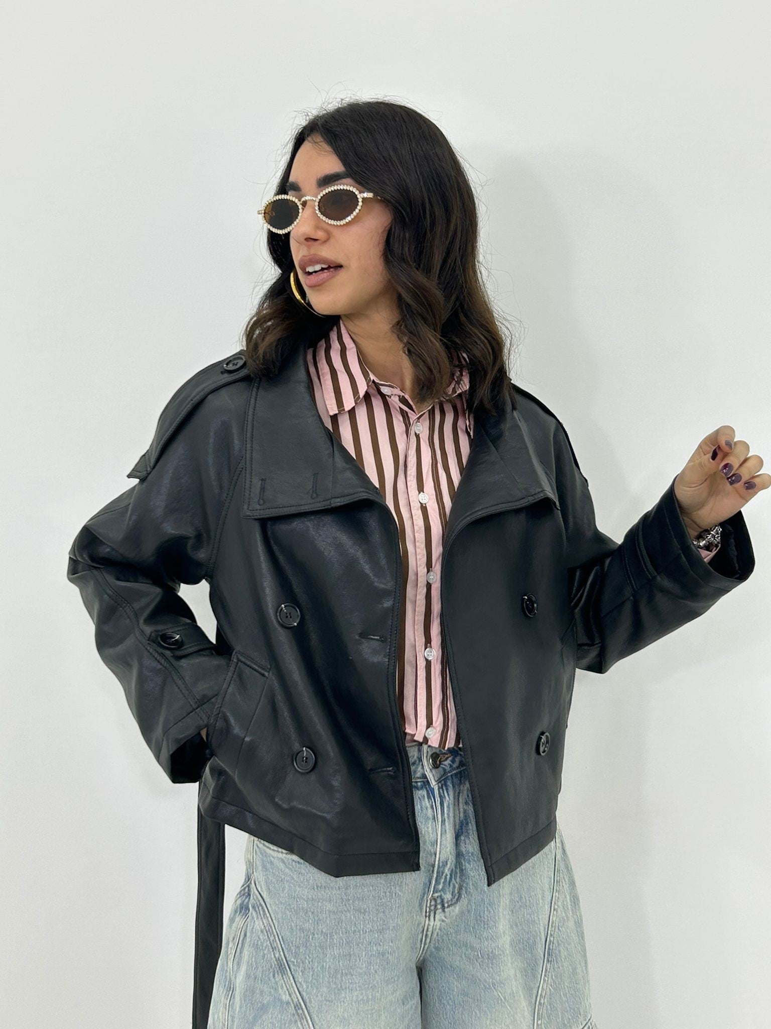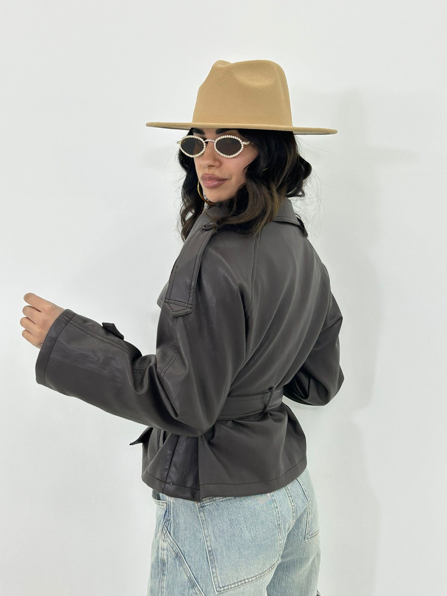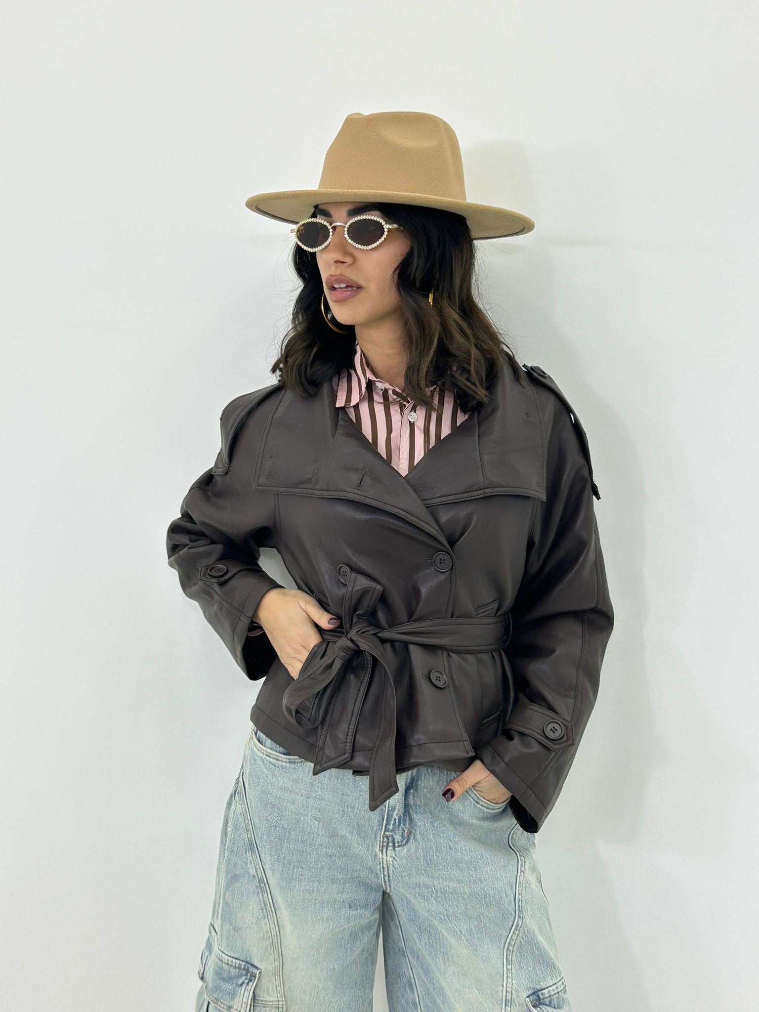 Trench ecopelle con bottoni , cintura e tasche , interno foderato
