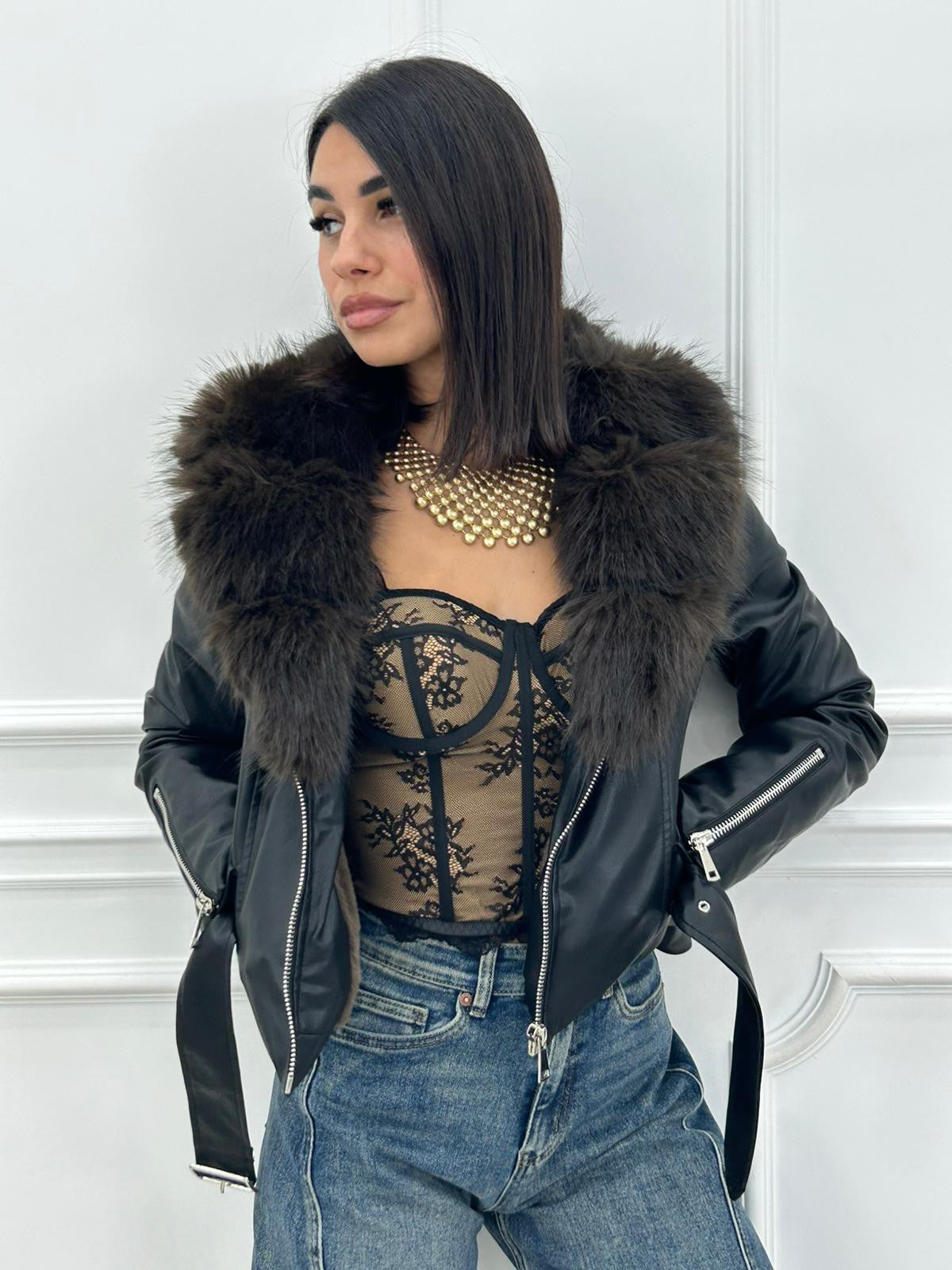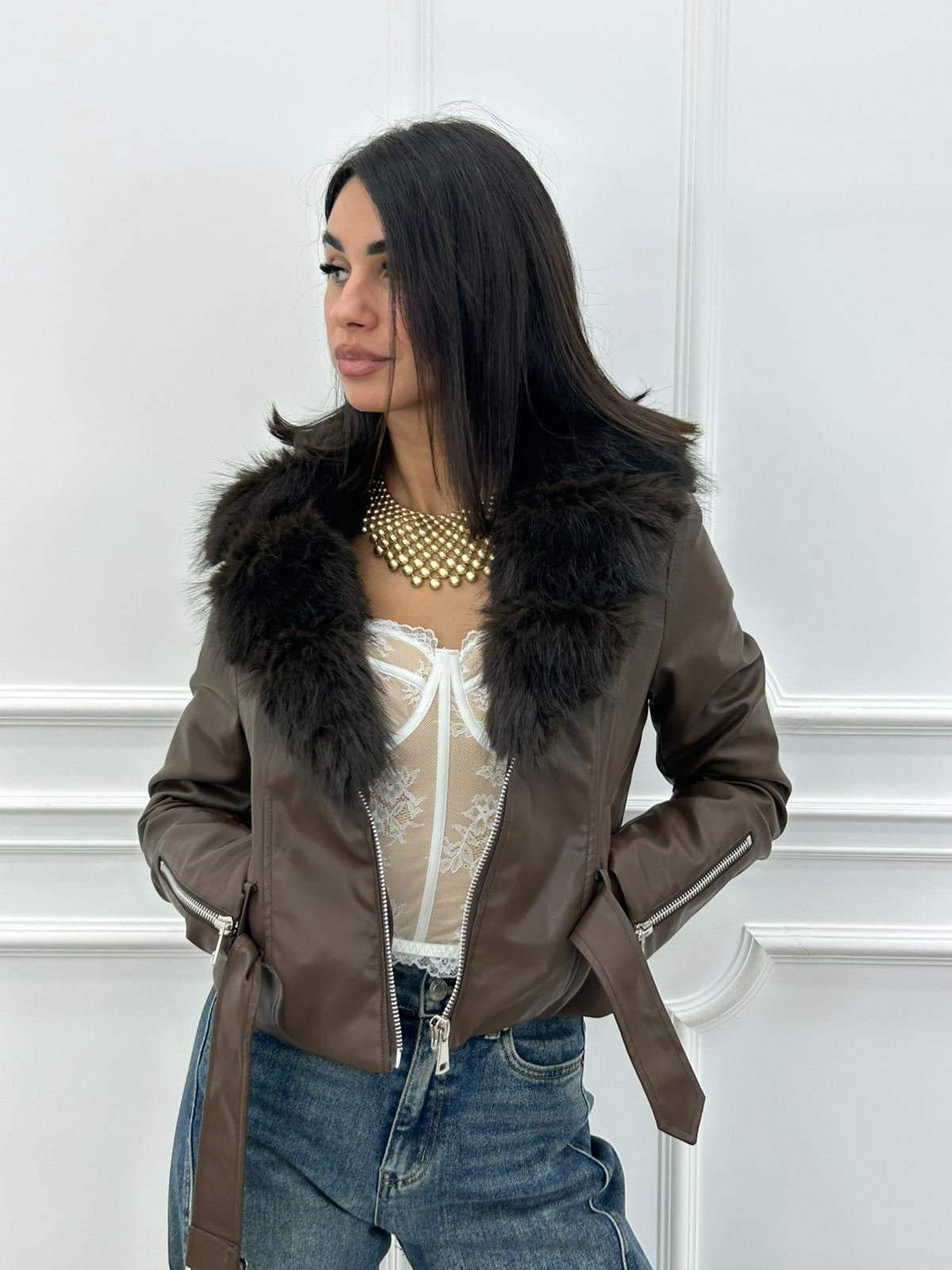 Giubbino ecopelle con collo pelliccia , cintura in vita ,interno pelliccia