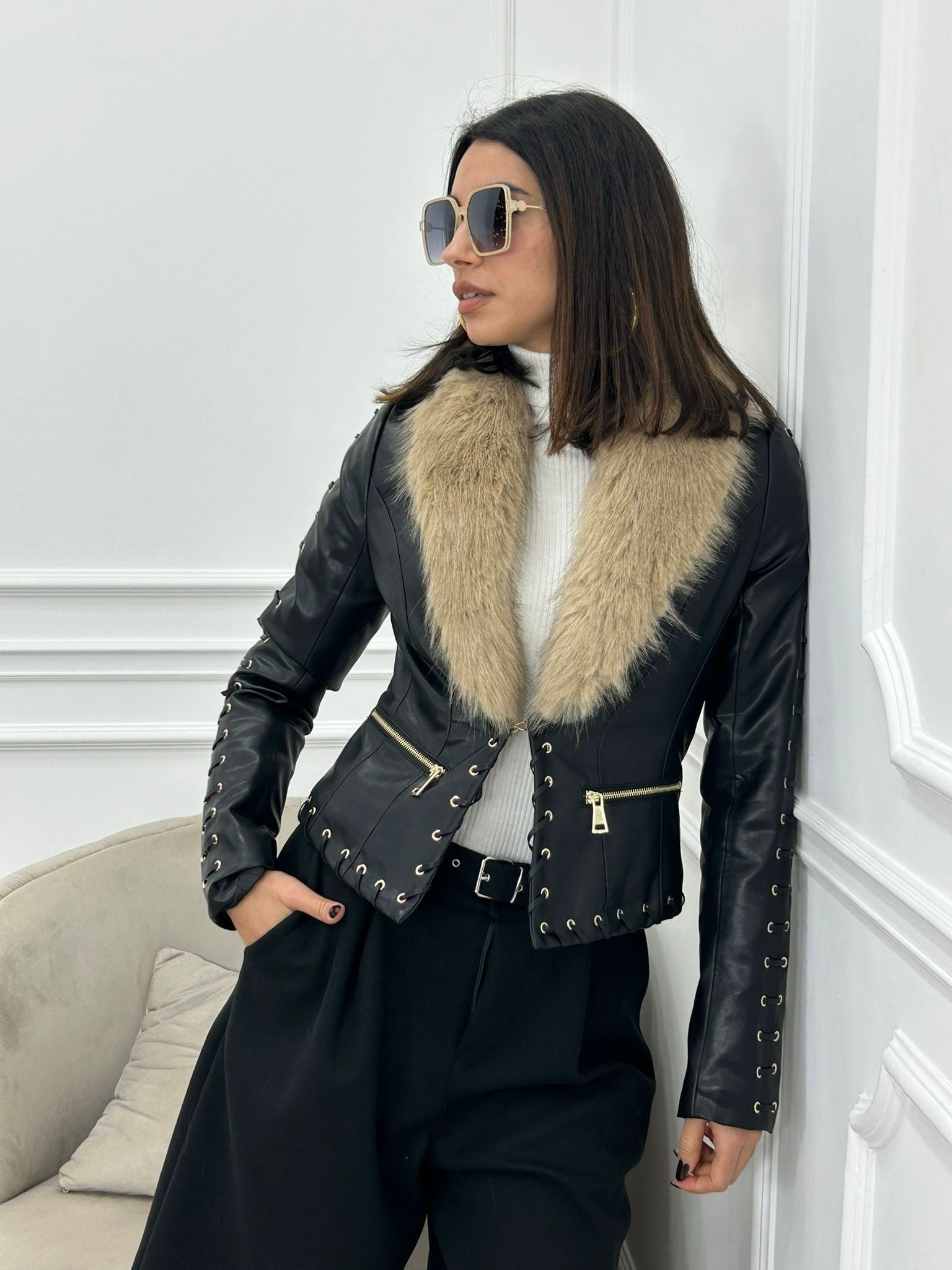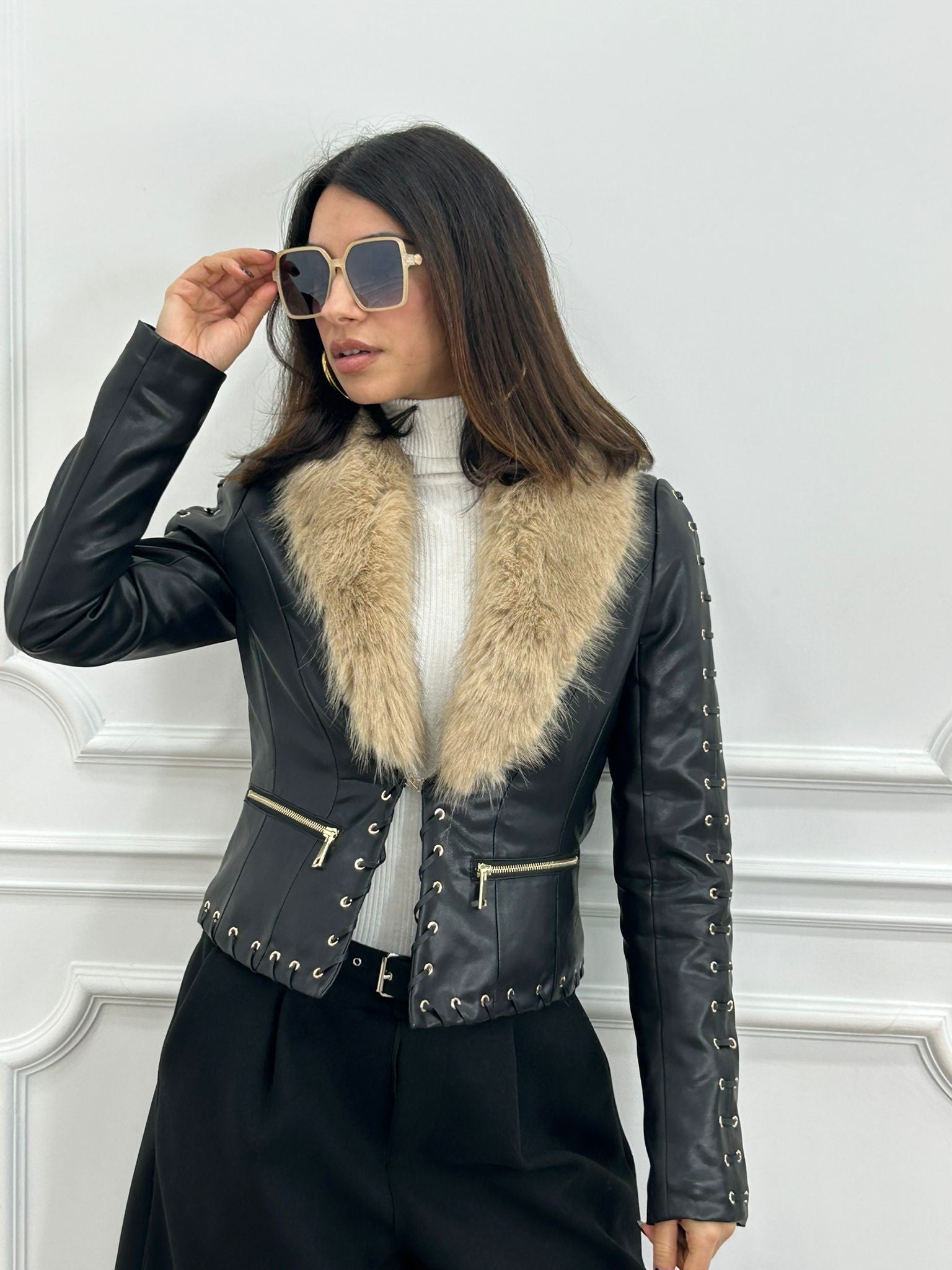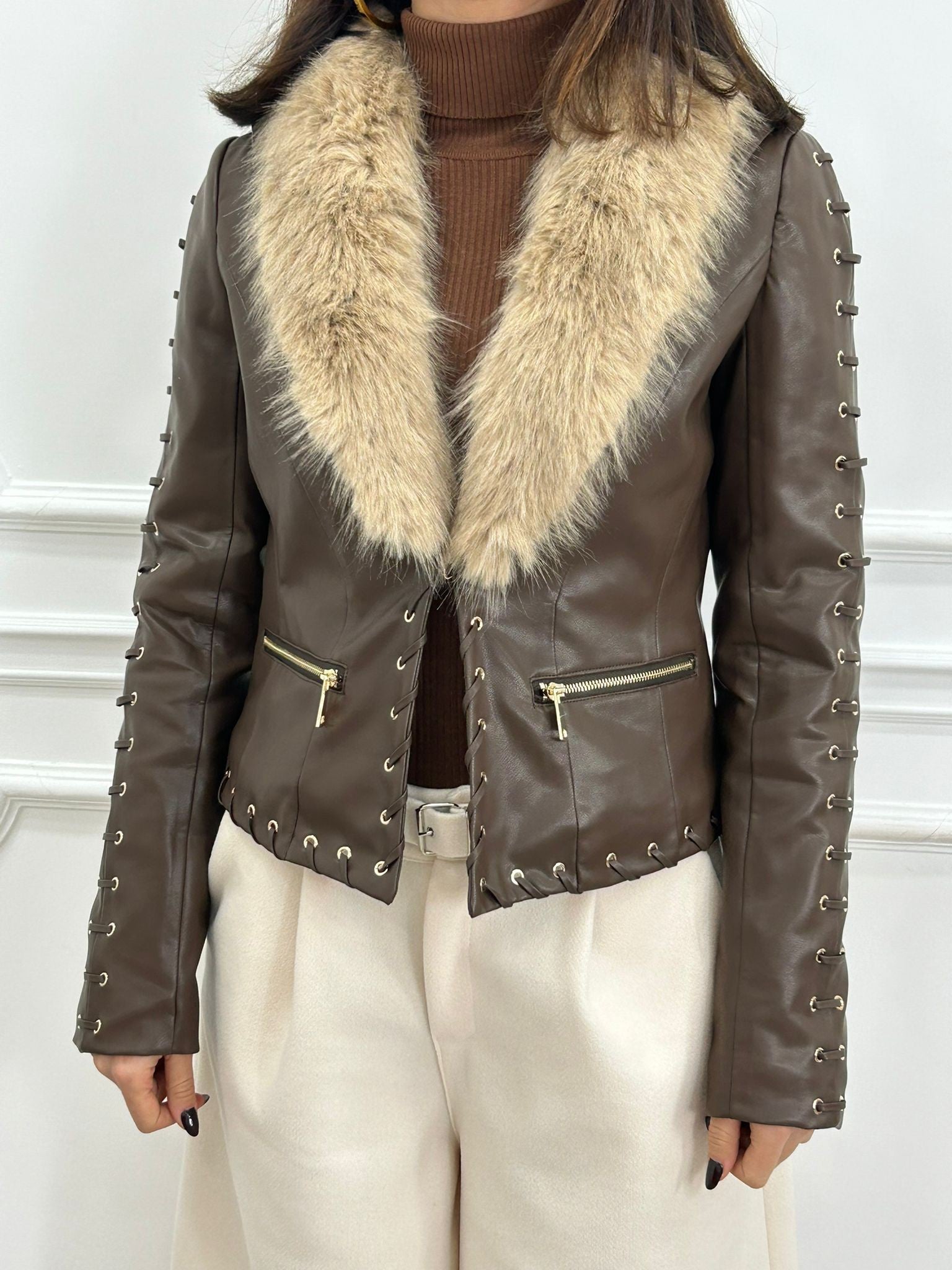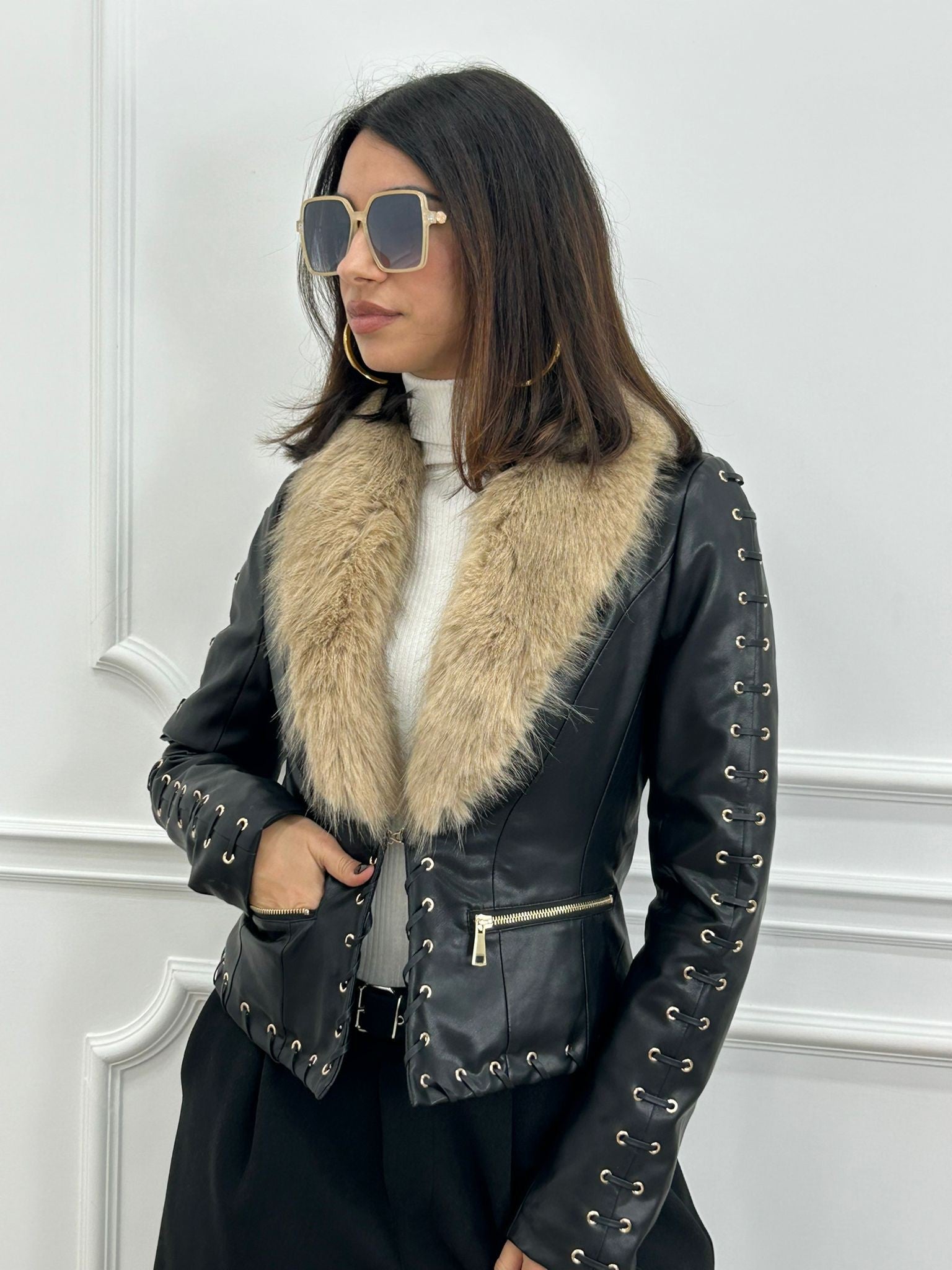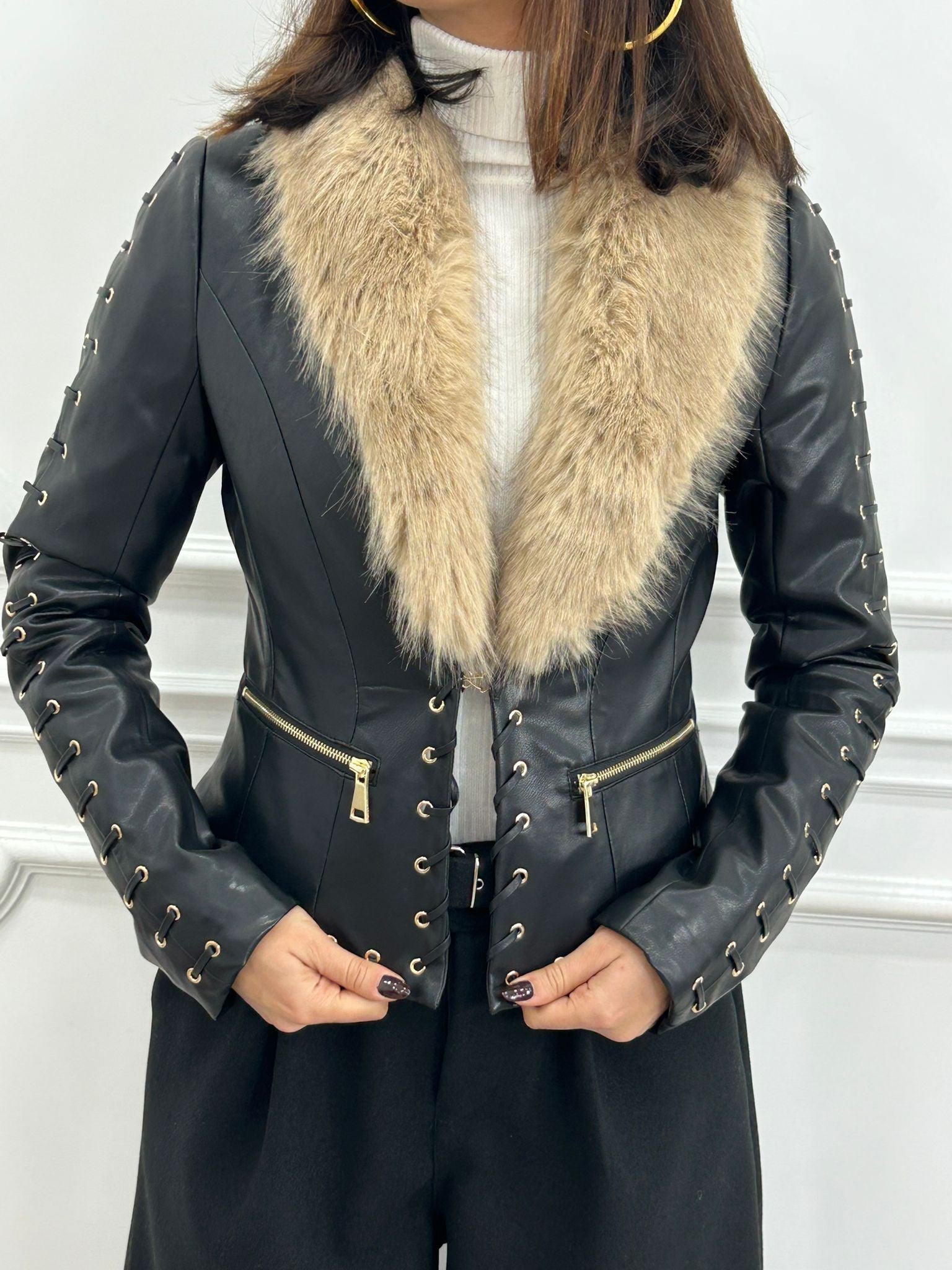 Giubbino ecopelle con stringhe e pelliccia , interno imbottito