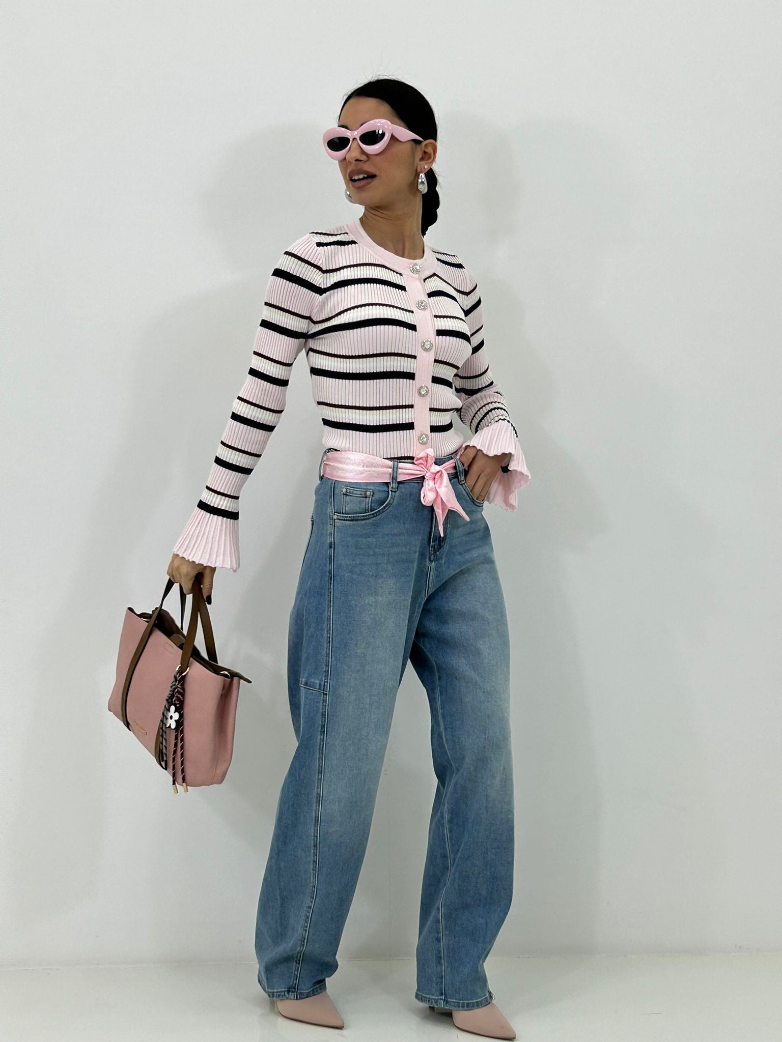 Jeans wide leg con foulard rosa