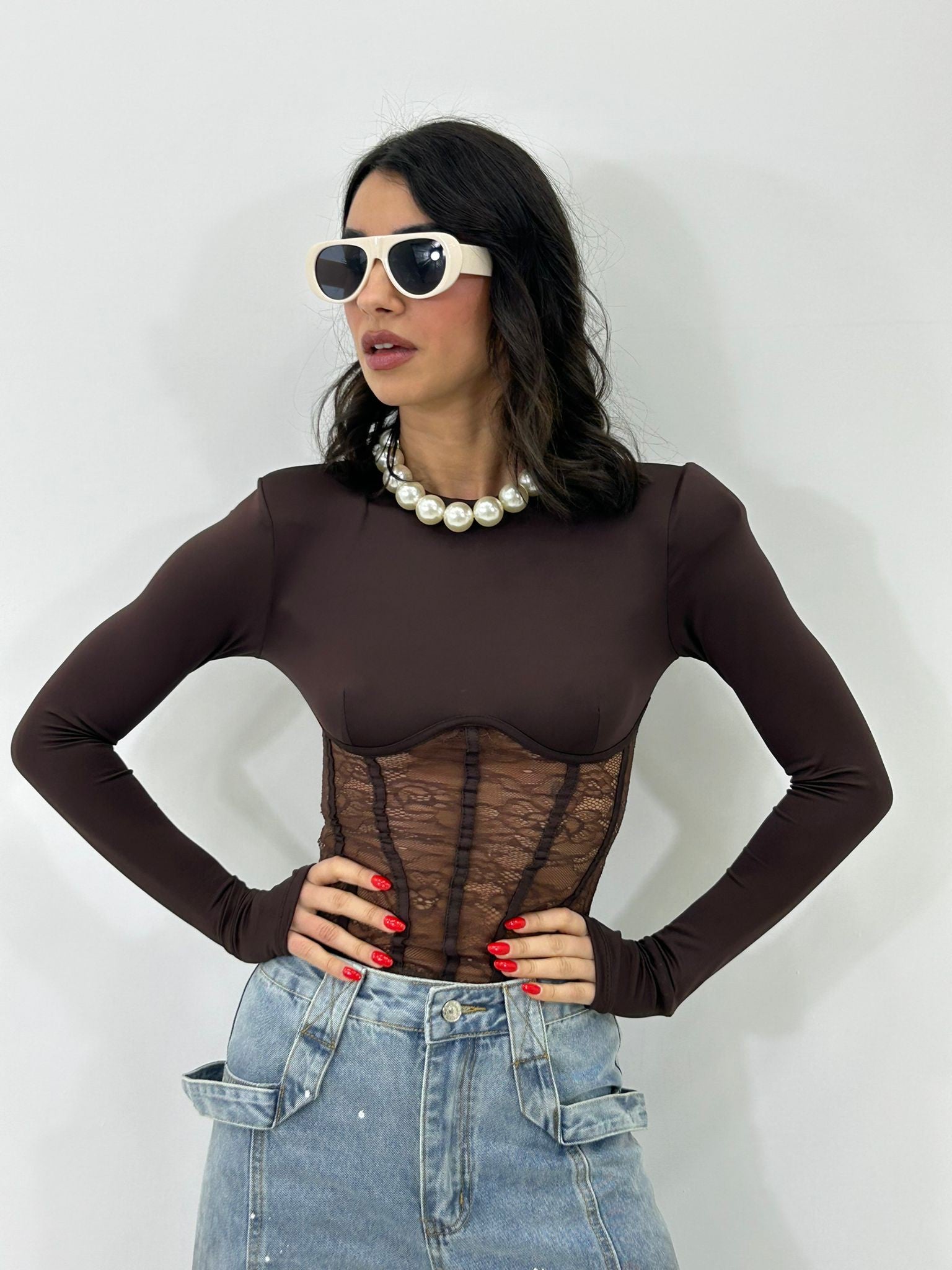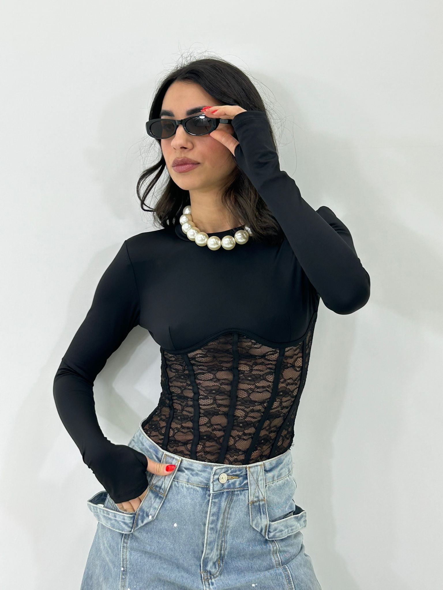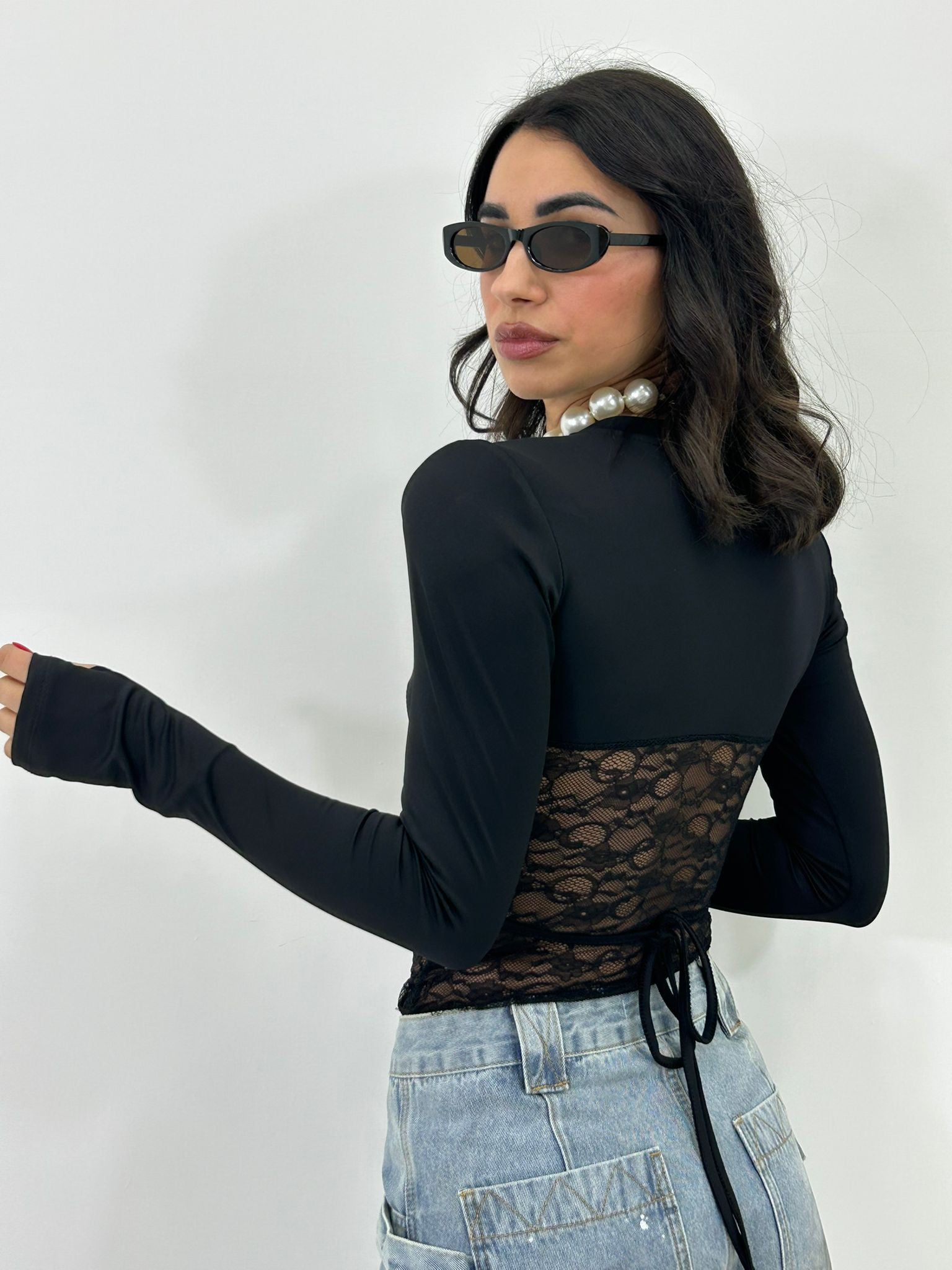 Maglia velata manica guanto con dettagli in pizzo