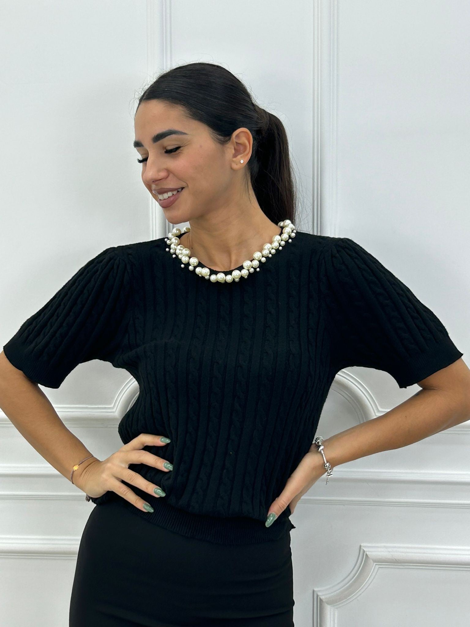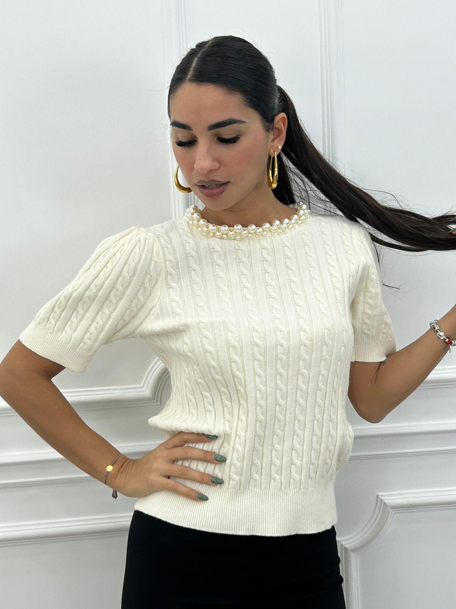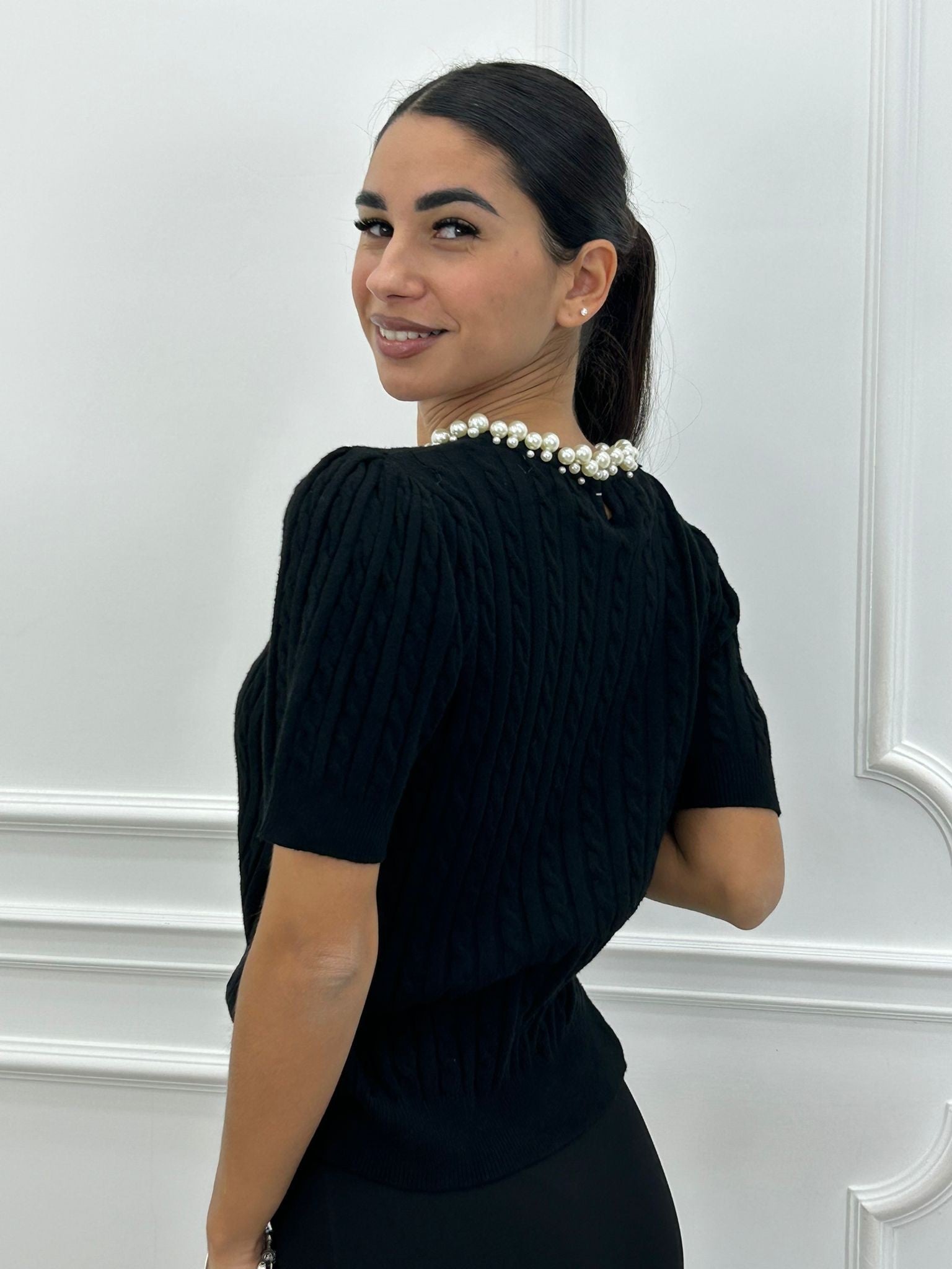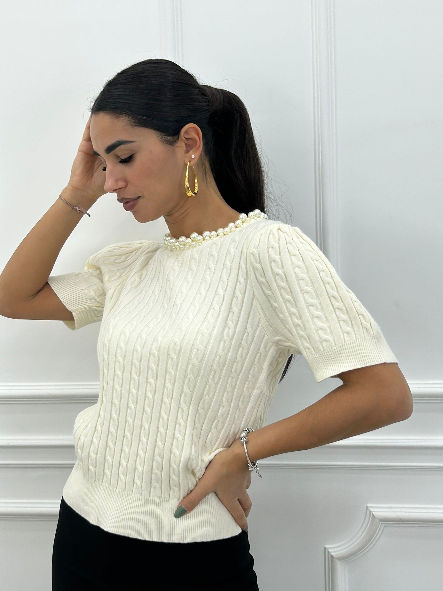 Maglia manica 3/4 trama treccia e colletto con perline