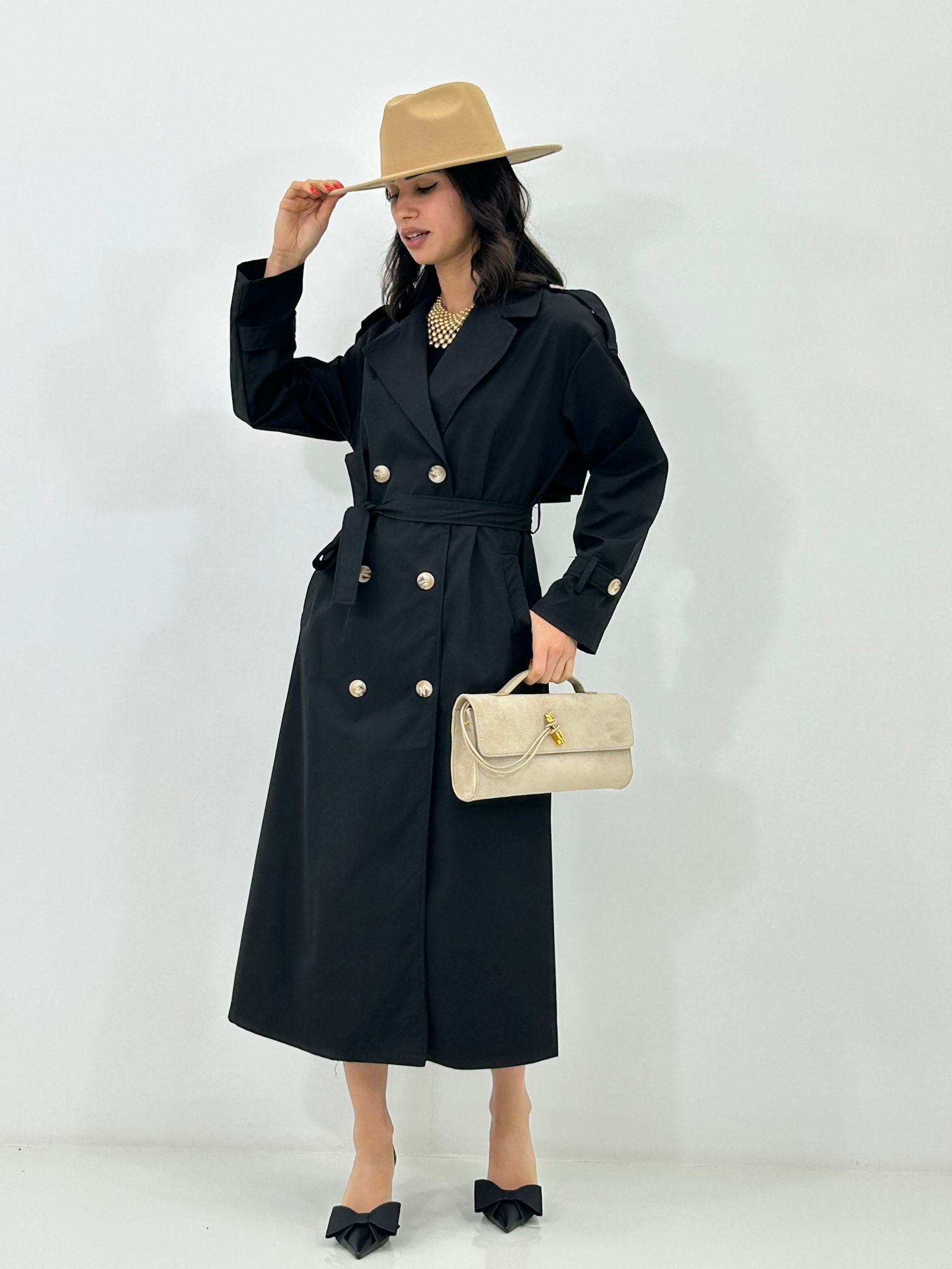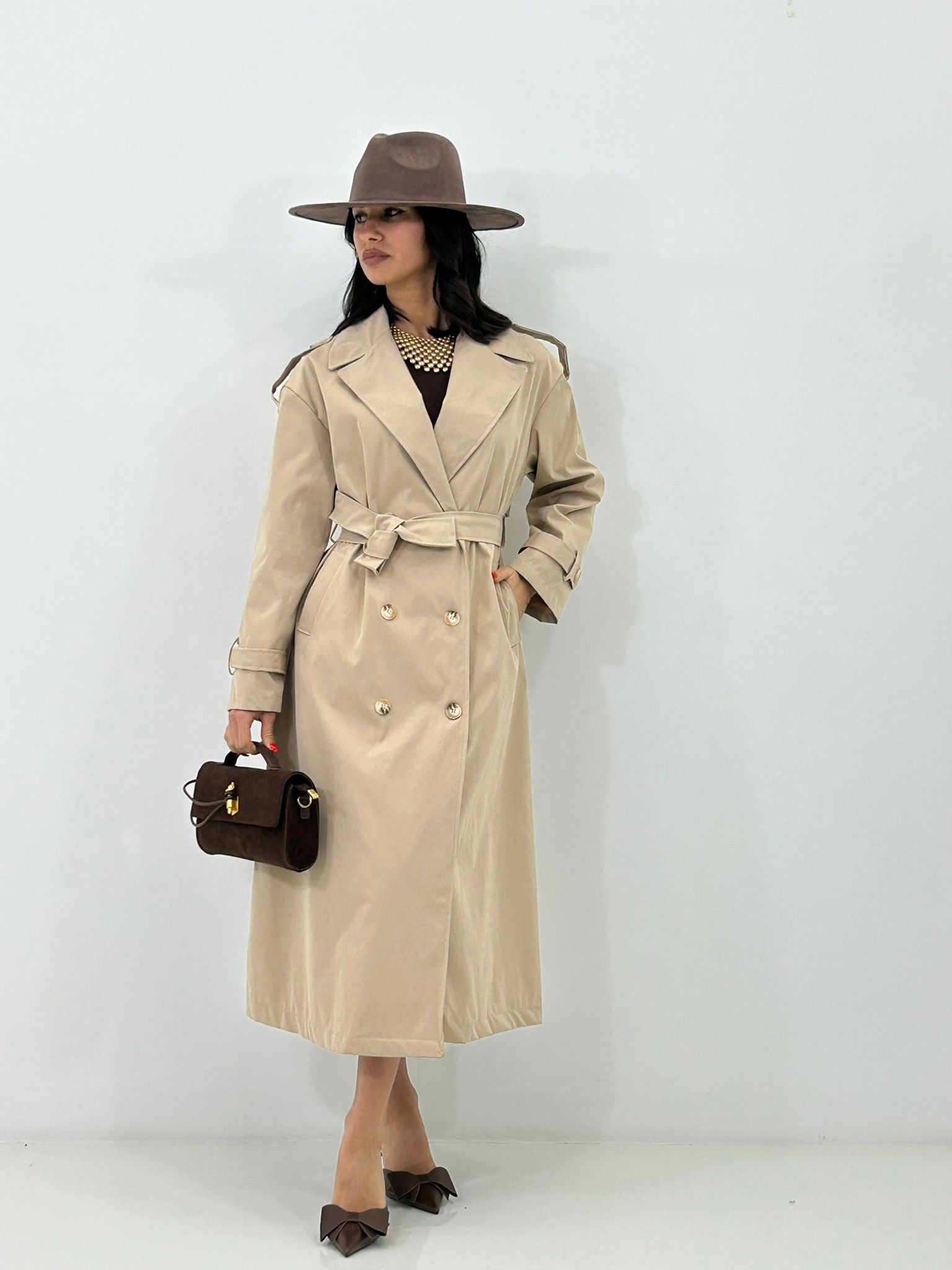 Trench lungo doppio petto con tasche e cintura