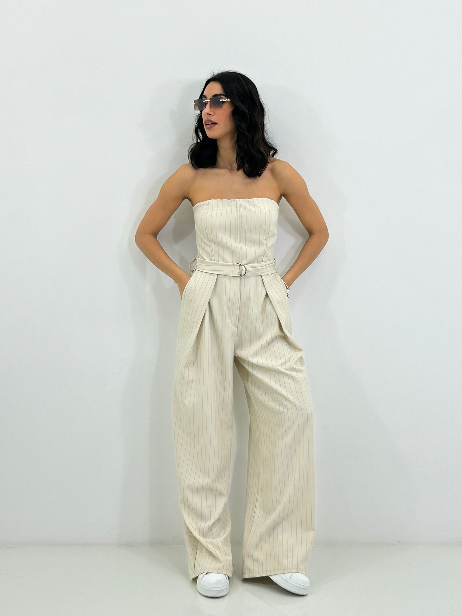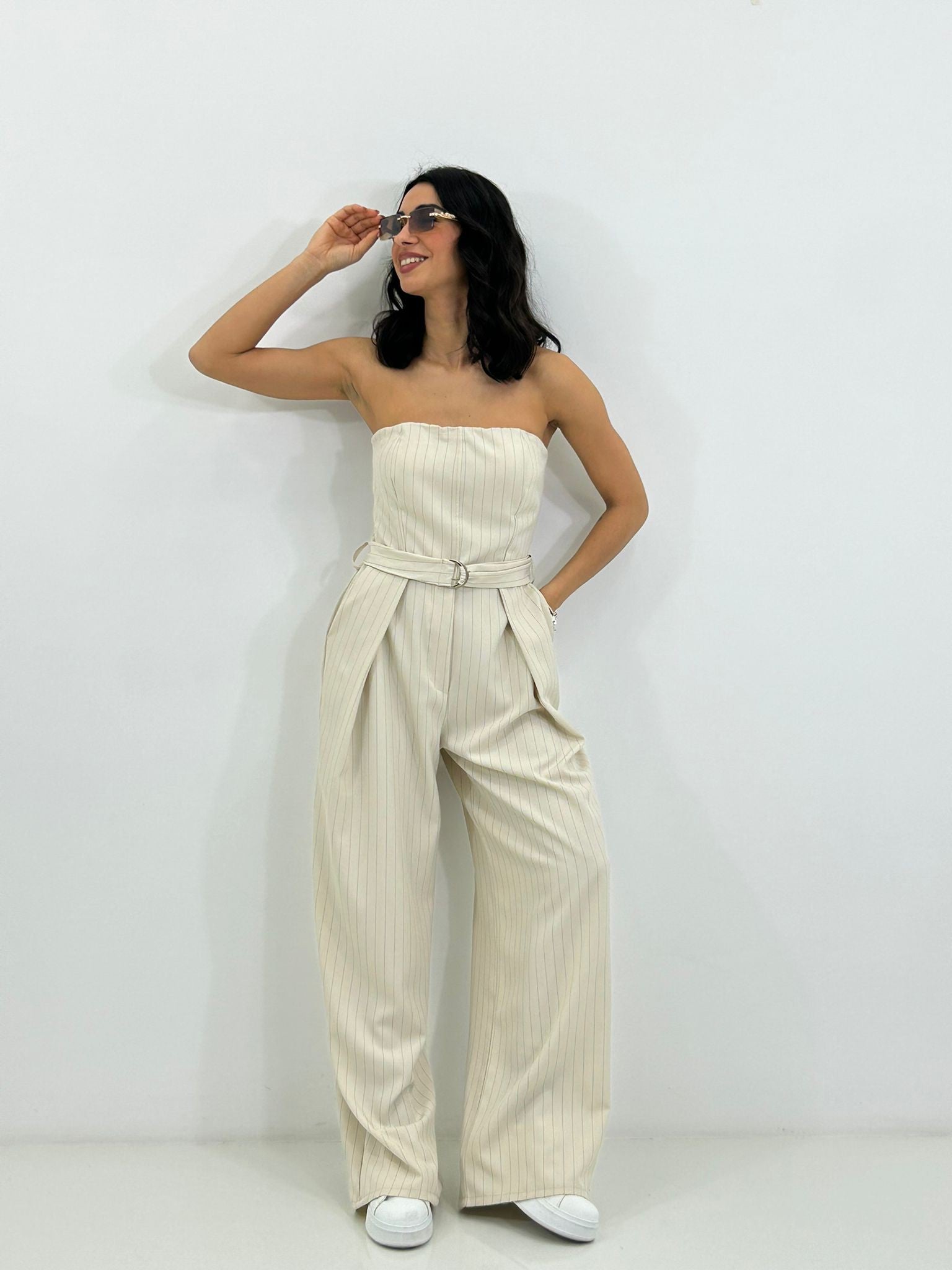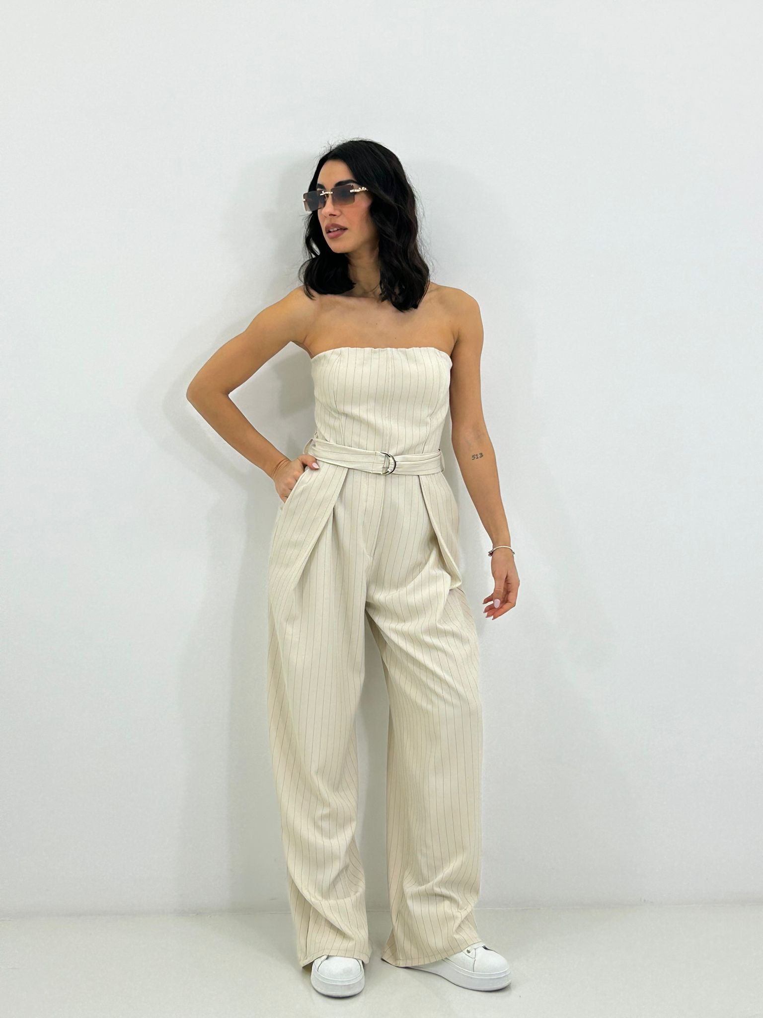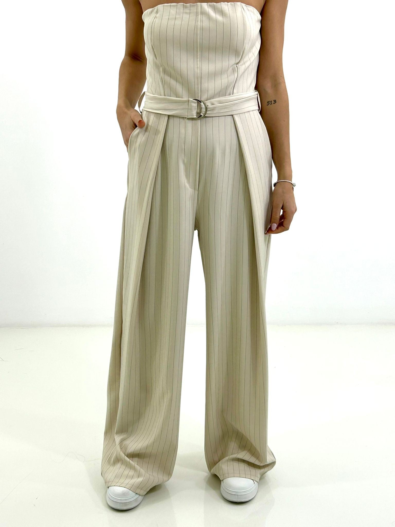 Tuta fascia intera gessata ,con cintura,coppe al seno , fascia elastica sul retro e tasche